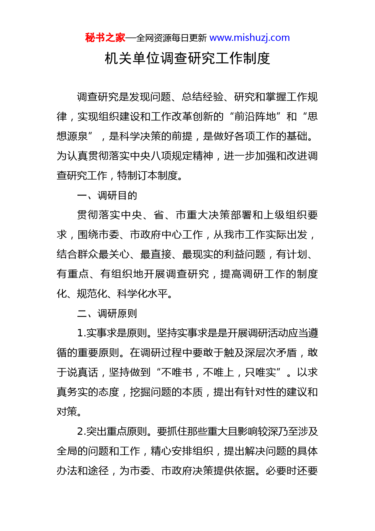 秘书之家—全网资源每日更新www.mishuzj.com机关单位调查研究工作制度调查研究是发现问题、总结经验、研究和掌握工作规律,实现组织建设和工作改革创新的“前沿阵地”和“思想源泉”,是科学决策的前提,是做好各项工作的基础。为认真贯彻落实中央八项规定精神,进一步加强和改进调查研究工作,特制订本制度。一、调研目的贯彻落实中央、省、市重大决策部署和上级组织要求,围绕市委、市政府中心工作,从我市工作实际出发,结合群众最关心、最直接、最现实的利益问题,有计划、有重点、有组织地开展调查研究,提高调研工作的制度化、规范化、科学化水平。二、调研原则1.实事求是原则。坚持实事求是是开展调研活动应当遵循的重要原则。在调研过程中要敢于触及深层次矛盾,敢于说真话,坚持做到“不唯书,不唯上,只唯实”。以求真务实的态度,挖掘问题的本质,提出有针对性的建议和对策。2.突出重点原则。要抓住那些重大且影响较深乃至涉及全局的问题和工作,精心安排组织,提出解决问题的具体办法和途径,为市委、市政府决策提供依据。必要时还要秘书之家—全网资源每日更新www.mishuzj.com对某些重大问题开展跟踪调查,为更好地建言献策做准备。3.问题导向原则。坚持把发现问题、研究问题、解决问题作为开展调研工作的出发点和落脚点,对调研中发现的带有普遍性的问题,进行深入研究,形成对策建议,积极向有关方面反映。4.资源共享原则。整合外部资源,加强同各有关部门、社会各界的联系与配合,开展跨部门、跨领域调研。整合内部资源,统筹协调各部门调研工作,促进调研成果共享共用。5.前瞻性原则。要在坚持党的路线、方针、政策和遵循宪法法律精神的前提下,突破思想障碍和思维定势,对带有苗头性、倾向性的重大问题进行预测性、超前性调研,努力提出一些能够解决问题的新思路和新方法。6.应用性原则。坚持理论联系实际,注重调研成果对工作实践的指导,突出应用性、实用性,力争形成一批选题准确、调研深入、分析透彻、指导性强的调研报告。三、调研内容1.按照年度调研计划开展调研。2.围绕事关工作全局性战略性前瞻性问题开展调研。3.围绕群众关心的重点难点热点问题开展调研。4.围绕全市重点工作部署落实情况开展调研。秘书之家—全网资源每日更新www.mishuzj.com5.围绕基层工作创新实践及其面临的困难和问题开展调研。6.其他专项重点调研。四、调研安排1.集中调研原则上安排在每年年初,由党组(党委)会议围绕重点工作和各部门提交的年度调研课题研究确定,根据调研重点和主题统筹协调时间、地点、人员。调研室负责拟定具体计划并组织实施,行政办公室等相关部门配合。2.原则上把每年第二季度作为调研季,运用实地考察、分类座谈、入户访谈、问卷调查等多种方式开展调研工作,注重了解基层组织和群众意愿、诉求以及对机关工作的意见建议,确保摸得到实情、抓得住第一手材料。3.集中调研由主要领导主持,根据年初计划安排及各位领导分工具体实施。依调研工作内容,组成综合调研组,减轻基层负担,提高工作效率。4.各部门围绕年度重点,结合工作实际自行提出并落实年度调研课题,纳入集中调研课题统一安排。每个部门每年要至少提交一篇有价值、有份量、有针对性的调研报告。加强部门之间的沟通和协作,原则上各部门不同时集中或轮番到一个地区、一条路线调研,避免重复调研、“扎堆调研”。秘书之家—全网资源每日更新www.mishuzj.com五、调研要求1.要增强调研的计划性和针对性。调研应在年初做出计划,纳入工作统筹安排。要深入思考,研究确定调研题目,有针对性解决工作重大现实问题。不搞临时动议,不以常规性工作代替调研。2.要坚持开展全面调研。坚持走出机关、走向基层、走进群众开展深入调研,既要到工作开展好的地方去,也要到边远贫困、工作薄弱的地区去,注重直接到不同层次群众中,与农村、社区基层群众面对面交流,掌握第一手资料和基层的真实情况。3.要积极扩展调研渠道。整合系统资源,加强与其他部门、高等院校、科研机构等的合作,注重利用现代信息网络手段,多渠道、多形式开展调研工作。4.要促进调研成果转化运用。通过向市委报送报告、向“两会”提交建议提案、利用系统内外的报刊网络发布等多种形式,汇报、反映和宣传调研成果,扩大调研成果影响,促进调研成果转化,更好地发挥调研工作在服务科学决策、推动解决问题、指导开展工作等方面的积极作用。对基层创造的好做法好经验、选树的好典型,及时总结提升,大力宣传推广,发挥其示范带动作用。5.要坚决杜绝形式主义。坚决杜绝浮光掠影、蜻蜓点水、走马观花的调研,不走形式,不走过场,不开一般性秘书之家—全网资源每日更新www.mishuzj.com工作汇报会,不泛泛了解情况、听取汇报。6.要坚决遵守调研纪律。严格贯彻遵守中央八项规定精神,到基层调研不参观名胜古迹、风景区,不接受超规格接待,不搞迎来送往,不接受各类纪念品或土特产。班子成员带队到基层调研,原则上随行人员不超过3人。按国家规定的标准交纳各项费用。不允许层层陪同,不增加基层负担。