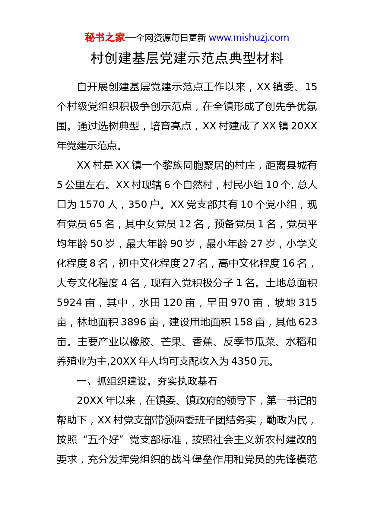 秘书之家—全网资源每日更新www.mishuzj.com村创建基层党建示范点典型材料自开展创建基层党建示范点工作以来,XX镇委、15个村级党组织积极争创示范点,在全镇形成了创先争优氛围。通过选树典型,培育亮点,XX村建成了XX镇20XX年党建示范点。XX村是XX镇一个黎族同胞聚居的村庄,距离县城有5公里左右。XX村现辖6个自然村,村民小组10个,总人口为1570人,350户。XX党支部共有10个党小组,现有党员65名,其中女党员12名,预备党员1名,党员平均年龄50岁,最大年龄90岁,最小年龄27岁,小学文化程度8名,初中文化程度27名,高中文化程度16名,大专文化程度4名,现有入党积极分子1名。土地总面积5924亩,其中,水田120亩,旱田970亩,坡地315亩,林地面积3896亩,建设用地面积158亩,其他623亩。主要产业以橡胶、芒果、香蕉、反季节瓜菜、水稻和养殖业为主,20XX年人均可支配收入为4350元。一、抓组织建设,夯实执政基石20XX年以来,在镇委、镇政府的领导下,第一书记的帮助下,XX村党支部带领两委班子团结务实,勤政为民,按照“五个好”党支部标准,按照社会主义新农村建改的要求,充分发挥党组织的战斗堡垒作用和党员的先锋模范秘书之家—全网资源每日更新www.mishuzj.com作用,不断开拓进取,不断转变观念,各项工作作成绩显著,20XX年各项工作综合评比第三名,并荣获XX镇20XX年度“星级平安村”称号,20XX年作为XX镇党建工作示范点。(一)严抓班子作风建设。积极配合镇委派出的工作组和县委下派的党支部“第一书记”开展班子作风建设工作。一是加强后备干部的培养。针对班子缺乏战斗力的情况,在农村致富能手、大学生“村官”、农民专业合作社负责人等优秀群体中物色培养后备干部,适时选拔进入村级班子,目前已培养出一名致富能手进入村支委。二是积极开展谈话教育活动。针对班子不团结,在镇委书记亲自带队的工作组帮助下,深入个自然村组织村干部进行开展谈心谈话活动,召开民主生活会,深入开展批评和自我批评教育,积极化解矛盾。经过整顿,目前村“两委”组织机构健全,“两委”关系协调,党组织领导核心作用突出,建设了一个坚强、团结,党员和群众拥护的领导班子。(二)加强组织阵地建设。一是统筹资源,由镇委出资,在新建的村文化室门窗安装防盗网,制作完善各项工作制度并上墙,规划了活动场所,改善了村级组织办公设备,恢复村级组织活动场所办公、服务、开展活动等基本功能;二是整治村级组织活动场所周边和村道两旁等村庄秘书之家—全网资源每日更新www.mishuzj.com环境,在镇党委的帮助下,村党支部筹措资金对活动场所进行必要的清理维修,投入资金13.67万元,完成李村委会道路86米的硬化工程和村委会500米围墙的修建工程。严格落实村干部值班制度,做好环境卫生的打扫。达到了活动场所建设完善,满足服务群众、为党员提供服务活动的基本要求;党员干部的思想观念不断转变,主动学习和践行党的群众路线思想的意识不断增强,群众威信不断提高。二、抓产业发展,壮大集体经济充分发挥强核心作用,发挥村第一书记、村支书的核心带头作用的,协调关系,带动班子凝心聚力为群众办实事好事。一是结合本村实际,抓住村农业种植橡胶、瓜菜优势,制定发展规划,挖掘发展潜力,合理利用资源,在镇党委的帮助下,通过争取上级部门政策优惠、技术帮扶、资金扶持等办法,采取有偿服务、合股经营、集体资产承包、资源开发等多种形式,不断壮大村级集体经济的收入。二是及时把握扶持政策。充分利用镇党委在基础设施、农田水利、低保、危房改造、优良品种推广、农业科技培训等方面的扶持政策,获得相关部门的扶持和提供优质服务,目前,种植麻竹30亩,瓜菜种植情况112亩,其中四季豆60亩,本地豆角45亩,葫芦瓜7亩。不断改善农民生活水平和发展环境。秘书之家—全网资源每日更新www.mishuzj.com三、抓惠民工程,凝聚民心民意如何强化党支部的战斗堡垒作用,是新形势下党支部需要解决的核心问题。近年来,XX村党支部以“干实事”为手段,以“聚民心”为目标,取得了良好的效果。(一)加强公益事业建设,促进本村社会事业向前发展。XX村始终发展公益事业作为一项为民办好事实事的工作来抓紧抓落实。一是投入资金54.6万元,完成1队、3队村道390米的硬化工程;二是在县相关单位的帮助下,创建了1个医疗卫生所,使得农村居民的生活卫生保障问题得到良好的改善;三是民房改造整村推进的工作,并配套36个沼气池。四是争取到国家资金创建四、五组的整村推进文明生态村,要对整个村庄进行重新规划创建,包括住房的改造、村道水泥路、路灯、养猪栏、种植花草树木等进行美绿化村庄。得到了村民群众的一致赞同和积极配合,推动各项工作的有利开展。(二)加强服务困难群众,促进本村和谐发展。一是积极发动群众参与新型农村合作医疗工作。20XX年,新型农村合作医疗参合率已达89%,进一步缓解了农民看病难、看病贵的问题。二是积极落实惠民政策,目前,已发放扶贫鱼苗14万尾、扶贫鸡苗300只、鹅400只、水泥34吨、花梨木2000株;20XX年已解决新增低保5户,秘书之家—全网资源每日更新www.mishuzj.com解决危房改造指标7个。四、完善各项制度,促进工作规范化一是建立和完善以“三会一课”制度、民主评议支部制度、党员岗位责任制度等为主要内容的党员教育管理制度。二是落实