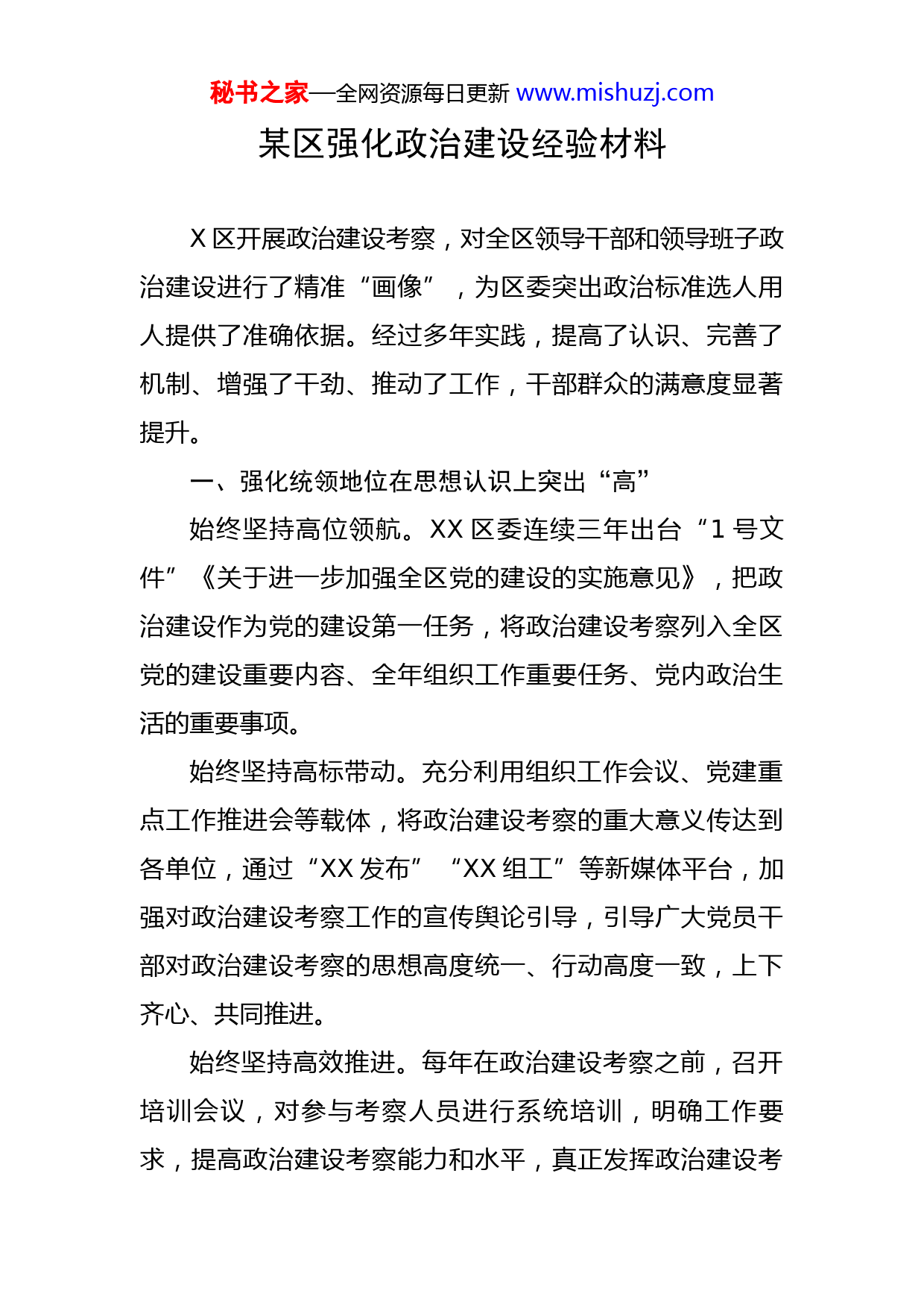秘书之家—全网资源每日更新www.mishuzj.com某区强化政治建设经验材料X区开展政治建设考察,对全区领导干部和领导班子政治建设进行了精准“画像”,为区委突出政治标准选人用人提供了准确依据。经过多年实践,提高了认识、完善了机制、增强了干劲、推动了工作,干部群众的满意度显著提升。一、强化统领地位在思想认识上突出“高”始终坚持高位领航。XX区委连续三年出台“1号文件”《关于进一步加强全区党的建设的实施意见》,把政治建设作为党的建设第一任务,将政治建设考察列入全区党的建设重要内容、全年组织工作重要任务、党内政治生活的重要事项。始终坚持高标带动。充分利用组织工作会议、党建重点工作推进会等载体,将政治建设考察的重大意义传达到各单位,通过“XX发布”“XX组工”等新媒体平台,加强对政治建设考察工作的宣传舆论引导,引导广大党员干部对政治建设考察的思想高度统一、行动高度一致,上下齐心、共同推进。始终坚持高效推进。每年在政治建设考察之前,召开培训会议,对参与考察人员进行系统培训,明确工作要求,提高政治建设考察能力和水平,真正发挥政治建设考秘书之家—全网资源每日更新www.mishuzj.com察的“指挥棒”“硬杠杠”作用。二、强化统揽思维在评判指标上突出“实”将领导班子把握政治方向等7个方面的考察内容、“19个是否”的评价要点和班子成员铸牢政治忠诚“15个是否”的评价要点,实化量化细化,横向上覆盖到基层工作方方面面,纵向上贯穿到区直单位、乡镇街道、村社区,对象上覆盖事业单位干部、选调生、年轻干部、引进人才、村两委干部等。全面统揽,在不同侧面去把握。在落实安排部署、自查自评、实地考察、评价鉴定、分类反馈、整改提高6个步骤基础上,做到了“两注重一延伸”,注重正面表现,事前充分掌握将该单位领导班子取得成绩和班子成员获得的荣誉、分管工作取得的成绩,做到“提人知情、提情知人”。全局统揽,在实际工作去评判。根据政治建设的内容和要求,结合考核对象的工作性质、职务层次,对原则性的标准进行具体化。全线统揽,在重大考验中去识别。注重对领导干部“活”情况的跟踪关注,把党员干部在完成急难险重任务、处理复杂问题、应对重大考验中的表现作为政治建设考察的“活”素材,全面、动态地了解识别干部。疫情防控期间,把疫情防控一线作为淬炼干部、检验干部、识别秘书之家—全网资源每日更新www.mishuzj.com干部、关怀干部的“主战场”,由部领导带队,采取“四不两直”的方式,分四个小组到16个乡镇街道、27个相关区直单位调研,找干部谈心谈话,激励担当作为。三、强化统筹结合在考核方式上突出“准”既“听其言”,也“观其行”。“听其言”,即充分运用好谈话了解这个关键环节,听下级对上级的评价,听上级对下级的评价,听干部个人的自我评价。在实践中,更加注重“观其行”,对其谈到的内容,通过延伸考察视角,采取现场察看、走访以及有重点的选择一些反映干部工作业绩的地方或项目、工程等有针对性地进行实地考察或微服私访。既“看一时”,也“重一贯”。全面准确地识别一名干部,仅靠一两件事、一两次接触或年度考核是远远不够的,政治建设考察必须把功夫下在平时,抓在经常、融入日常,通过经常看、长久看,才能做到对干部知根知底、知长知短。既定性分析,也定量考核。定性考察是政治建设考察重要方式,可以较好地考察、评价、判定干部的本质和主流。同时,要更好地判断干部的素质优劣、水平高低、实绩大小,则需要在定性考察的基础上进行定量考察。四、强化统一研判在结果运用上突出“效”传导责任强教育。利用政治建设考察契机,把政治建秘书之家—全网资源每日更新www.mishuzj.com设考察的重要作用说清楚,提高对政治建设的认识,推动各级党委(党组)自觉扛起政治建设的重要责任,把政治标准转化为看得见的具体任务,覆盖到党的建设各个领域,体现在对各级党组织和全体党员的教育、管理、监督之中。精准识人严把关。把政治建设结果作为选人用人的重要依据,鲜明树立以政治标准识人选人用人导向,建立党政领导班子运行情况“一本账”以及领导干部的正面清单和负面清单“两本清单”,实现对领导班子及班子成员的精准“画像”,为区委选人用人提供了实实在在的依据。正向激励增干劲。把政治建设考察作为激励干部、关心干部的重要举措,在充分掌握基层干部所思所盼所忧基础上,全面落实省委“1+5”文件精神,出台《XX区干部正向激励机制改革试点实施细则》,建立基层干部政治激励机制,建立起精神引领、政治激励、待遇保障、情感关怀“四位一体”正向激励体系。
