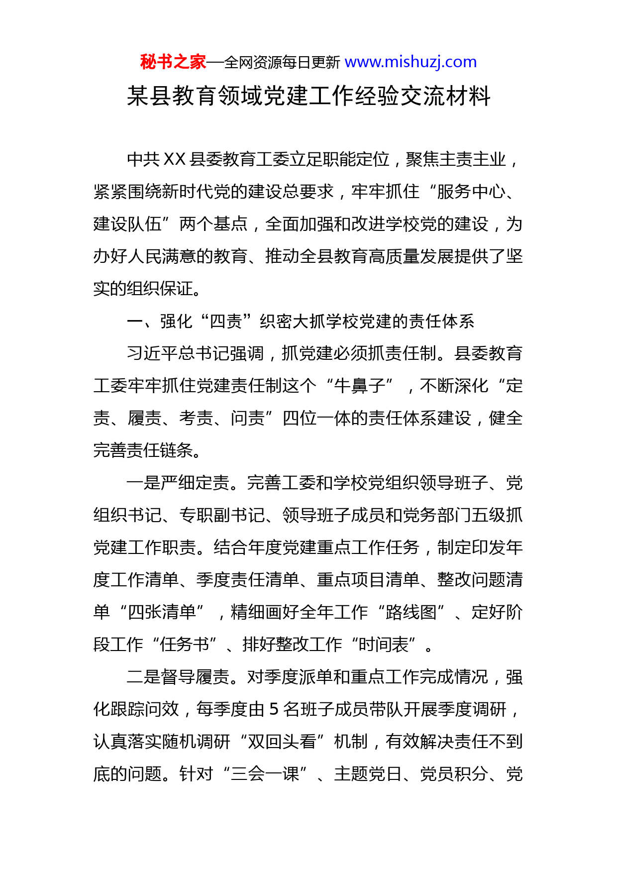 秘书之家—全网资源每日更新www.mishuzj.com某县教育领域党建工作经验交流材料中共XX县委教育工委立足职能定位,聚焦主责主业,紧紧围绕新时代党的建设总要求,牢牢抓住“服务中心、建设队伍”两个基点,全面加强和改进学校党的建设,为办好人民满意的教育、推动全县教育高质量发展提供了坚实的组织保证。一、强化“四责”织密大抓学校党建的责任体系习近平总书记强调,抓党建必须抓责任制。县委教育工委牢牢抓住党建责任制这个“牛鼻子”,不断深化“定责、履责、考责、问责”四位一体的责任体系建设,健全完善责任链条。一是严细定责。完善工委和学校党组织领导班子、党组织书记、专职副书记、领导班子成员和党务部门五级抓党建工作职责。结合年度党建重点工作任务,制定印发年度工作清单、季度责任清单、重点项目清单、整改问题清单“四张清单”,精细画好全年工作“路线图”、定好阶段工作“任务书”、排好整改工作“时间表”。二是督导履责。对季度派单和重点工作完成情况,强化跟踪问效,每季度由5名班子成员带队开展季度调研,认真落实随机调研“双回头看”机制,有效解决责任不到底的问题。针对“三会一课”、主题党日、党员积分、党秘书之家—全网资源每日更新www.mishuzj.com费收缴等常规工作,充分发挥网上党支部“考核评价系统”探头作用,安排专人定期不定期分析调度,有效解决组织生活不落实的问题。三是述职考责。扎实开展党组织书记抓党建述职评议,对学校党组织书记抓党建考核评价操作流程进行修订,把考核结果纳入校(园)长履职考核综合绩效,强化考核结果应用,进一步压实党建责任,确保党建工作抓得住、推得动、落得实。四是严肃问责。建立健全工作失职失责倒查机制,对抓党建工作责任落实不到位、工作不力的进行约谈,对考核不称职的书记、副书记及时进行调整,鲜明树立让有为者有位、让实干者实惠的工作导向,推动学校党建工作从“宽松软”走向“严实硬”。二、强化“四配”构建大抓学校党建的保障体系一是配优党组织班子队伍。坚持每年6月全覆盖开展党组织班子建设分析研判,做到委员出缺及时补选、书记空缺及时调配。对党组织班子配备,推行党组织与行政领导班子成员“双向进入、交叉任职”,注重选拔党性强、懂教育、会管理、有威信、善于做思想政治工作的优秀党务干部担任党组织书记。同时,实行“一校一专”,党员30人以上的学校设立专职副书记,建强“头雁”队伍,形成“头雁效应”。秘书之家—全网资源每日更新www.mishuzj.com二是配强党组织业务专干。在工委层面和11个乡镇中心学校、16所县直学校(园)成立党建办,按照政治强、业务精、作风好的标准选优配强专(兼)职党务工作人员,着力解决党务工作没人干的问题。采取“走出去”与“请进来”相结合策略,本着缺什么、补什么的原则,逐年加大党务工作者培训力度,着力解决党务工作不会干的问题。将党务工作岗位作为干部培养选拔的重要平台,提拔任用校(园)级领导和中层干部,同等条件下优先从是党员并具有党务工作经历和党务工作岗位锻炼的人员中考察任用,激发广大党务工作者抓党建促发展的工作积极性,着力解决党务工作不愿干的问题。三是配够党组织工作经费。将党建工作经费纳入学校年度经费预算安排,足额配够学校党建工作经费。同时,制定《XX县教育系统留存党费划拨、使用和管理实施细则》,按照上年度上缴党费留存部分的50%划拨返还学校党组织,让党组织推动工作、开展活动有钱办事。四是配好党组织活动阵地。坚持“一室多用”原则,按照“设施配套好、活动开展好、学习氛围好、管理规范好、作用发挥好”的“五好”的标准,筹措资金打造升级学校会议室、图书室、多媒体报告厅等场所,建立“党群活动室”,使之成为党员思想教育的阵地、政治学习的场所、传授知识的课堂、宣传办学特色的窗口。秘书之家—全网资源每日更新www.mishuzj.com三、强化“四抓”夯实大抓学校党建的组织体系一是抓组织覆盖。坚持开展组织设置“一年一排查”,按照应建尽建和学校党组织一般按年级、学科、教研组等实体设置的要求,不断调整优化党组织设置,确保学校建到哪里、教育工作部署到哪里,党的建设就跟进到哪里。目前,共有党委6个,党总支12个,党支部162个,全县学校党的组织和党的工作实现了全覆盖,党组织设置实现了从“大联合”向“小联合”转变、“小联合”向独立建制转变。二是抓理论武装。聚焦新时代中国特色社会主义思想、党的十九大和十九届历次全会精神、习近平总书记关于教育的重要论述等主题主线,扎实推进“百名讲师上讲台”“千堂党课下基层”“万名党员进党校”,积极构建“第一议题”会议学、主题党日集中学、分层培训讲授学、网络课堂随时学、知识竞赛督促学、教育基地实践学“六学模式”,有效解决党员教育不经常的问题。三是抓发展党员。在培养机制上,制定“双培养”工作方案,落实“五个优先”,优先发展校级中层以上干部、优先发展35岁以下青年骨干教师、优先发展思政课教师、优先发展少数民族优秀教师、优先在党员力量薄弱的学校发展。针对民办幼儿园规模小、聘请人员流动性大的实际,优先发展法人或举办者。在程序审批上,遵循教师秘书