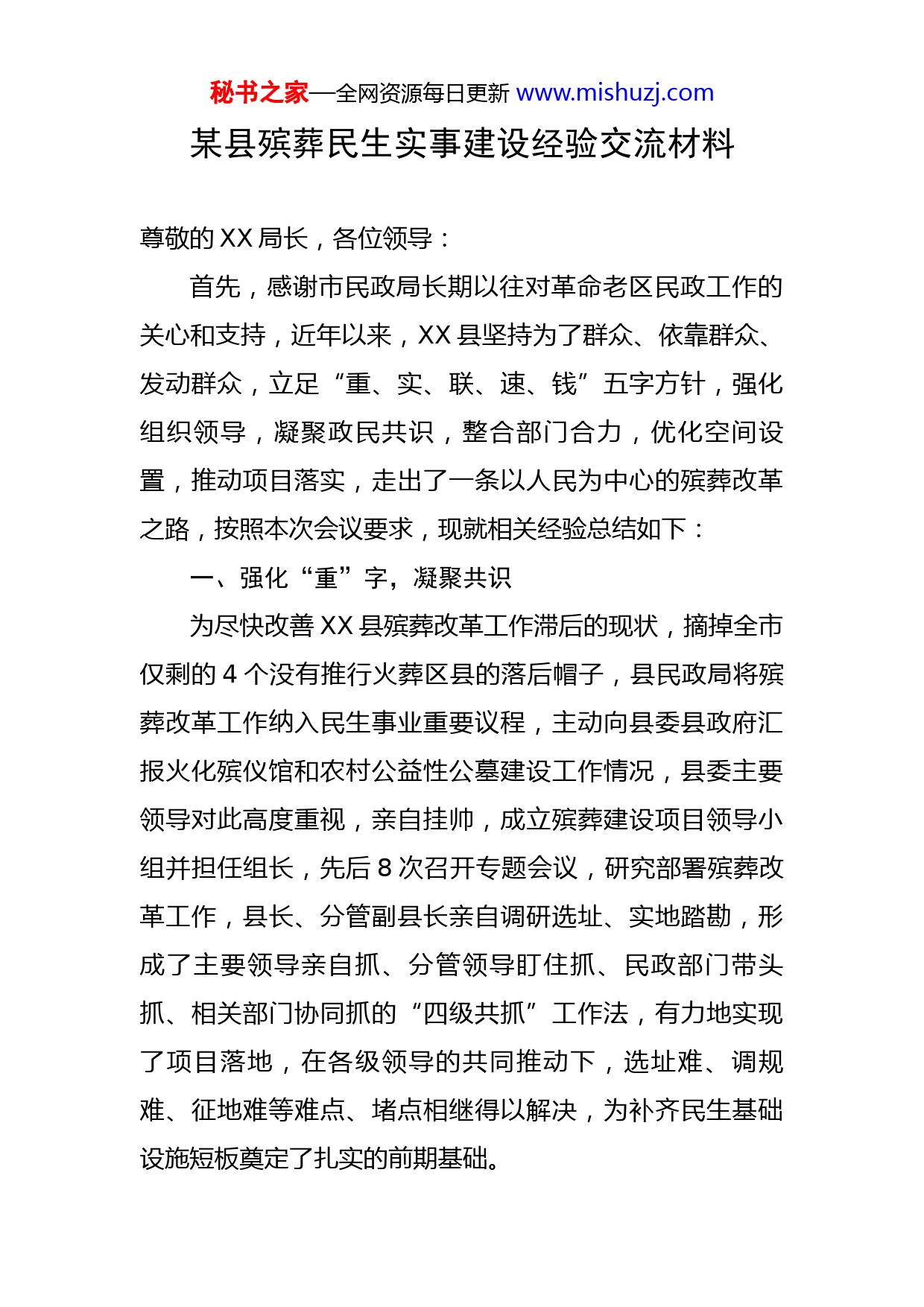 秘书之家—全网资源每日更新www.mishuzj.com某县殡葬民生实事建设经验交流材料尊敬的XX局长,各位领导:首先,感谢市民政局长期以往对革命老区民政工作的关心和支持,近年以来,XX县坚持为了群众、依靠群众、发动群众,立足“重、实、联、速、钱”五字方针,强化组织领导,凝聚政民共识,整合部门合力,优化空间设置,推动项目落实,走出了一条以人民为中心的殡葬改革之路,按照本次会议要求,现就相关经验总结如下:一、强化“重”字,凝聚共识为尽快改善XX县殡葬改革工作滞后的现状,摘掉全市仅剩的4个没有推行火葬区县的落后帽子,县民政局将殡葬改革工作纳入民生事业重要议程,主动向县委县政府汇报火化殡仪馆和农村公益性公墓建设工作情况,县委主要领导对此高度重视,亲自挂帅,成立殡葬建设项目领导小组并担任组长,先后8次召开专题会议,研究部署殡葬改革工作,县长、分管副县长亲自调研选址、实地踏勘,形成了主要领导亲自抓、分管领导盯住抓、民政部门带头抓、相关部门协同抓的“四级共抓”工作法,有力地实现了项目落地,在各级领导的共同推动下,选址难、调规难、征地难等难点、堵点相继得以解决,为补齐民生基础设施短板奠定了扎实的前期基础。秘书之家—全网资源每日更新www.mishuzj.com二、突出“实”字,科学选址XX县突出以人为本的基本理念,以满足人民群众的殡葬需求为导向,紧紧围绕“群众认可、服务大局、长远规划”的建设目标,综合考虑交通、周边环境、历史人文等多重因素,聘请专业机构,科学选址规划。期间,先后因群众不认可、高速公路过境等原因放弃葛城街道东方红二村、鸡鸣乡寒溪沟等选址,积极吸取当前殡仪馆及公墓地“人在山脚、坟在山上、推窗见坟、抬头见墓、山上是坟,坟边是城”的经验教训,主要邀请全国各地殡葬服务领先企业专家到实地论证,在公路基础设施不完善的情况下,用脚步丈量选址,最终将距离县城9公里的高燕镇星光村确定为XX县火化殡仪馆及公墓的建设地址,该选址既满足市县殡葬设施建设用地要求,又符合群众对人文风俗的心理预期,建成以后,将保障县内群众100年的殡葬需求。三、练好“联”字,协调推动殡葬工作事关逝者尊严、生者安慰,连着群众的福祉和社会的和谐稳定。火化殡仪馆和农村公益性公墓的建设是殡葬改革的重要组成部分,全县上下同心,各部门练好“联”字诀,分别从舆论引导、立项审批、争取资金、用地调规、规划审核等业务领域入手,拧紧一根绳、心往一处想、劲往一处使,真正做到了“分工不分家”,在政民秘书之家—全网资源每日更新www.mishuzj.com连心,部门联动的共同努力下,顺利完成XX县火化殡仪馆项目建设的规划、选址、用地调规、概预算等各项工作,形成了“多点发力、多管齐下、多措并举”的“三多联动机制”。四、立足“速”字,加速推进作为“十三五”时期的欠账,XX县知耻后勇,科学规划,协调推进,力争用2年时间跑出革命老区的“加速度”。在火化殡仪馆建设项目方面,就土地调规、征地难等实际困难,利用市发改委集团对口帮扶的优势,主动同市规自局、市林业局、市发改委等市级部门衔接,完成了火化殡仪馆用地手续,该项目预计2024年底完成主体建设工作,2025年投入运营。在农村公益性公墓方面,XX县本着“专业人做专业事”的理念,聘请重庆大学规划设计院对农村公益性公墓选址进行规划,截止目前,已将23个乡镇的选址纳入同级国土空间基础信息平台,叠加到国土空间规划“一张图”上。2023年年底前,预计将启动两个农村公益性公墓建设,2025年年底前,预计将完成所有乡镇农村公益性公墓的建设任务。五、解决“钱”字,争取资金XX县作为曾经的渝东北深度贫困县,虽然在经历脱贫攻坚后,实现了整体脱贫,但由于历史欠账大,经济社会发展不充分,县级财政仍然十分薄弱,面对殡葬项目建设秘书之家—全网资源每日更新www.mishuzj.com的巨大缺口,老区政府并未退缩,而是利用脱贫攻坚、乡村振兴以来积攒的各级帮扶资源,主动向中央、市及对口帮扶集团争取资金支持,2021年、2022年,XX县通过多方努力,争取到中央专项资金和市级配套资金共计3250万元,为殡葬项目主体工程建设提供了有力的资金保障,2023年以来,XX县正在与积极协调申请地方政府专项债券资金和市级福彩资金,用于殡葬民生实事项目建设,只为群众更加满意,移风易俗更为深入。下一步,XX县将继续聚焦群众需求,坚持以党的二十大精神为指导,围绕县域经济发展”三县一城一枢纽“主题,牢固树立以人民为中心的发展理念,为加速推动殡葬事业健康发展用情、用心、用力!我的发言完毕!不妥之处,欢迎各位领导批评指正,谢谢大家!