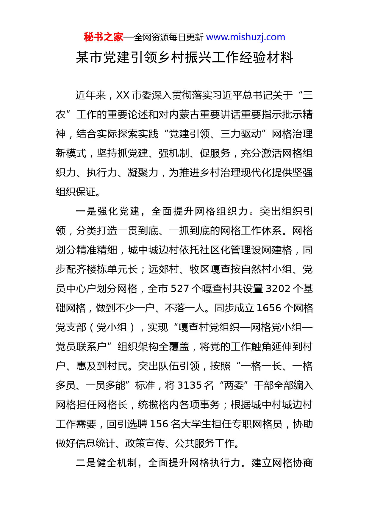 秘书之家—全网资源每日更新www.mishuzj.com某市党建引领乡村振兴工作经验材料近年来,XX市委深入贯彻落实习近平总书记关于“三农”工作的重要论述和对内蒙古重要讲话重要指示批示精神,结合实际探索实践“党建引领、三力驱动”网格治理新模式,坚持抓党建、强机制、促服务,充分激活网格组织力、执行力、凝聚力,为推进乡村治理现代化提供坚强组织保证。一是强化党建,全面提升网格组织力。突出组织引领,分类打造一贯到底、一抓到底的网格工作体系。网格划分精准精细,城中城边村依托社区化管理设网建格,同步配齐楼栋单元长;远郊村、牧区嘎查按自然村小组、党员中心户划分网格,全市527个嘎查村共设置3202个基础网格,做到不少一户、不落一人。同步成立1656个网格党支部(党小组),实现“嘎查村党组织—网格党小组—党员联系户”组织架构全覆盖,将党的工作触角延伸到村户、惠及到村民。突出队伍引领,按照“一格一长、一格多员、一员多能”标准,将3135名“两委”干部全部编入网格担任网格长,统揽格内各项事务;根据城中村城边村工作需要,回引选聘156名大学生担任专职网格员,协助做好信息统计、政策宣传、公共服务工作。二是健全机制,全面提升网格执行力。建立网格协商秘书之家—全网资源每日更新www.mishuzj.com机制,探索民主管理与网格治理有效融合新途径,试点推行党组织引领网格民主协商“四步工作机制”,推动协商议事向网格下沉,将民情小事采取“集、提、评、定”的步骤在格内协商解决,对涉及村级重大事项或存在争议较大的事项纳入“四议两公开”统筹解决。健全网格运行机制,明确网格党的建设、社会保障、综合治理、应急管理、社会救助等5项管理服务重点事项和网格员的工作职责,完善信息收集、问题上报、分办处理、办结反馈、结果问效全链条运行制度,全面实行格内事务“日走访、周分析、月汇总”。强化网格稳定机制,全面推行网格员联案,“两委”班子成员包案制度,实行“一案多人、访办一体”工作责任制,对基础网格收集到的各类问题,按照轻、重、缓、急梳理、分类,对现场能解决的,当场给予回复;对问题涉及面广,化解难度比较大的,及时向嘎查村党组织或苏木乡镇党委报告,确保问题第一时间发现、第一时间化三是抓实服务,全面提升网格凝聚力。推动包格联户上门办,健全完善嘎查村级组织成员常态长效入户走访群众工作制度,要求书记带头、“两委”包干、“监委”监督,每人每月走访包联网格内村民群众不少于20户,党组织书记至少联系帮扶3户、“两委”其他成员及配套组织负责人每人至少联系帮扶1户,帮助解决1-2个实际困秘书之家—全网资源每日更新www.mishuzj.com难。拓展党群服务定点办,深入推进“党建引领、服务贴心”行动,在100个嘎查村党群服务中心建立“乡村振兴代办点”,根据农牧民需求拓展邮政快递、农产品销售、夕阳食堂等服务,基层党组织阵地、堡垒、家园功能不断增强。做实数字平台网上办,将公共服务全面植入“一微一端”,依托网格组建联系服务党员群众微信群4397个,形成民情有回应、工作有跟进、效果有反馈的工作闭环。在“XX农牧”APP设置“社情民意”专栏,实现了农牧民群众意见建议“一端受理”,农畜产品交易、查询“一卡通”、生活缴费便民服务“一端办结”,切实以数字赋能助力精细服务提档升级。