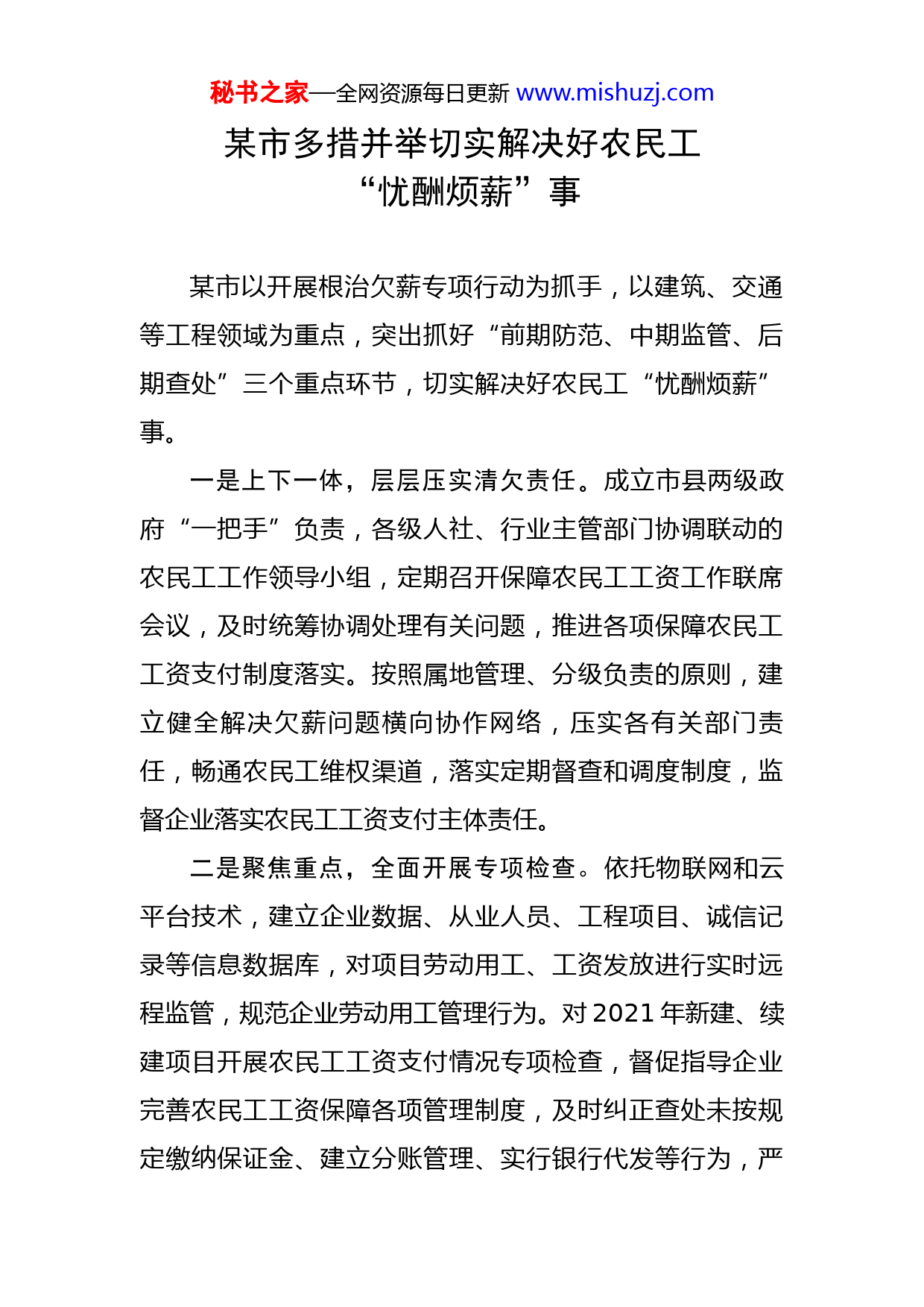 秘书之家—全网资源每日更新www.mishuzj.com某市多措并举切实解决好农民工“忧酬烦薪”事某市以开展根治欠薪专项行动为抓手,以建筑、交通等工程领域为重点,突出抓好“前期防范、中期监管、后期查处”三个重点环节,切实解决好农民工“忧酬烦薪”事。一是上下一体,层层压实清欠责任。成立市县两级政府“一把手”负责,各级人社、行业主管部门协调联动的农民工工作领导小组,定期召开保障农民工工资工作联席会议,及时统筹协调处理有关问题,推进各项保障农民工工资支付制度落实。按照属地管理、分级负责的原则,建立健全解决欠薪问题横向协作网络,压实各有关部门责任,畅通农民工维权渠道,落实定期督查和调度制度,监督企业落实农民工工资支付主体责任。二是聚焦重点,全面开展专项检查。依托物联网和云平台技术,建立企业数据、从业人员、工程项目、诚信记录等信息数据库,对项目劳动用工、工资发放进行实时远程监管,规范企业劳动用工管理行为。对2021年新建、续建项目开展农民工工资支付情况专项检查,督促指导企业完善农民工工资保障各项管理制度,及时纠正查处未按规定缴纳保证金、建立分账管理、实行银行代发等行为,严秘书之家—全网资源每日更新www.mishuzj.com厉打击违法发包、转包、违法分包、资质挂靠等行为。年内共检查全市在建工程项目XX项次,下发限期整改通知书XX份,停工通知书XX份,累计查处未批先建项目XX个、违法发包案件XX起、违法转包案件XX起、资质挂靠案件XX起、移交立案查处项目XX个。三是治欠保支,强化农民工工资保障。建立健全讨薪举报投诉案件联动处理机制,实现农民工工资拖欠的投诉、信访案件“100%受理、100%处理、100%反馈”。加大拖欠农民工工资突出问题整治力度,坚持有诉必查、有欠必追机制,受理劳动维权投诉举报线索XX件,涉及XXXX人XX万元,已办结XX件,清欠XXXX人XX万元,法定期限内结案率100%,切实推动解决农民工工资拖欠问题。全面推行“工资保证金、实名制管理、劳动合同签订、分账制管理”制度,将缴纳农民工工资保证金作为企业办理施工许可前置条件,进一步提高企业缴纳保证金意识。年内市区建设项目收缴农民工工资保证X万元,缴纳率100%,农民工劳动合同签订率100%,实名制管理率100%,建设项目分账管理率100%。加强线上支付结算,全市XXX个规模以上新建项目全部创建“智慧工地”,通过线上代发农民工工资X万元,涉及XXX人次。四是建档立信,释放“零容忍”信号。建立诚信机制和企业诚信档案,将劳动用工、工资支付情况作为企业诚秘书之家—全网资源每日更新www.mishuzj.com信评价重要依据,全面摸排市区XXX个在建项目农民工工资支付情况,按照无欠薪、一般欠薪、严重欠薪三个等级动态监管,全程跟踪,对存在欠薪隐患的用人单位先约谈限期、再诚信处罚,释放“零容忍”信号,其中XXX家施工单位在限期内拒不整改,被记录到诚信档案,同时推送全国诚信信息平台,让欠薪企业“一处违法、处处受限”,提高企业违法失信成本。