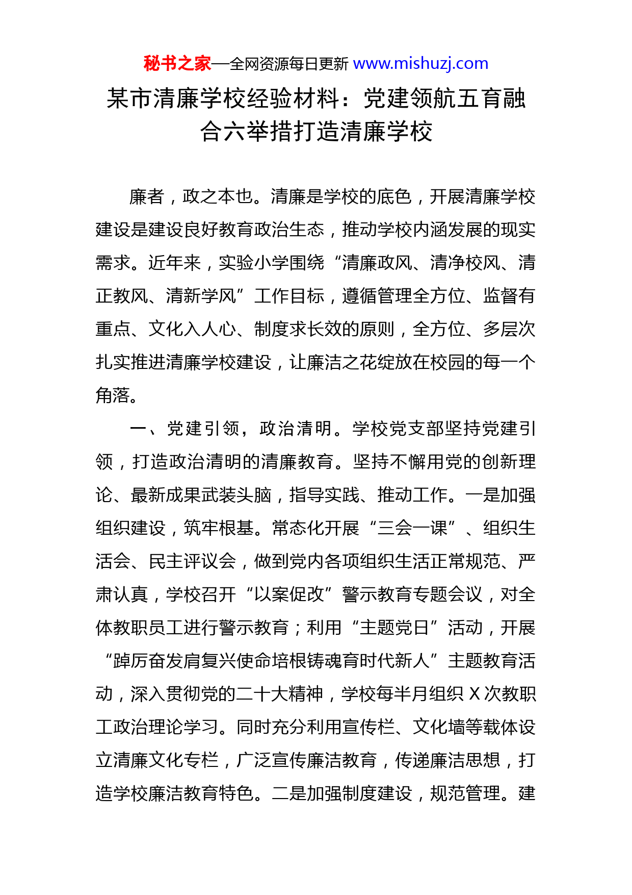 秘书之家—全网资源每日更新www.mishuzj.com某市清廉学校经验材料:党建领航五育融合六举措打造清廉学校廉者,政之本也。清廉是学校的底色,开展清廉学校建设是建设良好教育政治生态,推动学校内涵发展的现实需求。近年来,实验小学围绕“清廉政风、清净校风、清正教风、清新学风”工作目标,遵循管理全方位、监督有重点、文化入人心、制度求长效的原则,全方位、多层次扎实推进清廉学校建设,让廉洁之花绽放在校园的每一个角落。一、党建引领,政治清明。学校党支部坚持党建引领,打造政治清明的清廉教育。坚持不懈用党的创新理论、最新成果武装头脑,指导实践、推动工作。一是加强组织建设,筑牢根基。常态化开展“三会一课”、组织生活会、民主评议会,做到党内各项组织生活正常规范、严肃认真,学校召开“以案促改”警示教育专题会议,对全体教职员工进行警示教育;利用“主题党日”活动,开展“踔厉奋发肩复兴使命培根铸魂育时代新人”主题教育活动,深入贯彻党的二十大精神,学校每半月组织X次教职工政治理论学习。同时充分利用宣传栏、文化墙等载体设立清廉文化专栏,广泛宣传廉洁教育,传递廉洁思想,打造学校廉洁教育特色。二是加强制度建设,规范管理。建秘书之家—全网资源每日更新www.mishuzj.com立健全“三重一大”事务决策、绩效考核、内控管理、职称评聘等制度,梳理编制各部门及党员干部廉政风险防控措施,营造学校清净校风。落实党风廉政建设主体责任,促进学校风清气正。党员干部严格对照“四风”自查自纠,加强廉洁班子建设,增强党员干部执行制度的表率示范作用,带头严格执行制度,自觉维护制度。三是加强纪律建设,强化监督。认真执行党务、校务信息公开制度,自觉接受全校师生员工的监督。学校成立纪检监察处,在校务决策、财务审计、工程建设、重大事项等方面充分发挥监督作用,进一步推进学校管理的科学化、民主化。二、源头治理,行政清廉。加强领导班子建设,落实班子成员“一岗双责”,压实学校党组织全面从严治党主体责任和主要负责人的第一责任。一是夯实主体责任。对照责任清单,建立履责纪实制度,形成职责明晰、履责留痕、考核问责工作机制,推进全面从严治党向基层延伸、向每个支部和党员覆盖。定期召开全面从严治党专题工作会议和党风廉政建设情况专题分析会,及时总结、分析、推进教育系统党风廉政建设和反腐败工作。二是强化思想教育。严格落实“三会一课”、民主生活会、组织生活会、主题党日活动等制度,持续推进“两学一做”学习教育常态化制度化,进一步提高党内政治生活质量。落实党支部书记上清廉党课制度,坚持开展清廉课堂等形式多样秘书之家—全网资源每日更新www.mishuzj.com的教育活动。三是提升治理能力。学校实行集团管理,校校负责;分层管理,层层负责;全员管理,人人负责。学校在职称评定、人事任免、财务审批、绩效考核、招生入学等重大事项实行“三重一大”决策,不搞“一言堂”。三、师德为先,教风清正。学校的发展关键在教师,师德高尚、业务精湛的高素质教师队伍是学校工作的重中之重。一是从严职业准则。深入学习贯彻《中共中央国务院关于深化新时代教师队伍建设改革的意见》,引导广大教师不断加强自身建设,不断提高道德修养、业务素质和教学水平,争做“四有”好老师,深化教师教育改革,从源头抓起,培养教师清廉从教的品质。二是从细教师培训。在教师专业发展培训中增加清廉教育、法治教育内容,全面提高教师依法执教的意识与能力。在全校范围内开展教师职业行为“十不准”全员培训学习,积极组织全体党员教师学习党的十九大、二十大精神,用习近平新时代中国特色社会主义思想武装头脑、指导实践、推动工作。三是从实师德考评。建立健全中小学教师师德建设长效机制,完善师德师风考核机制,将师德师风作为学校对教师使用聘任、评价考核的核心内容,把清廉要求落实到日常教育教学行为中。建立师德考核负面清单、典型案例警示制度和师德师风定期通报制度,筑牢廉洁从教思想防线,开展“最美教师”评选表彰活动,教师们通过重温从秘书之家—全网资源每日更新www.mishuzj.com教历程、发表获奖感言、朗诵师德故事,让廉洁的种子在心中生根发芽,持续营造风清气正的校园生态和育人环境。四是从细源头防范。注重抓早抓小抓源头,全面排查梳理廉洁风险点,建立责任清单,做到及时预警,建立阳光招生、教辅征订、廉洁过节等风险防控机制及时校正、及时纠错。四、深化改革,学风清新。课程育人是实施清廉教育的有效途径之一,立足课堂,聚焦发力教学改革,严格落实德育课程、把清廉文化教育融入教育教学全过程。一是抓主题教育。通过国旗下讲话、主题队会、故事会、演讲、绘画、书法、手抄报等形式,将清廉文化建设融入学校发展全过程。二是抓沁润教育。以思政课程为突破口,拓展延伸课程思政内容,结合学科特点,深入挖掘教材中的清廉教育元素,强化思政育人功能;学校组织编写了《社会主义核心价值观读本》、《社会主义核心价值观童谣》等校本教材,丰富清廉教育内涵。三是抓融合教育。以创新学生评价机制为着力点,开展“七彩智慧少年”评价体系,用传统的“赤、橙、黄、绿、青、蓝、