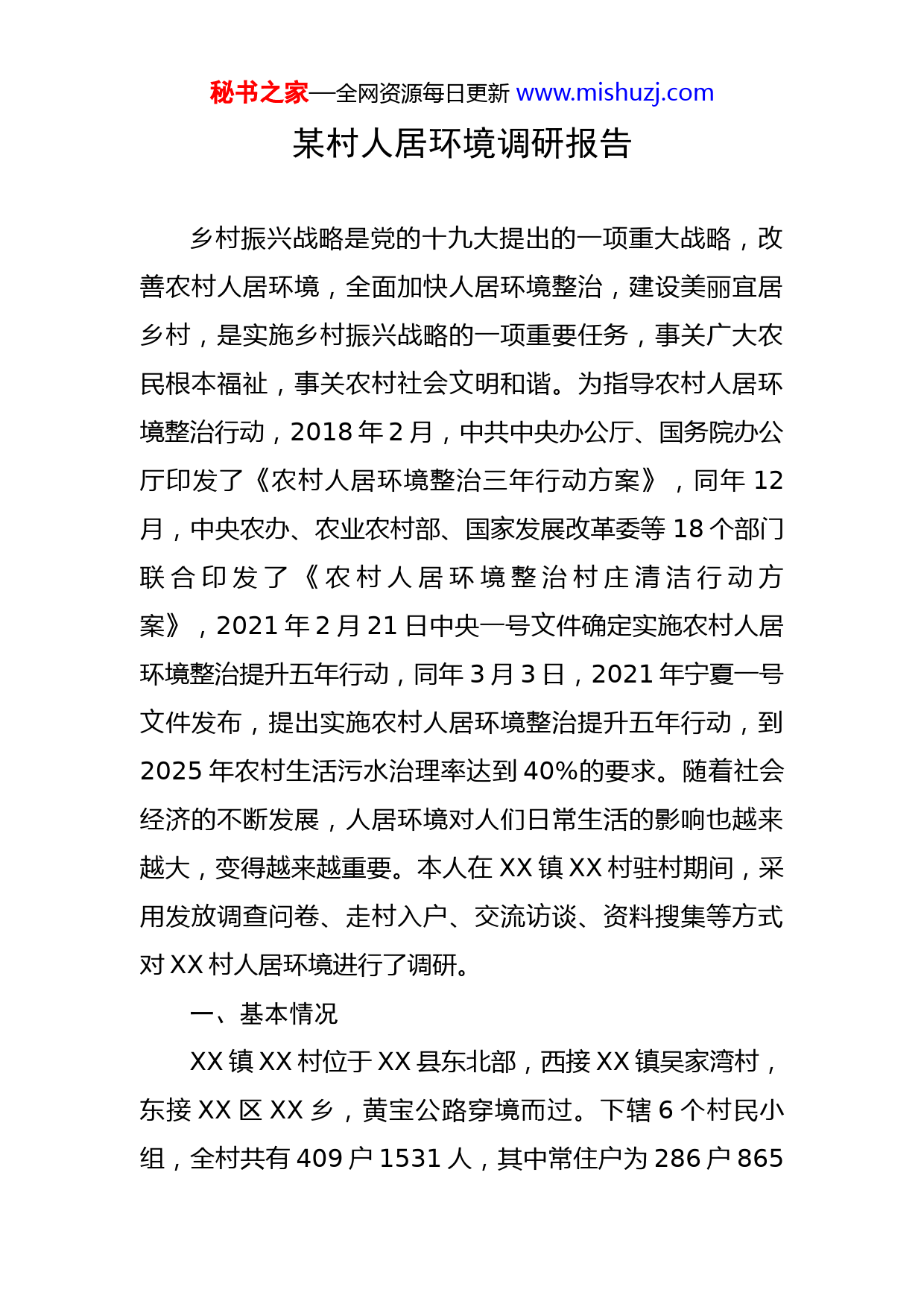 秘书之家—全网资源每日更新www.mishuzj.com某村人居环境调研报告乡村振兴战略是党的十九大提出的一项重大战略,改善农村人居环境,全面加快人居环境整治,建设美丽宜居乡村,是实施乡村振兴战略的一项重要任务,事关广大农民根本福祉,事关农村社会文明和谐。为指导农村人居环境整治行动,2018年2月,中共中央办公厅、国务院办公厅印发了《农村人居环境整治三年行动方案》,同年12月,中央农办、农业农村部、国家发展改革委等18个部门联合印发了《农村人居环境整治村庄清洁行动方案》,2021年2月21日中央一号文件确定实施农村人居环境整治提升五年行动,同年3月3日,2021年宁夏一号文件发布,提出实施农村人居环境整治提升五年行动,到2025年农村生活污水治理率达到40%的要求。随着社会经济的不断发展,人居环境对人们日常生活的影响也越来越大,变得越来越重要。本人在XX镇XX村驻村期间,采用发放调查问卷、走村入户、交流访谈、资料搜集等方式对XX村人居环境进行了调研。一、基本情况XX镇XX村位于XX县东北部,西接XX镇吴家湾村,东接XX区XX乡,黄宝公路穿境而过。下辖6个村民小组,全村共有409户1531人,其中常住户为286户865秘书之家—全网资源每日更新www.mishuzj.com人。全村党员32人,其中女党员13人,60岁以上的党员18人,35岁以下党员5人。XX村是一个不靠城不靠路的回族聚居村,全村确权耕地1697亩,荒地330亩,主要以养殖业为主导产业,全村现有养殖大户58户,小群多户85户,其中千只以上户7户,2个大型养殖园区。2022年村集体净收益12万元。近年来在上级党委、政府的统一规划下村庄绿化大幅提升,新建村委会建筑面积300平米,配有党员活动室、电教室、图书室、妇女之家、儿童之家、新时代文明实践站等,为了给村民提供休闲娱乐的地方,在XX村5、6队建设了约计6000平方米的文娱广场和景观湖一处,全村辖区内有3个室外篮球场,两个文化广场,场内健身设施配备齐全,村主干道路安装路灯80多盏,实现了村庄亮化全覆盖,村内大街小巷硬化路面共计12.6公里,村内基础设施较为完善。在调研走访过程中,村民对于本村人居环境整治提出较多的几条意见是:1、垃圾池太少,扔垃圾不方便;2、生活污水处理不到位;3、村庄建筑布局较乱,影响出行。对改善人居环境提出较多的建议是:1、上级政府多投入、多帮扶;2、加强村边和小巷的垃圾清除工作;3、村内统一规划,多搞绿化。整体来看,大多数村民对本村的人居环境不满意,但都渴望一个干净整洁的居住环境,并且对人居环境整治工作比较支持,也给予了很大期盼。秘书之家—全网资源每日更新www.mishuzj.com二、主要做法人居环境整治工作是农村当前和今后一段时期工作的重中之重,近年来,XX村在上级党委、政府的领导下,积极开展人居环境整治工作,通过制定方案、宣传动员、实行奖罚等措施,有力促进了各项整治任务的落实。(一)精准发力,三大革命“立起来”。一是深入推进农村“厕所革命”。把改厕工作作为改善农民生活环境、改变农村面貌的重要工作。结合实际,坚持群众自愿、经济适用、维护方便、不污染公共水体的要求,坚持速度与质量并重,有力有序推进农村改厕工作落实落细。2019年以来,全村约30%的常住户完成了“改厕”,建设公共卫生厕所2所,对已建成的各类公厕,实行统一管理,强化长效管护,组建公厕兼职保洁队伍,确保正常运转;二是深入推进农村垃圾治理。健全完善“户分类、队收集、村转运、镇处理”垃圾收运处置体系,全面清理各户房前屋后、村巷村道积存垃圾,规范整理柴堆、杂物堆,集中整治村庄周围、道路两侧、公共区域散落垃圾;全面禁止露天堆放秸秆和焚烧垃圾,完善并配备垃圾分类桶等设施;进一步健全村主干道路长效保洁体系,日清运生活垃圾1.5吨,生活垃圾处理率达到95%以上,目前正在XX村北出口建设污水处理厂,建成运行后全村污水将得到有效处理。另一方面,做好河道植被、生态秘书之家—全网资源每日更新www.mishuzj.com护坡、生态蓄水池等水土保持工作,与畜禽污水、农村生活污水治理等工作统筹推进,全面实施河长制,全面消除黑臭水体;三是深入推进危旧土坯房拆除。自农村人居环境整治“攻坚战”打响后,XX村以拆除土坯房、残垣断壁等为突破口,全力开展土坯房“清零”行动,截至目前,全村共计拆除土坯房57户109间,除个别砖土结构附属用房外,土坯房基本实现了“清零”,农村面貌有了很大改善。(二)久久为功,常态长效“抓起来”。一是设置人居环境红黑榜。在集中整治和整治提升的基础上,设置人居环境黑红榜。一方面,将不自觉遵守相关规定,存在污染环境、破坏环境现象的群众纳入到黑名单,在纳入黑名单教育期间,停办其村级相关业务,直至教育结束。另一方面,挖掘保护环境、改善环境的先进典型,并在红榜予以公示,连续荣登红榜的,给予一定物质奖励;二是建立一支专业保洁队伍。配备了村级保洁人员1名,配备垃圾清运电动车1辆,负责清理村内主次干道、公共场所及周边和各农户生活垃圾,做好村域内卫生保洁工作;三是建立一套落实管理制度。成立了由村书记任组长、各包队村干部任副组长、各队长为成员的长效管护领导小组,建立每家每户房前屋后、田间地头的登记台账,同步与各户签订环境保护责任书,明确要求,定期清理。进一步规范各秘书之家—全网资源每