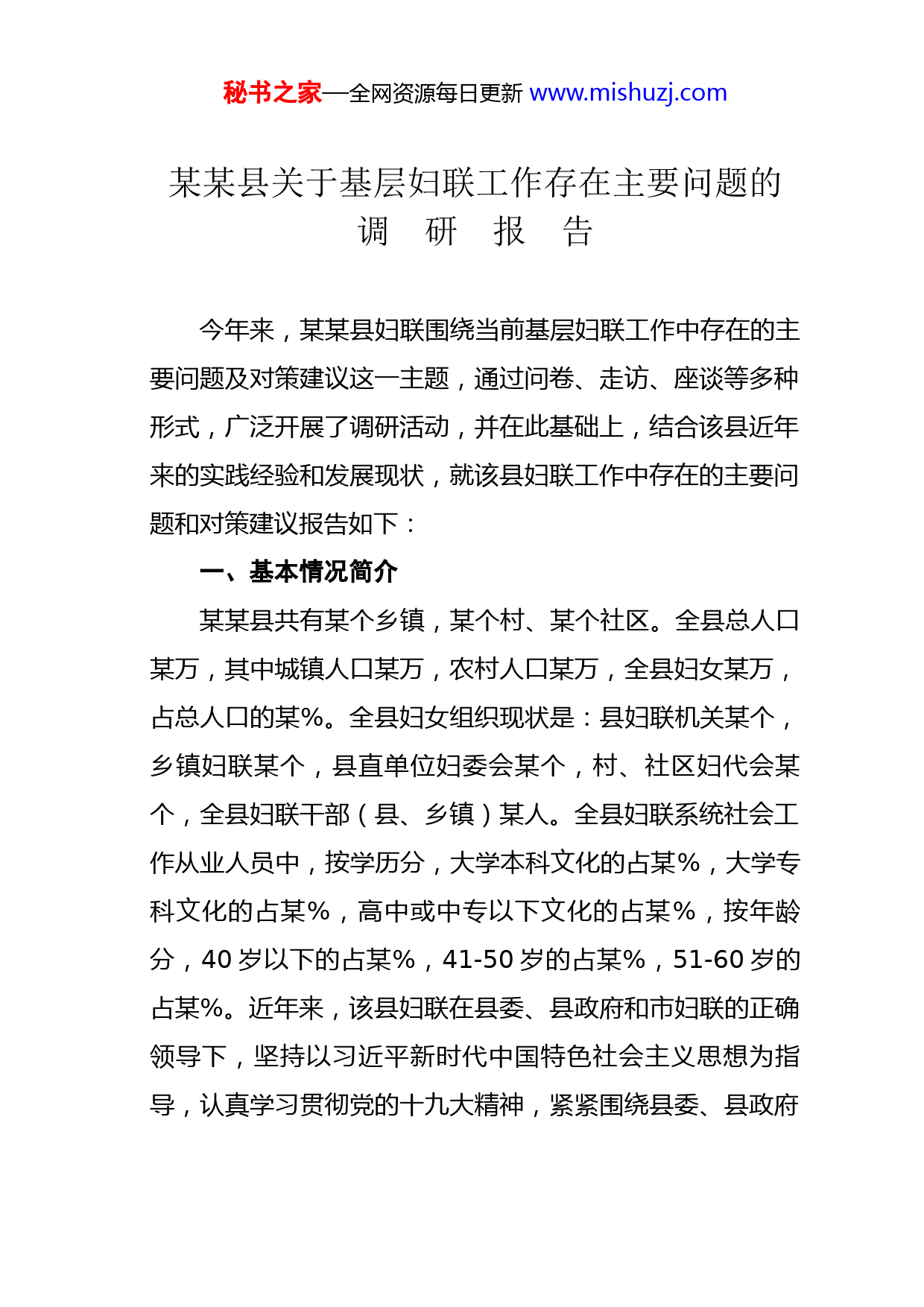 秘书之家—全网资源每日更新www.mishuzj.com某某县关于基层妇联工作存在主要问题的调研报告今年来,某某县妇联围绕当前基层妇联工作中存在的主要问题及对策建议这一主题,通过问卷、走访、座谈等多种形式,广泛开展了调研活动,并在此基础上,结合该县近年来的实践经验和发展现状,就该县妇联工作中存在的主要问题和对策建议报告如下:一、基本情况简介某某县共有某个乡镇,某个村、某个社区。全县总人口某万,其中城镇人口某万,农村人口某万,全县妇女某万,占总人口的某%。全县妇女组织现状是:县妇联机关某个,乡镇妇联某个,县直单位妇委会某个,村、社区妇代会某个,全县妇联干部(县、乡镇)某人。全县妇联系统社会工作从业人员中,按学历分,大学本科文化的占某%,大学专科文化的占某%,高中或中专以下文化的占某%,按年龄分,40岁以下的占某%,41-50岁的占某%,51-60岁的占某%。近年来,该县妇联在县委、县政府和市妇联的正确领导下,坚持以习近平新时代中国特色社会主义思想为指导,认真学习贯彻党的十九大精神,紧紧围绕县委、县政府秘书之家—全网资源每日更新www.mishuzj.com工作大局,在党政所急、妇女所需、妇联所能的交点上开展工作,发挥了作用。全县妇女工作在原来的基础上实现了新跨越,新发展。但由于受认识、机制等因素的影响,妇联工作还面临着许多新情况、新问题。二、存在的主要问题1、部分基层党政领导对妇女工作重视不够。部分基层党政领导对“妇联工作是党的群众工作的重要组成部分”,是“党和政府联系妇女群众的桥梁和纽带”等问题认识不足,认为妇联和妇女工作可有可无,无足轻重。对妇女问题和妇女工作关注少、研究少、过问少,形成“说起来重要,干起来次要,忙起来不要”的局面。同时县委对各单位在年度考评体系中群团工作内容占的比例太少,所以,有的部门单位,乡镇领导对妇女工作没有量化的指标和要求,也不纳入目标考核管理,把妇女工作当成是软任务和虚的工作。2、妇女组织覆盖面不够全。就目前来看,我县妇联组织的设置距离“哪里有妇女,哪里就有妇女组织”这一目标还有差距。由于体制、机制等多方面原因,个别科教文卫事业单位妇委会还不健全,许多新经济组织还未设妇委会。部分社区妇女组织还没有明确专人负责。3、基层妇联组织无法保证独立设置。目前,就县一级秘书之家—全网资源每日更新www.mishuzj.com妇联工作来看,还基本上能正常运转,但也存在问题,由于县人民政府妇女儿童工作委员会办公室设在妇联,但没有定编,妇联现有人员编制少,人手紧张而疲于应付,易造成协调、调研、督查、服务工作的不到位。乡镇一级妇联组织能够以独立形式存在,但却有相当一部分妇联干部身兼数职,使妇联工作退为次要位置,问题更大的是社区和村级妇女组织,多数只是挂起了妇女组织的牌子,根本无法保证妇女工作的开展;村妇代会主任80%以上的精力是抓计划生育、综合治理、低保等工作。4、部分妇联干部自我认同感较差。一是部分妇联干部认识不到自己所应承担的工作职责,认为妇联工作比较虚,不容易出成绩,因而只埋头搞中心工作,不钻研妇女工作业务,对妇女工作得过且过,使妇女工作陷于被动局面。二是部分妇联干部由于资历浅,没有工作经验,接受系统学习培训少,因而虽有工作热情,但缺乏好的工作思路和方法,不知道从何处着手开展工作,只能被动地参与上级妇联组织开展的活动。三是部分妇联干部缺乏积极主动争取党政重视的意识,对于上级妇联安排的正常工作,不敢和领导讲,不敢协调,有好的意见和建议也不知如何得到领导的支持和采纳。秘书之家—全网资源每日更新www.mishuzj.com5、基层妇女工作经费缺乏保障。乡镇、村(社区)妇女组织由于受所在乡镇、村(社区)经济条件、办公条件等客观因素制约,工作经费紧缺。不少乡镇没有将妇女工作经费纳入年度财政预算,开展活动基本上是一事一报告。因此直接导致了基层妇联组织正常工作难以开展,使得妇女工作缺乏生机与活力。有些基层妇联组织想开展一些有意义的创新活动,常因缺乏经费而告吹,致使妇联工作难以创出成绩。6、基层妇联干部待遇较低,妇女干部流动有待加强。由于受乡镇、村财政经济状况影响,许多乡镇、村妇女干部工资经常被拖欠,有的达一至二年甚至更久。她们常年工作在一线,工作量大,头绪多,但很少享受津贴补助(虽然抓计划生育、综合治理等工作却不能享受其津贴补助,而妇女工作本身没有津贴补助)。有的村妇代会主任的工资补贴多年得不到兑现,严重影响了村级妇联干部的工作积极性和工作热情。另外,村(社区)妇女干部进双委人数和比例有待进一步提高。县、乡镇专职妇女干部中存在流动缓慢,转岗困难等问题,这种情况不利于妇女工作的创新和发展,也与中央提出的“把妇联建设成为培养输送妇女干部的重要基地”的目标要求不相符。秘书之家—全网资源每日更新www.mishuzj.com7、在工作运行中定位不清、主次不明、创新不强。一是工作定位不清。致使工作内容界定不清,没完没了,工作中缺少权威性,工作效率和影响力也不高。二是工作内容主次不明。妇联组织在为党或全局利益负责与为妇女群众负责的关系处理方面存在一些矛盾和困惑。往往体现了中心(大局)意识,却忽略了妇女群众的特殊需要,淹