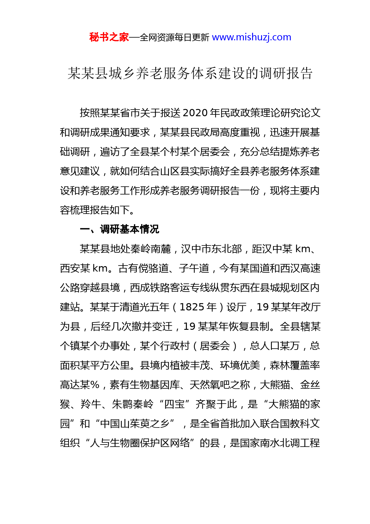 秘书之家—全网资源每日更新www.mishuzj.com某某县城乡养老服务体系建设的调研报告按照某某省市关于报送2020年民政政策理论研究论文和调研成果通知要求,某某县民政局高度重视,迅速开展基础调研,遍访了全县某个村某个居委会,充分总结提炼养老意见建议,就如何结合山区县实际搞好全县养老服务体系建设和养老服务工作形成养老服务调研报告一份,现将主要内容梳理报告如下。一、调研基本情况某某县地处秦岭南麓,汉中市东北部,距汉中某km、西安某km。古有傥骆道、子午道,今有某国道和西汉高速公路穿越县境,西成铁路客运专线纵贯东西在县城规划区内建站。某某于清道光五年(1825年)设厅,19某某年改厅为县,后经几次撤并变迁,19某某年恢复县制。全县辖某个镇某个办事处,某个行政村(居委会),总人口某万,总面积某平方公里。县境内植被丰茂、环境优美,森林覆盖率高达某%,素有生物基因库、天然氧吧之称,大熊猫、金丝猴、羚牛、朱鹮秦岭“四宝”齐聚于此,是“大熊猫的家园”和“中国山茱萸之乡”,是全省首批加入联合国教科文组织“人与生物圈保护区网络”的县,是国家南水北调工程秘书之家—全网资源每日更新www.mishuzj.com的重要水源涵养地和省引汉济渭工程的主要调水点。随着某某县经济社会持续快速发展,人民生活质量、卫生健康、社会保障水平的不断提高,我县人口老龄化趋势逐步凸显。2020年,全县60岁以上老年人口某人,占全县户籍总人口的某%,其中60-69周岁老年人某人,70-79周岁老年人某人,80-89岁老年人某人,90周岁以上老人某人。某某县现有中心敬老院某所,设置床位某张,最多时,集中供养五保老人某人;在西岔河、谭家河、水田坪、石墩河、陈家坝、西花、龙潭某个村设置镇、村敬老服务站某所,集中供养五保老人某人,安排贫困户就业某人;在大河坝高家梁安置点设置区域性养老院某所,建筑面积某平米,目前已完成招商引资,正在进行改造提升;在袁家庄社区建有老年人日间照料和居家养老服务中心某所,设置床位某张,为县城及周边老年人提供文化娱乐、健身康复、心理慰藉、午间休息和老年餐桌服务;历年来,投资某万元,在各镇村建设农村互助幸福院某所。行政村覆盖率达到了某%。二、全县养老工作开展情况调研情况(一)努力构建“党委领导、政府主导、社会参与、全民行动的养老工作格局。一是县委、县政府高度重视养老工秘书之家—全网资源每日更新www.mishuzj.com作。县委、县政府始终把养老工作放在全县经济社会发展的大局中认真谋划。先后出台了《民政与养老事业“十三五”发展规划》《关于进一步加强农村五保供养工作的实施意见》(佛政发〔2017〕16号),《关于推进医疗卫生与养老服务相结合的实施方案》(佛政办发〔2017〕190号),《关于贯彻落实全面放开养老服务市场提升养老服务质量的实施意见》(佛政办发〔2019〕7号)等指导性文件,制定了一系列惠及广大老年人的政策措施。二是部门密切配合,共同推进工作。县发改局对养老服务体系建设项目优先安排,及时申报。县财政局对养老服务体系建设资金和五保、低保、高龄等资金全额保障。县卫生健康局对养老服务机构全力提供卫生健康保障。县镇敬老院(服务站)与县医院和各镇卫生院签订了急危重症无障碍转诊协议;县镇医疗机构对五保老人实行先治疗后结算和免押金住院;对全县65岁以上老年人免除挂号费;2020年冬季,县中心敬老院发生群体性流感,县卫健局抽调精干力量入驻敬老院,全力以赴给予治疗,遏制了疫情的扩散。县市场监管局经常性到养老服务机构指导食品卫生安全。县应急管理局定期督导检查养老机构安全。县医疗保障局及时、全额解决五保老人医疗费。县民政局、县委老干局、县退休干部管理所加强沟通秘书之家—全网资源每日更新www.mishuzj.com协作,全力推进老年服务工作。组织老年人发挥正能量,鼓励、支持他们老有所学、老有所为、老有所乐、老有所安。三是涉老组织发挥余热,活跃在某某城乡。县老体协开展丰富多彩的文化体育活动,丰富城乡群众文化生活;赴北京水立方参加中国民间歌舞大赛并获得“银奖”,获得“全国老体协先进集体”、“全省老有所为先进典型”、“四星级党支部”等多项荣誉。县老年学学会组织撰写的《推进医养结合的有效途径》等多篇调研文章,获得中、省表彰。县老科协党支部被市委授予“先进基层党组织”,被市委组织部评为“四星级党支部”。(二)认真落实养老各项优惠扶助政策。一是着力做好农村困难老人救助工作。优先将全县符合条件的某名老年人纳入城乡低保范围,并加发某%的老年人分类施保资金;采取集中和分散供养相结合的方式,按照每人每年某元的供养标准,将全县某名农村五保老人全部纳入五保供养体系。近三年来,发放低保、五保资金共计某万元,做到应保尽保。严格按照政策标准,及时足额发放60岁以上农村籍退役人员生活补助金等农村老人养老扶助资金,确保老人得到有效救助。为全县某名留守老年人建立了信息台账,由各镇办、村组落实监护人员,开展定期探访。二是积极改善农村老人秘书之家—全网资源每日更新www.mishuzj.com医疗保障条件。推行城乡医疗救助“一站式”服务,优先对农村家庭困难老人实施大病医疗救助;开通了县镇医院(卫生院)和市级六家定点医疗