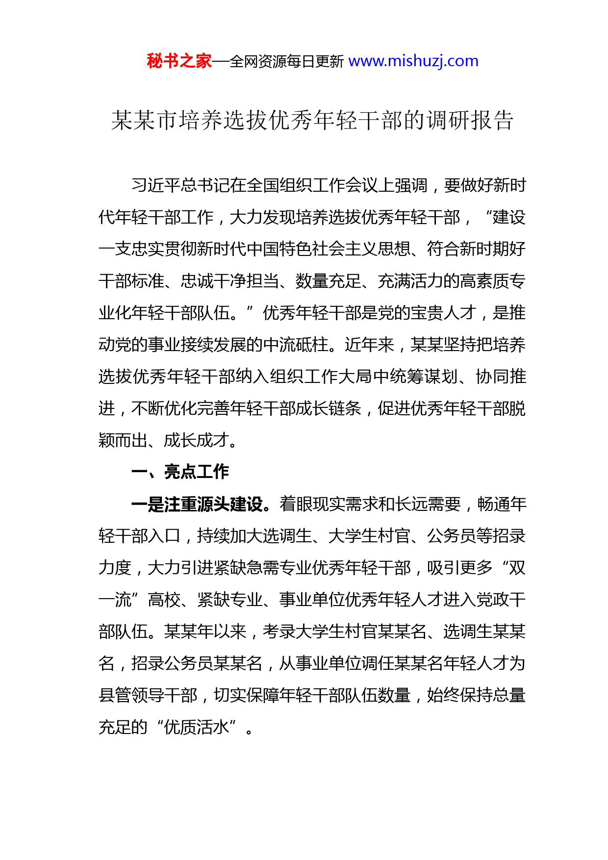 秘书之家—全网资源每日更新www.mishuzj.com某某市培养选拔优秀年轻干部的调研报告习近平总书记在全国组织工作会议上强调,要做好新时代年轻干部工作,大力发现培养选拔优秀年轻干部,“建设一支忠实贯彻新时代中国特色社会主义思想、符合新时期好干部标准、忠诚干净担当、数量充足、充满活力的高素质专业化年轻干部队伍。”优秀年轻干部是党的宝贵人才,是推动党的事业接续发展的中流砥柱。近年来,某某坚持把培养选拔优秀年轻干部纳入组织工作大局中统筹谋划、协同推进,不断优化完善年轻干部成长链条,促进优秀年轻干部脱颖而出、成长成才。一、亮点工作一是注重源头建设。着眼现实需求和长远需要,畅通年轻干部入口,持续加大选调生、大学生村官、公务员等招录力度,大力引进紧缺急需专业优秀年轻干部,吸引更多“双一流”高校、紧缺专业、事业单位优秀年轻人才进入党政干部队伍。某某年以来,考录大学生村官某某名、选调生某某名,招录公务员某某名,从事业单位调任某某名年轻人才为县管领导干部,切实保障年轻干部队伍数量,始终保持总量充足的“优质活水”。秘书之家—全网资源每日更新www.mishuzj.com二是注重研判发现。坚持“备用结合,择优选拔”原则,每年由县委常委带队深入开展回访调研,重点发现一批35岁以下的优秀年轻干部,经过党组织书面推荐、考察组调研了解、组织部集中研判、县委常委会集中审定“四道关口”,及时把在基层一线、脱贫攻坚、项目建设、信访维稳等压力大、责任重的岗位上表现优异的某某余名优秀年轻干部纳入县后备干部队伍,保证使用上有梯队、选择上有空间。三是注重分类储备。统筹全县干部资源,把优秀年轻干部按照年龄、性别、学历、专业特长、个性特征、工作经历等分类建立台账管理。着眼我县发展需要,分党政综合类、经济金融类、城建规划类、社会管理类、农业农村类、文化旅游类、历史考古类建立优秀年轻干部人才库,每年结合干部学习经历。二、主要做法1、加强交流,为年轻干部积累经验提供舞台。我们一方面实行年轻干部定期交流制度。针对一些年轻领导干部长期在一地任职,作用发挥受到一定限制的情况,制定干部在一地任职的期限和重点热点岗位交流的规定,让那些较有潜力的年轻干部到不同的工作岗位上进行全面的培养锻炼。近秘书之家—全网资源每日更新www.mishuzj.com两年,我们利用县乡班子换届的契机,共交流年轻干部某某人。另一方面采用各种交流形式培养锻炼干部。选派优秀中青年干部参加企业两个置换、某某教育学教活动、农村建整、农业结构调整等中心工作,让年轻干部在多个岗位上得到锻炼和充实。2、强化培训,为年轻干部提高素质铺路搭桥。年轻领导干部有激情、有干劲、有文化,接受新事物快,创新意识强,但也存在着实践经验不足、领导方法简单、知识结构单一等问题。我们针对这些情况,一是重点办好中青年干部培训班。培训班以基础理论、领导科学、政治与经济形势、科技现代化知识、党的建设为教学主要内容,突出习近平新时代中国特色社会主义思想的学习。通过组织培训班学员进行述学、评学、考学,不断增强年轻干部的理论功底,推动理论学习的深入。二是注重抓好中青年干部的实践锻炼,结合某某学教活动、社区党建活动把中青年干部放到条件艰苦的村居中开展工作,通过实践,年轻干部的能力和素质得到了一定锻炼提高。三是抓好年轻干部的经常性培训。在大专院校、沿海地区开设培训基地,分期分批组织年轻干部进行培训。通过高层次的学习培训,使年轻干部不断丰富现代科技知识和市场经济理论,拓宽知识面,提高思维层次。秘书之家—全网资源每日更新www.mishuzj.com3、深化改革,为选拔年轻领导干部创造条件。一是建立干部辞职制度。把由于个人能力不够,自身行为不当,未能很好履行领导干部的职责,身体状况欠佳,不适应现任职务,或因工作失误造成一定损失和影响的领导干部,通过自愿辞职、引咎辞职、责令辞职等办法调整下来。二是实行干部任期制。对领导干部任职最高年龄和在同一职位的任职年限作出规定,为年轻干部腾位子。对超过任职年龄的干部在班子换届时,一般不安排进班子,而改任非领导职务。对在同一职位上工作超过规定年限的,在班子调整时,原则上规定必须调离原工作单位。三是实行公开选拔和竞争上岗。在机构改革过程中,拿出部分领导职位进行公开选拔,在机关部门积极推进中层干部竞争上岗,为年轻干部上岗创造更多机遇。四是规定班子年轻干部的配备比例。抓住党委、政府、人大等班子换届时机,明确班子配备的年轻化目标,提高年轻干部在班子配备中的比例。4、加强管理,建好管好后备干部人才库。一是推行后备干部公示制。把后备干部队伍的基本情况向基层、向群众、向社会公开,充分听取基层干群意见,接受群众监督。二是推行工作评议制。有计划地组织后备干部每月向所在部门、每季向班子成员、每年向人大、党委进行工作汇报和述秘书之家—全网资源每日更新www.mishuzj.com职,开展民主讲评和评议,强化后备干部进取意识,增强自我培养的压力和动力。三是推行跟踪考察制。通过日常观察、专项测评和定期访谈、年终考评等方法,考察他们的政治态度、思想倾向、能