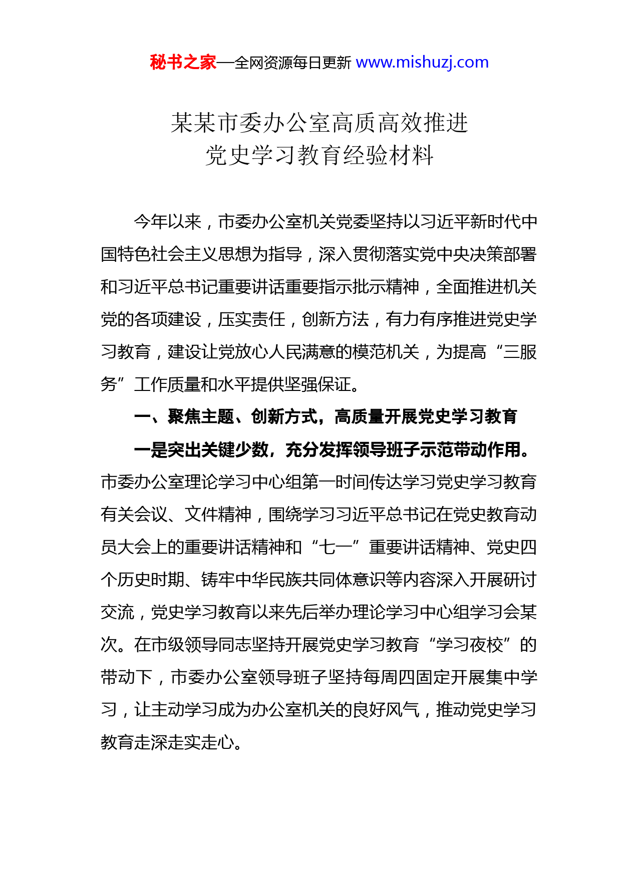 秘书之家—全网资源每日更新www.mishuzj.com某某市委办公室高质高效推进党史学习教育经验材料今年以来,市委办公室机关党委坚持以习近平新时代中国特色社会主义思想为指导,深入贯彻落实党中央决策部署和习近平总书记重要讲话重要指示批示精神,全面推进机关党的各项建设,压实责任,创新方法,有力有序推进党史学习教育,建设让党放心人民满意的模范机关,为提高“三服务”工作质量和水平提供坚强保证。一、聚焦主题、创新方式,高质量开展党史学习教育一是突出关键少数,充分发挥领导班子示范带动作用。市委办公室理论学习中心组第一时间传达学习党史学习教育有关会议、文件精神,围绕学习习近平总书记在党史教育动员大会上的重要讲话精神和“七一”重要讲话精神、党史四个历史时期、铸牢中华民族共同体意识等内容深入开展研讨交流,党史学习教育以来先后举办理论学习中心组学习会某次。在市级领导同志坚持开展党史学习教育“学习夜校”的带动下,市委办公室领导班子坚持每周四固定开展集中学习,让主动学习成为办公室机关的良好风气,推动党史学习教育走深走实走心。秘书之家—全网资源每日更新www.mishuzj.com二是丰富学习形式,切实营造深厚学习氛围。在抓好理论学习中心组学习、党支部集中学习和党员干部自学的基础上,不断丰富学习教育载体形式,切实提升学习实效。办公室不断细化党史学习教育学习夜校安排,通过组织学习夜校、知识测试、观看了自治区宣讲视频、观看红色电影,举办读书班,开展专题宣讲,开展红色教育等学习形式,形成了学习教育“组合拳”。同时,办公室注重党史学习教育宣传引导工作,根据党史学习教育各阶段学习重点,持续更新机关专题宣传展板,编发工作简报,总结工作中的经验和亮点,相关做法被内蒙古腾格里新闻、赤峰市电视台、赤峰日报等媒体专题报道,受到了社会广泛好评。三是坚持打牢基础,不断增强党支部学习主阵地作用。办公室机关党委压实各党支部抓学习责任,围绕党史学习教育扎实开展集中学习、主题党日活动、组织生活会、专题党课等支部活动,有效推动了学习型党支部建设。同时,为进一步提高党史学习教育学习成效,市委办公室创新开展了党支部分课题研学党史活动,办公室所属某个在职党支部分别认领了党史学习研究课题,并围绕各自课题认真开展学习研究,各党支部依次在每周四办公室集中学习会议上采取灵活形式汇报学习研究成果,形成党员广泛参与,学习入脑入心秘书之家—全网资源每日更新www.mishuzj.com的学习氛围。目前,已有某个党支部汇报了学习研究成果,形成了《中国共产党为什么“能”》《马克思主义为什么“行”》《中国特色社会主义为什么“好”》《中国共产党伟大建党精神的学习与研究》4篇高质量课题报告。通过扎实组织各类学习,推动党史学习教育在机关广大党员干部中入脑入心,达到了党史学习教育“学党史、悟思想”的效果。二、统筹兼顾、注重实效,务实开展“我为群众办实事”一是精心谋划“我为群众办实事”实践活动。认真落实党史学习教育“我为群众办实事”实践活动要求,坚持从实际出发,尽力而为、量力而行,结合实际制定《市委办公室“我为群众办实事”实践活动方案》,细化四个计划、四个清单、四个时限,提出具体措施,充分发挥基层党组织战斗堡垒作用、党员先锋模范作用和党员领导干部表率作用,立足本职、围绕包联点认真组织包联工作,扎实推进相关事项,认真解决突出问题,切实提高基层群众满意度。二是领导带头推进领办民生项目。按照“我为群众办实事”活动安排,办公室领导班子按要求公布了第二批次“我为群众办实事”重点民生项目清单,结合第一批次公布的项秘书之家—全网资源每日更新www.mishuzj.com目清单,合并后共计9个领办事项,目前已完成5个,基层反响良好。包联社区层面,组织党员多次深入松山区临河西社区对接工作,市级领导带头为社区“办实事”活动捐款,通过联系社会爱心企业、发动党员和基层群众,形成多方参与“办实事”的合力,目前已帮助建设电瓶车充电车棚某处,更换单元门及门禁系统某套,安装监控安防系统某套,协调解决长椅某个、运动器材某件、小区内道路中间护栏某米,协调租用临时活动场所某平方米。包联嘎查村层面,多次组织干部深入宁城县某某村开展调研,目前已经完成《关于某某村推动乡村振兴与巩固拓展脱贫攻坚情况的调研报告》《关于某某村提高乡风文明和乡村治理水平情况的调研报告》两篇调研报告,经过多方协调,通组路硬化、跨河桥梁建设项目已进入立项阶段。某月某日,市委书记某某到临河西社区实地察看文明城市示范点创建和“我为群众办实事”实践活动领办事项办理情况,肯定了工作成效,提出了工作要求;某月某日,自治区党史学习教育巡回指导组到临河西社区检查指导工作,对万书记及市委办公室“我为群众办实事”开展情况给予了高度评价。三是党支部分批报到,立足岗位开展志愿服务。考虑到办公室工作的特殊性和深入基层的实际效果,办公室本着帮秘书之家—全网资源每日更新www.mishuzj.com忙不添乱、切实为基层减负的原则,要求以党支部为单位,每周轮流到包联社区或包联村报到,结合实际情况开展志愿服务活动。比如,发挥专业优势