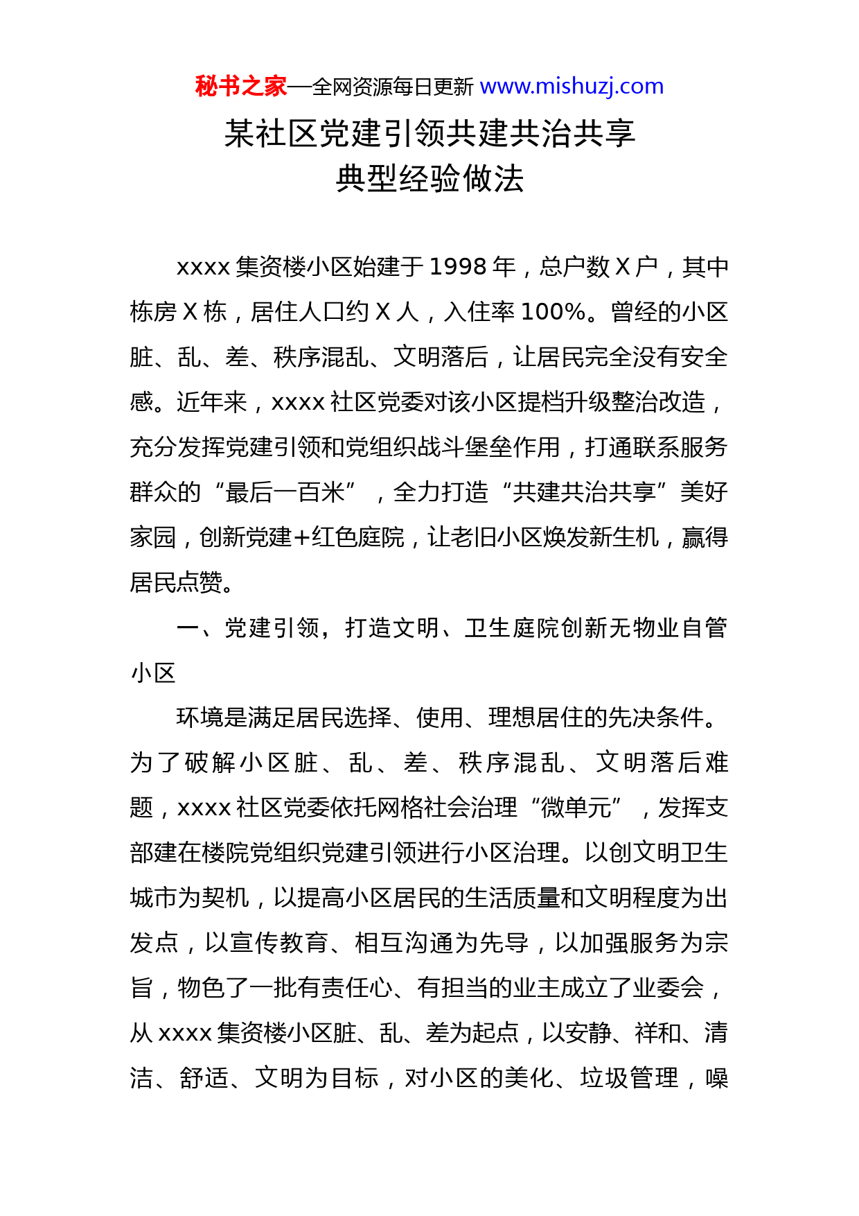 秘书之家—全网资源每日更新www.mishuzj.com某社区党建引领共建共治共享典型经验做法xxxx集资楼小区始建于1998年,总户数X户,其中栋房X栋,居住人口约X人,入住率100%。曾经的小区脏、乱、差、秩序混乱、文明落后,让居民完全没有安全感。近年来,xxxx社区党委对该小区提档升级整治改造,充分发挥党建引领和党组织战斗堡垒作用,打通联系服务群众的“最后一百米”,全力打造“共建共治共享”美好家园,创新党建+红色庭院,让老旧小区焕发新生机,赢得居民点赞。一、党建引领,打造文明、卫生庭院创新无物业自管小区环境是满足居民选择、使用、理想居住的先决条件。为了破解小区脏、乱、差、秩序混乱、文明落后难题,xxxx社区党委依托网格社会治理“微单元”,发挥支部建在楼院党组织党建引领进行小区治理。以创文明卫生城市为契机,以提高小区居民的生活质量和文明程度为出发点,以宣传教育、相互沟通为先导,以加强服务为宗旨,物色了一批有责任心、有担当的业主成立了业委会,从xxxx集资楼小区脏、乱、差为起点,以安静、祥和、清洁、舒适、文明为目标,对小区的美化、垃圾管理,噪秘书之家—全网资源每日更新www.mishuzj.com音、乱堆乱放、污水横流、乱张贴、出行路灯、车辆停放管理等通过居民议事方式进行了商议并制定了相应自管措施。引导居民积极参与的举措来着力改善小区的保洁、安保事务,满足居民最基本需求。逐步引导社区居民对小区治理由“被动管理”转为“参与管理”,社区党委挑大梁”转为居民“大合唱”,达到有效提升社区无物小区创新管理成效,创建了“平安、整洁、优美、宜居的良好环境。二、我是党员我优先,建立红色联盟扫码为您服务在不断完善硬件的同时,xxxx社区党委积极推进党建创新项目发展,努力创造社区党建新局面,将支部建在楼院中,把服务做到居民群众心坎上,把党建引领作为提升小区治理效能的重要抓手,聚焦群众急难愁盼等突出问题。以社区党组织为轴心,汇聚共建单位、社会组织、群团组织等,建立党建大联盟,打造党建+“红色联盟扫码为你服务”、公开党员承诺,树旗帜、亮身份,走向居民,走向小区的每一个点、面,以党建为引领,推动小区自治、进一步带动楼院居民,引导小区居民进行自我服务、自我管理、自我教育、自我监督,开展多种形式的活动,参与文明、卫生城市创建、疫情防控宣传。如今的xxxx集资楼小区在党建引领下焕然一新,呈现出邻里互助,安静祥和的良好氛围。秘书之家—全网资源每日更新www.mishuzj.com三、创新引进绘本、书法开展红色学堂、打造红色阵地行程万里,不忘来路;饮水思源,不忘初心。xxxx社区党委结合社区“朝夕同乐”特色品牌以建党100周年为契机,充分利用辖区社会资源、共建单位优势,抓好庭院党史学习教育,让红色基因、革命薪火代代传承,以幼、青少年教育为切入点办好小区庭院“红色学堂”。一是积极引进绘本、国画、书法课堂,将红色教育融入小区院落,从幼、青少年抓起,传播红色声音,传承红色文化,创建社区党建+红色庭院阵地,充分利用共建单位志愿者的有利资源,夯实院落红色文化传承基础,开展形式多样、内涵丰富的红色主题系列活动。通过结合幼、青少年身心发展特点,开展红色教育,从认识国旗、党旗,到学唱经典红歌、聆听英雄故事,把党史贯穿到了教育当中,以及各种户外课堂活动、游戏、手工课、图片等形式,让祖国的下一代了解党史,从小热爱党、热爱祖国。二是建立居民“红色议事会”,建立庭院“红色公约”,启动联动巡查、联动分析、联动处置的工作机制,庭院事务进行居民决策协商、矛盾协调会,协调解决矛盾问题,由网格员、共建单位党员、庭院在职党员、业主共同担任“红色调解员”,对涉及小区庭院的重大事项和复杂问题,通过议事会协商会,合力推进解决,共同为庭院居民服务。三是浓秘书之家—全网资源每日更新www.mishuzj.com厚小区红色文化氛围,开展系列精神文化活动引导院落居民学党史、颂党情、跟党走。以“红色激情,朝夕同步”为理念,旨在为小区广大党员群众搭建传承红色文化、推动庭院居民朝夕同乐、以各类丰富多彩的活动为载体,吸引更多社区居民广泛参与进来,增强大家的归属感和幸福感,从而促进社区的全面发展。小区党建+红色庭院创建具有十分重要的意义,既能通过红色教育,将一颗颗爱国的种子播撒在孩子心灵当中,从而增强孩子们的爱国主义情怀,让他们从小传承红色基因,争做新时代的接班人。同时庭院党建红色文化元素也能引导小区居民回顾我党的历史、知悉党的政策、学习先锋事迹、充实庭院居民的理论知识精神食粮,以点带面,一个带动一群、一群带动一片。同时以绘本学堂为平台,活跃四点半课堂,以党建引领,共建单位志愿者的参与,开拓社区党建创新发展的新局面。