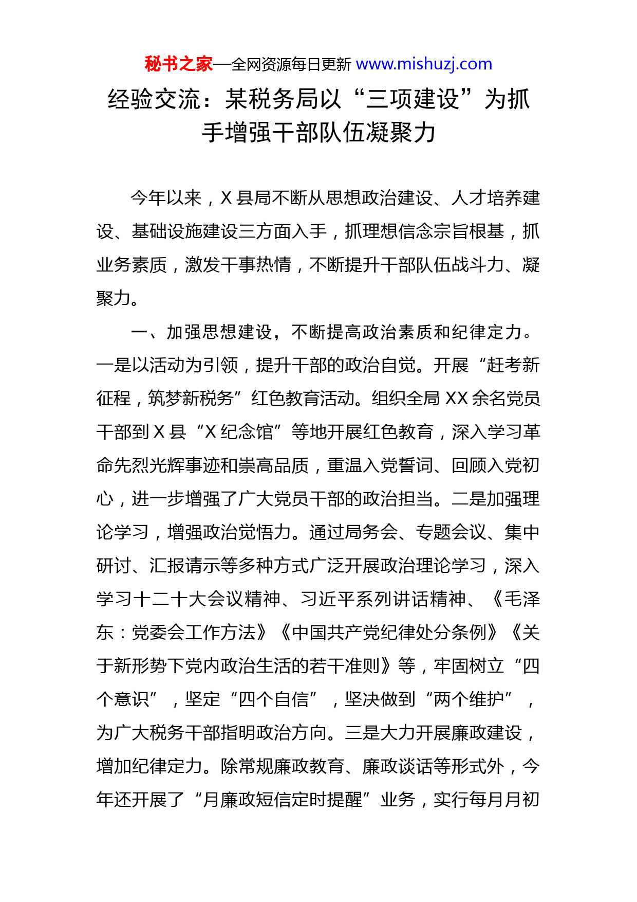 秘书之家—全网资源每日更新www.mishuzj.com经验交流:某税务局以“三项建设”为抓手增强干部队伍凝聚力今年以来,X县局不断从思想政治建设、人才培养建设、基础设施建设三方面入手,抓理想信念宗旨根基,抓业务素质,激发干事热情,不断提升干部队伍战斗力、凝聚力。一、加强思想建设,不断提高政治素质和纪律定力。一是以活动为引领,提升干部的政治自觉。开展“赶考新征程,筑梦新税务”红色教育活动。组织全局XX余名党员干部到X县“X纪念馆”等地开展红色教育,深入学习革命先烈光辉事迹和崇高品质,重温入党誓词、回顾入党初心,进一步增强了广大党员干部的政治担当。二是加强理论学习,增强政治觉悟力。通过局务会、专题会议、集中研讨、汇报请示等多种方式广泛开展政治理论学习,深入学习十二十大会议精神、习近平系列讲话精神、《毛泽东:党委会工作方法》《中国共产党纪律处分条例》《关于新形势下党内政治生活的若干准则》等,牢固树立“四个意识”,坚定“四个自信”,坚决做到“两个维护”,为广大税务干部指明政治方向。三是大力开展廉政建设,增加纪律定力。除常规廉政教育、廉政谈话等形式外,今年还开展了“月廉政短信定时提醒”业务,实行每月月初秘书之家—全网资源每日更新www.mishuzj.com定时发送一次廉政短信提醒,节假日重点提醒,通过“打预防针”的形式,实现了廉政防范关口前移,增加了全体干部廉洁从业、遵章守纪和自我约束的意识,有效预防违规微机行为的发生。二、完善人才培养机制建设,不断提高干部队伍业务素质。坚持向素质要业绩,向素质要战斗力,对干部队伍建设实行使用和培养并重。一是完善培养制度。针对不同年龄结构人员实施定向培养机制,制定《X县税务局教育培训计划》《新进人才培养计划》《年轻干部培养计划》《人才库人员培养计划》等制度,突出培训的实效性和针对性,同时科学合理分配工作岗位,开展专项专业培训,实现“人岗相适”“人尽其才”。二是加强岗位交流。实行XX岁以下年轻干部轮岗制度,即通过召开座谈会等形式,各部门之间进行经验交流,既有利于丰富干部的自身阅历,打造机关复合型人才,又能不断增强自身能力,提高整体业务素质。,召开新闻宣传员培训会议X次,法律人才交流会议X次,全税种讲座X次,部门骨干人员交流X次。三是突出培养重点。建立“专业人才数据库”,包括“三师”人员、“征管能手”“服务标兵”等人才库。人才库实行动态管理,按照着眼未来、按需定向的原则确定培养方向,制定培养计划,落实培养措施,形成人才梯队。党委成员联系X-X名人才库人员,加强对他们的培养秘书之家—全网资源每日更新www.mishuzj.com教育,定期谈话,关心成长。在选拨任用上,对优秀的人才库人员进行政策上的倾斜。三、实施人文建设,激发干部干事热情。一是走访慰问,塑造“暖心”环境。由机关党委牵头,办公室、人教股、工会组织配合,认真梳理慰问关怀干部职工的各项政策规定,建立困难职工、退休老干部登记簿,坚持开展伤病慰问、困难职工慰问、老干部慰问等各项慰问活动,为本单位干部职工落实各种政策。今年以来,县局已对X名患病职工、X名生活困难干部职工进行了救助或补助,走访慰问退休老干部XX余人,及时为他们送去了组织的关怀与问候,让他们感受到组织温暖关怀。二是保障落实,打造“舒心”环境。规范职工食堂管理,安装电视、热水宝、饭菜保温和卫生监控设备,实行菜谱公开,让广大干部职工安心用好餐;建设职工之家,建立图书室和文体活动室和减压室,在丰富职工业余文化生活的同时,也充分关注干部职工心理健康问题,增强干部职工归属感和幸福感;为基层分局统一更换燃气锅炉,及时更新办公设备,为老旧办公区干部职工搬迁到新的办公区,为外地青年干部职工统一安排宿舍、完善生活配套设施、及时解决生活实际困难,为他们尽可能提供舒适便利的工作和生活环境。三是文娱添彩,打造“宽心”环境。加强机关文化建设,致力于陶冶情操,增进团结。先后组织了迎新晚会,开展了机秘书之家—全网资源每日更新www.mishuzj.com关女同志开展多肉植物盆景制作活动、“春季踏青寻宝活动”、篮球比赛活动、减税降费知识竞赛活动、义务植树活动、学雷锋志愿服务等系列活动。同时,成立了摄影、书画、写作、手工等XX个兴趣活动小组,并定时邀请专业人士进行培训。这不仅让干部职工在工作之余能够放松心情,同时也增加了干部职工的活力及归属感,有效增强了队伍凝聚力。