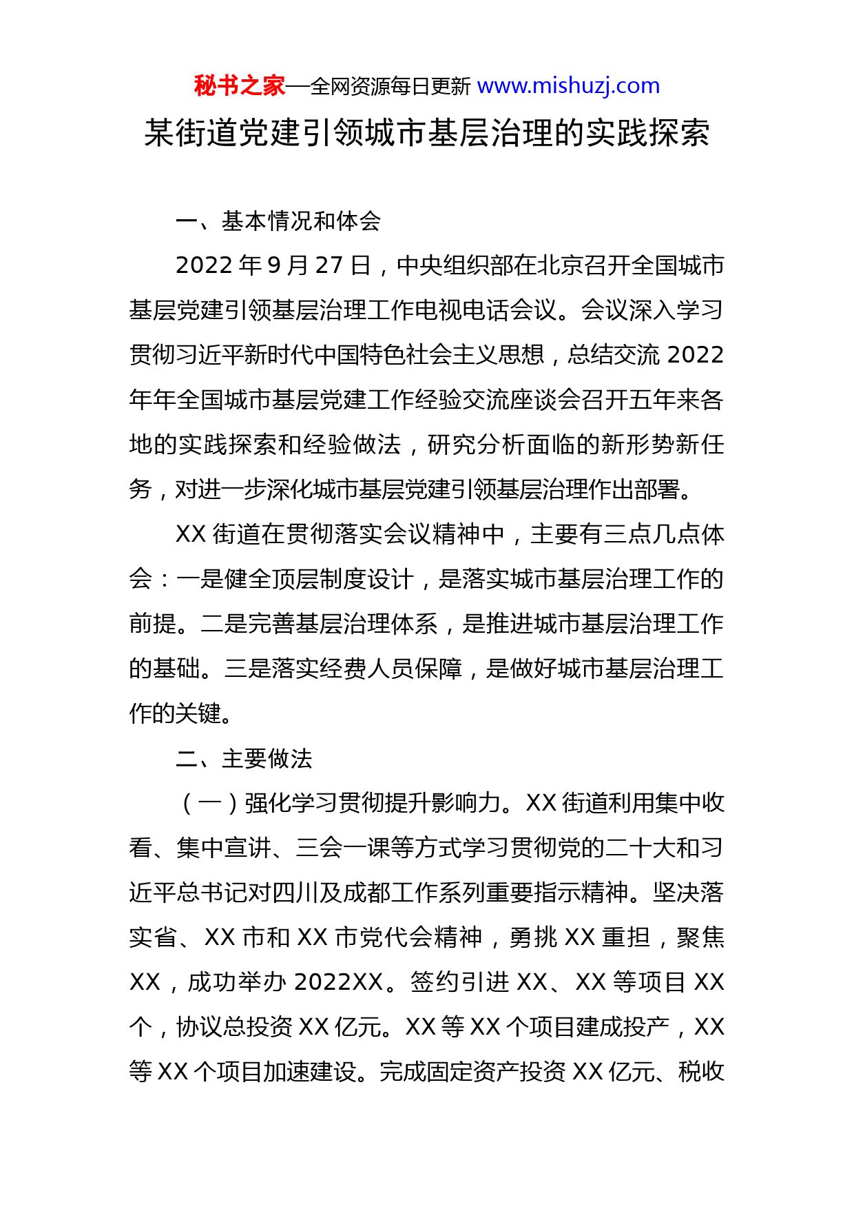 秘书之家—全网资源每日更新www.mishuzj.com某街道党建引领城市基层治理的实践探索一、基本情况和体会2022年9月27日,中央组织部在北京召开全国城市基层党建引领基层治理工作电视电话会议。会议深入学习贯彻习近平新时代中国特色社会主义思想,总结交流2022年年全国城市基层党建工作经验交流座谈会召开五年来各地的实践探索和经验做法,研究分析面临的新形势新任务,对进一步深化城市基层党建引领基层治理作出部署。XX街道在贯彻落实会议精神中,主要有三点几点体会:一是健全顶层制度设计,是落实城市基层治理工作的前提。二是完善基层治理体系,是推进城市基层治理工作的基础。三是落实经费人员保障,是做好城市基层治理工作的关键。二、主要做法(一)强化学习贯彻提升影响力。XX街道利用集中收看、集中宣讲、三会一课等方式学习贯彻党的二十大和习近平总书记对四川及成都工作系列重要指示精神。坚决落实省、XX市和XX市党代会精神,勇挑XX重担,聚焦XX,成功举办2022XX。签约引进XX、XX等项目XX个,协议总投资XX亿元。XX等XX个项目建成投产,XX等XX个项目加速建设。完成固定资产投资XX亿元、税收秘书之家—全网资源每日更新www.mishuzj.com入库XX亿元。(二)完善组织堡垒提升引领力。一是做实体制机制改革“后半篇”文章。发挥XX优势,设立街道+社区两级党群服务中心、便民服务中心,规范设置标识标牌,确保党员群众办事方便,承接社保医疗、商事登记、企业服务等服务事项XX个。结合街道集中居住高实际,在XX个社区全覆盖设立便民服务站和小区便民服务代办点。依托“全岗通”服务体系,将XX项便民服务事项下沉到社区,实行“街道+社区”干部双下沉模式,深入小区院落为群众就近办理社保医疗、就业创业等便民服务XX项,XX等XX个社区成功创建全国“示范型”退役军人服务站,XX等XX个社区成功创建成都市级示范便民服务站。二是健全微网实格基层党组织。在调整小区党组织基础上,优化调整社区下属“微网实格”党组织XX个、建立党小组XX个。并通过程序选举产生“微网实格”党组织工作队伍XX余人。三是加强社区干部队伍建设。XX年社区党组织和自治组织换届后,现有社区“两委”成员XX名(含街道下派人员XX人),其中大专学历以上XX名占XX%,“80、90后”干部XX人占XX%。引导XX、XX等XX个单位党组织负责人到XX个城市社区兼职任党组织委员,共同参与社区发展治理。社区干部均纳入岗位等次管理(不含街道下派XX人),其中一级XX人、占比XX秘书之家—全网资源每日更新www.mishuzj.com%,二级XX人、占比XX%,三级XX人、占比XX%,社区专职工作者收入除了人均XX万元/年(扣除社保和公积金)工资收入外,通过自主创业的XX人,无其他收入来源XX人。街道还落实社区后备干部“导师制”培养机制,将XX名社区青年后备干部纳入“一对一”“一对多”培养体系,通过跨镇街、跨社区、跨岗位等形式,进行驻村锻炼、跟班学习、调研实践,加速锻炼成长。四是强化社区运行保障。统筹社区保障资金、办公经费、环境整治等资金,保障社区运转、党建、基层治理等工作经费XX万元。优化调整社区证明事项XX个,简化台帐、表格填报XX个,清理优化微信、QQ群XX个,使社区工作“轻装上阵”,促进社区干部活跃在小区里、院落中、田坎上。(三)抓好支部带动提升战斗力。一是充实“微网实格”力量。建立街道+社区+小区(小组)三级“微网实格”治理体系,将党员、预备党员、积极分子和骨干群众纳入XX个网格(含XX个企业网格)和XX个微网格当中,通过示范引领推进社区基层治理。XX名专职网格员和XX名兼职网格员发动网格力量,引导成立志愿服务队XX支,开展小区治理、疫情防控、治安巡逻、安全环保、燃气检测等志愿服务,协调解决安全隐患、入学就医、小区管理、环境治理等问题XX余个。XX社区党委在街道党工委办事处大力支持下,积极发挥党组织引领作用和党员骨秘书之家—全网资源每日更新www.mishuzj.com干群众示范作用,在社区一班人的努力下、在社区群众的理解和支持下,通过XX年的不懈努力,持续不断与社区群众沟通解释宣传,消除了XX林地股权量化到户的各种障碍,在XX年完成了XX户股权量化到户工作,保障了社区群众合法权益,有力提升了XX在党员群众中的公信力和影响力,经验做法被XX刊登。二是全面推进两新组织两个覆盖。街道在一手推进社区党建工作的同时,一手推进两新组织“两个覆盖”动态清零行动。XX年新成立XX等党组织8个、联建党组织5个,两新党组织覆盖率达XX%。XX街道还通过做实“党建+”文章,率领机关社区干部下沉到企业车间、田间地头、项目工地,收集协调解决证照办理、能源保障、道路建设等问题XX余个,融资需求XX亿元。三是切实提升服务水平。发挥综合党委功能,坚持区域化党建工作联席会议机制,组织旅装区(街道)、社区党建联盟单位召开联席会,开展“喜迎党的二十大·治蜀兴川有我”“践行两山理念”等主题活动XX场次。XX年,为保障XX三期顺利投产,按照厂区周边XX米卫生防护距离实施搬迁,主要涉及XX和XX社区。街道通过建立社区+企业党组织双向沟通机制,通过反复上门向涉及居民宣传政策、沟通解释,圆满完成了XX户卫生防护距离内居民搬迁工作,有力保障了重点企业正常生产经营。(四)深化党群共建提升凝聚力。一是完善党建+站秘书之家—