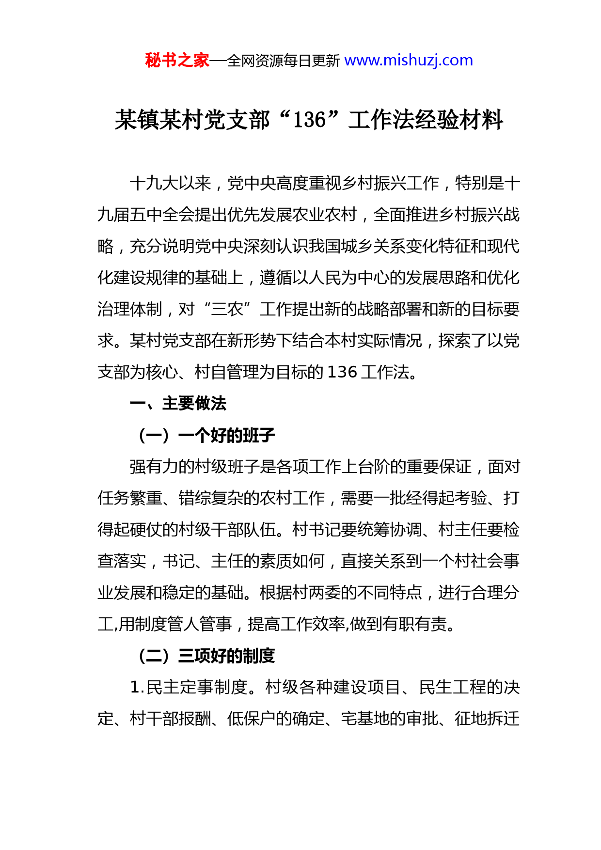 秘书之家—全网资源每日更新www.mishuzj.com某镇某村党支部“136”工作法经验材料十九大以来,党中央高度重视乡村振兴工作,特别是十九届五中全会提出优先发展农业农村,全面推进乡村振兴战略,充分说明党中央深刻认识我国城乡关系变化特征和现代化建设规律的基础上,遵循以人民为中心的发展思路和优化治理体制,对“三农”工作提出新的战略部署和新的目标要求。某村党支部在新形势下结合本村实际情况,探索了以党支部为核心、村自管理为目标的136工作法。一、主要做法(一)一个好的班子强有力的村级班子是各项工作上台阶的重要保证,面对任务繁重、错综复杂的农村工作,需要一批经得起考验、打得起硬仗的村级干部队伍。村书记要统筹协调、村主任要检查落实,书记、主任的素质如何,直接关系到一个村社会事业发展和稳定的基础。根据村两委的不同特点,进行合理分工,用制度管人管事,提高工作效率,做到有职有责。(二)三项好的制度1.民主定事制度。村级各种建设项目、民生工程的决定、村干部报酬、低保户的确定、宅基地的审批、征地拆迁秘书之家—全网资源每日更新www.mishuzj.com等等。2.民主理财制度。做到村财镇代理,在三资所有权和使用权不变的情况下,根据民主定事,村务监督委员会审核,由镇三资会计核算中心代理,包括审核、服务、办理、落实等。3.群众评议村干部制度。就是说干部行不行,群众说了算。年底召开党员、村民代表大会、村干部述职、参会人员评议、质询,采取无记名投票方式进行测评,评议结果与村干部绩效工资挂钩,与奖惩使用相结合。对评议不合格的党支部成员,进行辞退,对不合格的村委会成员,通过法定程序进行罢免。(三)六步工作法1.征求意见。在每年年初和重大事项决策前,通过多种途径征求群众意见,以凝聚民心、集中民智。既要征求党员意见,又要征求村民意见。要灵活多样,召开党员议事会、村民代表会议、老协会等途径征求。对收集到的建议意见进行梳理,作为制定本年度工作计划的依据,并本着量力而行、尽力而为的原则,分轻重缓急、因村制宜、注重实效,研究制定工作计划和措施。2.议事决策。对涉及本村建设的重要项目和群众切身利秘书之家—全网资源每日更新www.mishuzj.com益的问题,都要坚持民主集中制原则,先党内后党外,先党员后群众,进行民主决策,不能由个人和少数人决定。村务决策一般按有关程序进行,村党支部书记和村委会主任要根据农村建设规划和上级要求召开党组织和村委会联席会,收集群众意见,就有关事项进行沟通,提出初步方案,在会议进行讨论,提出具体意见和建议,依法提交村民代表会议讨论决定。议事决策一般与年终岁首全年工作总结有机结合起来。对一些急需解决的重要事项,平时也可视情况及时决策。3.项目分解。由党支部、村委会根据各类组织队伍的功能定位和职责分工,将年度工作任务立项分解到各类组织、各支队伍中。项目分解采取签订责任状,目标管理责任书,并要明确各类组织和各支队伍的主要任务,具体项目完成时限。责任人对需要几个方面集体帮忙完成的任务,要区分责任人和间接责任人,以便于检查考核。书记、村主任的责任状由上级下达,其他各类组织和各支队伍的责任状由党支部、村委会下达。4.公开承诺。村级各类组织或各支队伍的负责人根据承担的工作向村党支部、村委会和村民做公开承诺,自觉接受监督,村级各类组织、各支队伍要支持、贯彻上级和村委会秘书之家—全网资源每日更新www.mishuzj.com的各项决定,根据上级下达的责任书,认真制定工作计划,同时,采取在党员和村民代表大会上宣读,在村务公开栏张贴,将承担的具体事项特别是为民办实事项目,完成时间、质量、效果等方面向村党组织,村委会及村民做公开承诺,承诺内容要切合实际,具体可行,说到做到,说好做好。5.组织实施。由村党支部指导、督促任务的落实,党组织要建立分工负责制,每个支委分别联系指导各类组织、各支队伍积极开展“赶、学、超”活动,发动党员起模范带头作用,村党组织村委会每月一次例会,每季度一次汇报,半年一次点评,年终一次考评的“四个一”工作制度,及时掌握任务落实情况,协调解决工作中遇到的实际困难和问题。通过开展有效的载体活动,实行有效的工作方式,抓好党小组长、村民小组长、中心户长等一批示范骨干,形成“各项工作大家做,千斤重担大家挑”的工作局面,同时,对各支队伍任务落实情况实行事前、事中、事后全程公开、使群众在实施前能了解,实施中能参与,实施后能监督。6.考评奖惩。建立民主评议村干部“固定补贴+绩效补贴”等制度,把考评情况与兑现奖惩,评先评优等挂钩、调动村干部的工作积极性。村一级要从实际出发,建立并实行村级工作考评奖惩制度。每年年初根据各人承担和承诺的工秘书之家—全网资源每日更新www.mishuzj.com作任务,制定具体的奖惩措施,年底由党员、村民代表等参加的评议大会,听取每个村干部的年度工作汇报,并由到会人员按照“优秀、称职、基本称职、不称职”四个档次进行民主评议,根据评议的档次兑现奖惩。实行136工作法的六点做法:①加强队伍建设,为实行村级管理提供保障;②搞好宣传发动,营造村级管理氛围;③规范制度建设,确保制度依法有效实施;④创新民主听证、村务公开