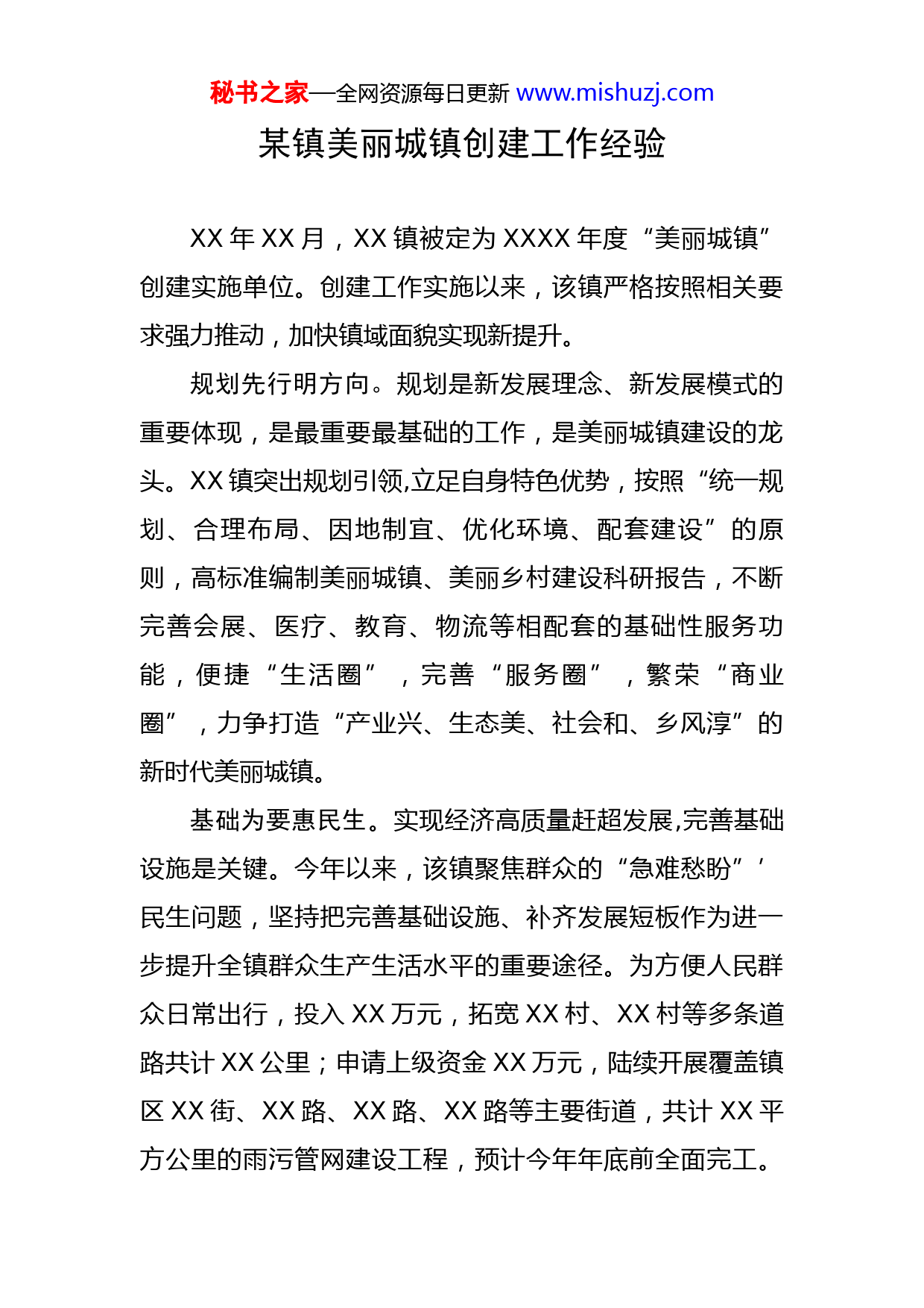 秘书之家—全网资源每日更新www.mishuzj.com某镇美丽城镇创建工作经验XX年XX月,XX镇被定为XXXX年度“美丽城镇”创建实施单位。创建工作实施以来,该镇严格按照相关要求强力推动,加快镇域面貌实现新提升。规划先行明方向。规划是新发展理念、新发展模式的重要体现,是最重要最基础的工作,是美丽城镇建设的龙头。XX镇突出规划引领,立足自身特色优势,按照“统一规划、合理布局、因地制宜、优化环境、配套建设”的原则,高标准编制美丽城镇、美丽乡村建设科研报告,不断完善会展、医疗、教育、物流等相配套的基础性服务功能,便捷“生活圈”,完善“服务圈”,繁荣“商业圈”,力争打造“产业兴、生态美、社会和、乡风淳”的新时代美丽城镇。基础为要惠民生。实现经济高质量赶超发展,完善基础设施是关键。今年以来,该镇聚焦群众的“急难愁盼”’民生问题,坚持把完善基础设施、补齐发展短板作为进一步提升全镇群众生产生活水平的重要途径。为方便人民群众日常出行,投入XX万元,拓宽XX村、XX村等多条道路共计XX公里;申请上级资金XX万元,陆续开展覆盖镇区XX街、XX路、XX路、XX路等主要街道,共计XX平方公里的雨污管网建设工程,预计今年年底前全面完工。秘书之家—全网资源每日更新www.mishuzj.com届时,将实现镇域雨污管网全覆盖,助力“美丽城镇”建设再上新台阶。环境提升增颜值。建设美丽宜居乡镇,是一项为民谋福祉的“民心工程”。该镇按照生产、生活、生态“三生融合”思路,立足“宜居、宜业、宜游”三大维度,着力打好人居环境“升级战”,开展农村垃圾治理、污水处理和厕所改造“三大革命”,绿化、硬化、亮化道路XX米,修葺镇区花池XX个,开辟街心小花园X个,更换花池边石XX米,栽种绿植约XX平方米,栽种林木XX棵,将主街道的XX盏电路灯更换为新能源太阳能电池板。出动人员XX余名,机械设备XX台,清理村内垃圾和杂物XX方,清理各类小广告XX平方米。指导各村建设小游园、小菜园、停车场XX处,三年累计改厕XX座。实现乡村由一处美向处处美、一时美向持久美、外在美向内在美转变。技术引领保稳定。实现治理有效,确保和谐稳定,是持续提升人民群众获得感、幸福感、安全感的根本所在。为实现更加全面细致的“护民周全”,该镇积极推动基层治理能力“现代化”全面提升。近年来,该镇率先建成综治指挥平台,与全镇XX个行政村、XX个监控摄像头全面接通,实现村、企、校、商全覆盖,全方位保障群众生产生活安全,指挥中心与现场执法实时交互,以“高科技”“智能化”实现社会治理“快人一步”。秘书之家—全网资源每日更新www.mishuzj.com乡风和谐促文明。美丽城镇建设,要“塑形”,更要“铸魂”。只有充分发挥乡风文明在凝聚人心、教化群众、淳化民风中的重要作用,才能不断增强美丽城镇建设的活力和动力。今年以来,该镇通过文化活动中心、文体活动广场、乡风文明示范街、道德“红黑榜”建设,打造了一批功能完善、特色鲜明的乡风文明示范村;各村党支部开展“爱心大锅菜”“饺子宴”等孝老爱心活动已成为常态;开展的文明户、好公婆、好媳妇等评选活动,更是层出不穷。通过与文明实践志愿服务活动的有效结合,深入挖掘提炼优良传统,进一步扩充美丽城镇发展“软实力”,让城镇更有韵味。