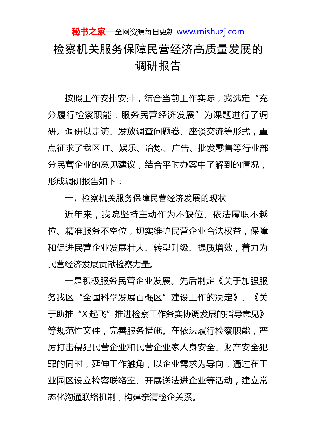 秘书之家—全网资源每日更新www.mishuzj.com检察机关服务保障民营经济高质量发展的调研报告按照工作安排安排,结合当前工作实际,我选定“充分履行检察职能,服务民营经济发展”为课题进行了调研。调研以走访、发放调查问题卷、座谈交流等形式,重点征求了我区IT、娱乐、冶炼、广告、批发零售等行业部分民营企业的意见建议,结合平时办案中了解到的情况,形成调研报告如下:一、检察机关服务保障民营经济发展的现状近年来,我院坚持主动作为不缺位、依法履职不越位、精准服务不空位,切实维护民营企业合法权益,保障和促进民营企业发展壮大、转型升级、提质增效,着力为民营经济发展贡献检察力量。一是积极服务民营企业发展。先后制定《关于加强服务我区“全国科学发展百强区”建设工作的决定》、《关于助推“X起飞”推进检察工作务实协调发展的指导意见》等规范性文件,完善服务措施。在依法履行检察职能,严厉打击侵犯民营企业和民营企业家人身安全、财产安全犯罪的同时,延伸工作触角,以企业需求为导向,通过在工业园区设立检察联络室、开展送法进企业等活动,建立常态化沟通联络机制,构建亲清检企关系。秘书之家—全网资源每日更新www.mishuzj.com二是优化民营经济发展环境。严厉打击破坏市场经济秩序犯罪,批准逮捕非法集资、非法经营、制假售假、合同诈骗等破坏市场经济秩序犯罪案件X件X人、起诉X件X人,批准逮捕强揽工程、阻工扰工、强买强卖等破坏重点项目建设、损害经济发展环境犯罪案件X件X人、起诉X件X人。依法办理了X温泉项目负责人张某合同诈骗案、X商贸有限责任公司董事长李某非法吸收公众存款案、X市浙商房地产有限公司总经理张某某串通投标案。三是提升服务民营企业发展质量。积极打造“四位一体”的诉求表达体系,搭建多方位服务平台。开展普法宣传,经常性地开展“法律宣传进企业”“检察开放日”等活动,扩大检察工作的知晓率。推进“12309”检察服务建设,努力建成全市检察机关“信、访、网、电”网上信访信息系统,为民营产权人寻求法律咨询、权利救济提供更加便捷高效的服务。注重与区工商联沟通联系,增进民营企业家对检察工作的了解,延伸法律服务经济发展触角。二、存在的困难和问题客观来讲,经过近年来不懈的努力,区检察院在服务保障民营经济发展中认识更加深刻、履职更加到位,服务更加精神,但也还是存在着一些不容忽视的问题。主要表现在以下几个方面:一是思想认识还需要进一步深化,服务民营经济发展秘书之家—全网资源每日更新www.mishuzj.com自觉性不高。“我国民营经济已经成为推动我国发展不可或缺的力量”。回望改革历史,我国经济发展能够创造中国奇迹,民营经济功不可没。服务保障民营经济高质量发展,对于实现中华民族伟大复兴的中国梦具有重要意义,检察机关作为国家法律监督机关,服务保障民营经济高质量发展是我们义不容辞的职责。在实际工作,受思想认识、工作力量的局限,少数干警服务民营经济发展的自觉性不高,主动作为较少。调查问卷中,半数以上的民营企业认为检察机关落实服务保障民营经济发展相关要求存在差距,主要原因是主观方面不够重视。二是服务还停留在浅层化、表面化,工作不深入不细致。一方面,主动服务意识不强,深入了解民营企业的法律服务需求不够,对新问题新情况研究不深掌握不透,服务的精准性、针对性、实效性不强。另一方面,在服务保障民营经济发展、办理涉及民营企业和民营企业家案件中,还存在就案办案思想,案件办理的政治效果、社会效果和法律效果没有达到有机统一。三是沟通服务平台欠缺,及时沟通缺乏有效方式。与民营企业和民营企业家的沟通目前主要有全区“两会”、“检察开放日”和进企业宣传、办案走访等方面,存在着即时性、针对性不强,覆盖面较窄等问题。就发放调查问卷的情况来看,半数以上的民营企业对检察机关服务保障秘书之家—全网资源每日更新www.mishuzj.com民营经济发展的相关措施和制度不知晓、不了解,少部分民营企业对检察机关职能不了解或者是了解不全面。三、民营企业和民营企业家对优良外部环境的需求梳理此次调研中收集到的和平时掌握的情况,我们发现民营企业和民营企业家对如下外部环境需求较大:一是完备基础设施。包括通讯、供水供电、交通等基础设施,是影响企业发展和正常生产经营的重要因素。二是较高政务服务水平。包括工商、税务、海关等政务服务水平,需要进一步的提高、优化。三是公平的市场竞争环境。存在个别市场主体违规把持市场、潜规则等现象。四是充足法律法规方面的信息获取。企业内部存在偷盗、泄露商业秘密等现象,企业在寻求法律法规保护方面信息获取不足,导致不能较好地维护自身合法权益。民营企业和民营企业家们普遍向检察机关提出加大法律宣传力度,公正司法、依法保护民营企业合法权益和企业家创新精神,为民营企业发展保驾护航的建议。四、下一步打算和工作措施支持民营经济发展永远在路上,支持民营经济发展重在务实。我们将在此次调研的基础上,找准精准服务民营经济发展的切入口和民营企业对法律服务的需求,充分履行检察职能,为民营经济发展提供更好、更优的法治产秘书之家—全网资源每