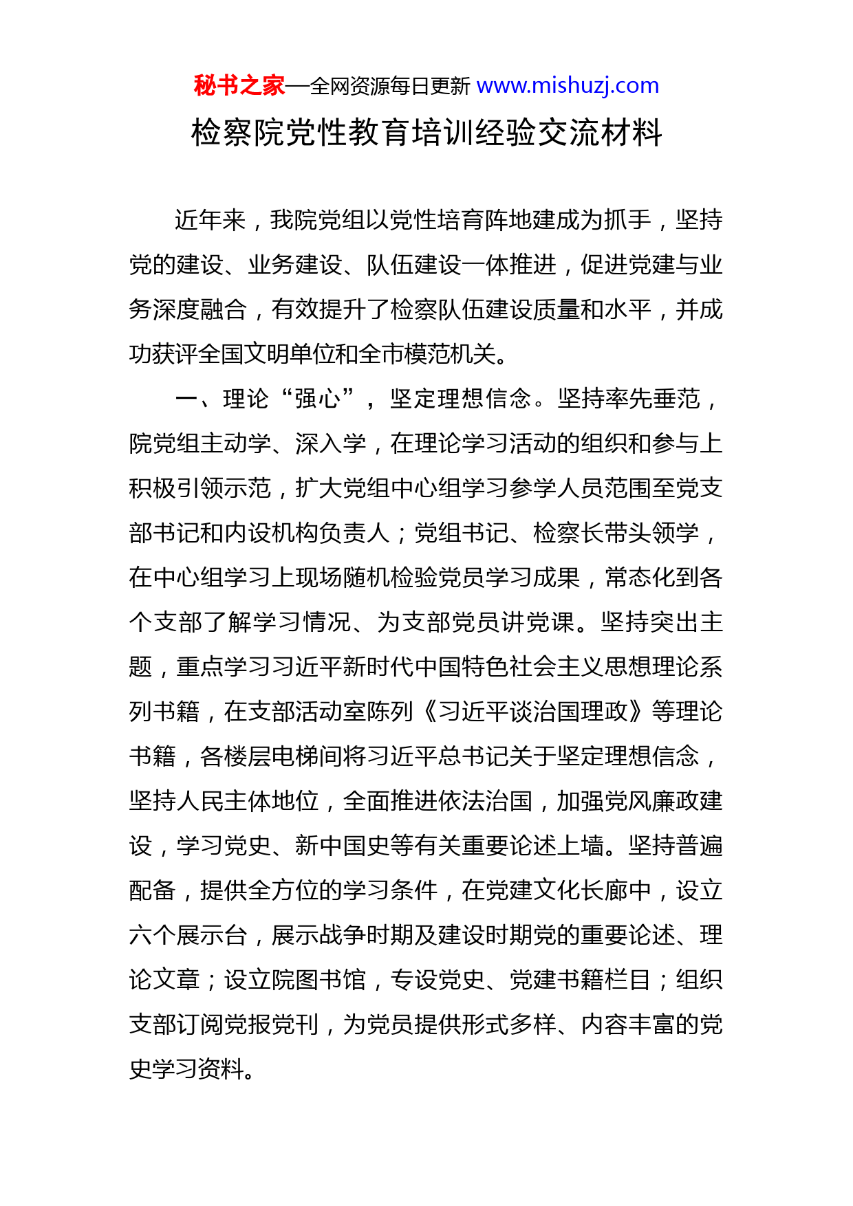 秘书之家—全网资源每日更新www.mishuzj.com检察院党性教育培训经验交流材料近年来,我院党组以党性培育阵地建成为抓手,坚持党的建设、业务建设、队伍建设一体推进,促进党建与业务深度融合,有效提升了检察队伍建设质量和水平,并成功获评全国文明单位和全市模范机关。一、理论“强心”,坚定理想信念。坚持率先垂范,院党组主动学、深入学,在理论学习活动的组织和参与上积极引领示范,扩大党组中心组学习参学人员范围至党支部书记和内设机构负责人;党组书记、检察长带头领学,在中心组学习上现场随机检验党员学习成果,常态化到各个支部了解学习情况、为支部党员讲党课。坚持突出主题,重点学习习近平新时代中国特色社会主义思想理论系列书籍,在支部活动室陈列《习近平谈治国理政》等理论书籍,各楼层电梯间将习近平总书记关于坚定理想信念,坚持人民主体地位,全面推进依法治国,加强党风廉政建设,学习党史、新中国史等有关重要论述上墙。坚持普遍配备,提供全方位的学习条件,在党建文化长廊中,设立六个展示台,展示战争时期及建设时期党的重要论述、理论文章;设立院图书馆,专设党史、党建书籍栏目;组织支部订阅党报党刊,为党员提供形式多样、内容丰富的党史学习资料。秘书之家—全网资源每日更新www.mishuzj.com二、红色“凝心”,浓厚党建氛围。建设“红色阵地”,严格按照“支部五化”要求,打造9个高质量、高标准的党员活动室,为党员提供环境好、氛围浓的学习阵地;建成的检察文苑中特设院史陈列馆,展示中国检察、党政关怀、机构沿革、履职长河等九个篇章,时刻提醒检察人员不忘司法初心、牢记检察使命。传唱“红色歌曲”,精选革命歌曲及红色歌曲,在工作日早、中午定时播放,将革命精神和红色基因融入歌曲进行传播,有效提高干警的认同感和接受度,干警们乐于传唱红色歌曲,在平时的工作中亦会时常哼唱红色歌曲,在潜移默化中达到熏陶效果。打造“红色文化”,建设“不忘初心、牢记使命”文化石、社会主义核心价值观宣传牌、检察文化浮雕墙;建设党建文化长廊、检察文苑,展示建党百年以来,中国共产党带领中国人民从站起来到富起来,最终强起来的光辉历程,提醒检察人员吃水不忘挖井人,珍惜当下得来不易的和平稳定。2021年6月,最高人民检察院检察长张军同志前来调研指导,对市院党建氛围给予高度评价。三、交流“齐心”,强化队建意识。通过外出交流,组织支部书记、青年干警等多次前往省内先进示范地区检察院进行考察学习,鼓励全院干警积极参与党性培育阵地设计,设计人员覆盖面广,包括市院检察长、副检察长、机关党委委员、支部书记、委员及青年干警代表等,全院秘书之家—全网资源每日更新www.mishuzj.com党员在一次次阵地建设过程中,通过沟通协作形成了工作默契,机关整体凝聚力、向心力得到了有效提升。通过新老互动,为完成检察史部分展示内容,共组建了52人的团队,其中包括返聘的11名离退休同志,专门负责整理、编撰1988-2015年间的检察志。团队对此前留存的上千份文件资料进行考据、整理,历经一年时间,撰写出96.3万字的检察志,为院史陈列馆提供了全面又精确的展示素材。通过对标楷模,自觉学习党建阵地中古往今来名人志士生平故事,以榜样的力量激励检察人员向楷模看齐,激发全体检察人员工作干劲,在党务工作者岗位和各个业务岗位上,还涌现出了一批优秀人才,让检察人员看到中华民族精神在一代代人身上的传承,积极投身于社会主义现代化强国建设。