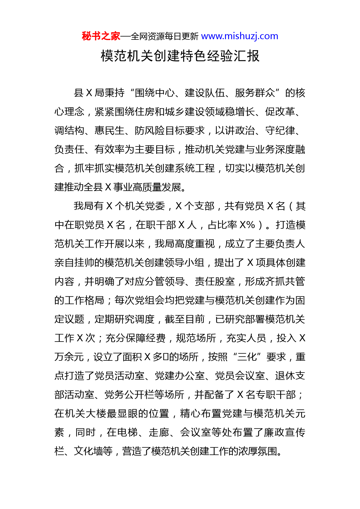 秘书之家—全网资源每日更新www.mishuzj.com模范机关创建特色经验汇报县X局秉持“围绕中心、建设队伍、服务群众”的核心理念,紧紧围绕住房和城乡建设领域稳增长、促改革、调结构、惠民生、防风险目标要求,以讲政治、守纪律、负责任、有效率为主要目标,推动机关党建与业务深度融合,抓牢抓实模范机关创建系统工程,切实以模范机关创建推动全县X事业高质量发展。我局有X个机关党委,X个支部,共有党员X名(其中在职党员X名,在职干部X人,占比率X%)。打造模范机关工作开展以来,我局高度重视,成立了主要负责人亲自挂帅的模范机关创建领导小组,提出了X项具体创建内容,并明确了对应分管领导、责任股室,形成齐抓共管的工作格局;每次党组会均把党建与模范机关创建作为固定议题,定期研究调度,截至目前,已研究部署模范机关工作X次;充分保障经费,规范场所,充实人员,投入X万余元,设立了面积X多㎡的场所,按照“三化”要求,重点打造了党员活动室、党建办公室、党员会议室、退休支部活动室、党务公开栏等场所,并配备了X名专职干部;在机关大楼最显眼的位置,精心布置党建与模范机关元素,同时,在电梯、走廊、会议室等处布置了廉政宣传栏、文化墙等,营造了模范机关创建工作的浓厚氛围。秘书之家—全网资源每日更新www.mishuzj.com为推动模范机关与业务深度融合,着力开展了六个行动,推动模范机关工作与X主责主业“双轮驱动”、“齐头并进”。第一,坚定信仰铸忠诚,全力打造“忠诚X”把牢忠诚可靠“领航标”,把加强党的政治建设贯穿于创建模范机关全过程,旗帜鲜明讲政治,切实增强机关政治功能,永葆政治本色。一是着力搅动干部思想。以“领”为先,强化政治引领,全面推行党组会“第一议题”制度,以领促学、以领强学;每次干部职工会议上,都会上一堂廉政教育课,教育干部职工认清新形势,把握新要求,将党纪条规刻印在党员干部心上,树牢规矩意识和纪律意识;组织学习各类违法违纪典型案例,切实发挥以案明纪、以案释警的作用,引导广大干部学廉、思廉、保廉,筑牢思想防线。二是着力服务中心大局。以服务中心工作统揽全局,将模范机关创建融入到全县发展大局,以创建带动发展。聚焦“三大战略、八大行动”、双“一号工程”等中心工作,大干项目、大抓落实,抓牢全县重点项目建设,不断完善基础设施建设,提升公共服务水平,实现城市服务功能和群众幸福指数“双提升”。三是着力提升能力素养。把推动工作高质量发展,作为模范机关创建的基本出发点和根本落脚点,精心开展党秘书之家—全网资源每日更新www.mishuzj.com务工作培训、“三进三为”(进帮扶乡村、进共建社区、进困难企业,为基层解难、为群众解忧、为企业纾困)八比八看(比思想,看谁的思想政治觉悟高;比学习,看谁政治理论和专业知识扎实;比责任心,看谁工作责任心更强;比业绩政绩,看谁业绩政绩和获得荣誉突出;比服务水平,看谁服务能力水平高、群众反映好;比作风,看谁工作高标准、严要求、作风好;比干劲,看谁工作积极干劲足;比廉洁自律,看谁遵守廉洁自律准则严)“将心比心、一线体验营商环境”“政企连心、亲清暖心”等活动,提升党员干部能力素质,崇尚先进模范,进一步激发全体干部职工先锋创绩的干事热情。第二,心系民生优服务,全力打造“惠民X”围绕中心、聚焦民生,发挥党组织及党员干部在城市功能提升、住房保障、城镇老旧小区改造等民生领域工作中的示范带头作用,提升群众的幸福感、获得感。一是大力推动城市功能与品质提升。重点聚焦出行难、上学难、就医难、如厕难、买菜难、停车难、休闲娱乐去处少等“城市病”问题,补齐功能配套与设施短板,不断丰富城市内涵、提升县城品位、增加县城亮点、完善城市功能,促进城市功能与品质提升三年行动圆满收官。二是稳步推进城市能级提升。深入贯彻落实“三大战略八大行动”战略部署,构建了“一办三组”组织架构体秘书之家—全网资源每日更新www.mishuzj.com系,实行“五个一”推进机制,扎实推进我县城市能级提升项目X个,综合排名位列全市前茅。三是全力推进棚户区改造收尾攻坚。完成历年剩余下来X户房屋征收攻坚任务,累计完成拆除建筑面积X千多平方米,为我县棚改土地房屋征收工作画上了圆满句号。四是着力抓好老旧小区改造。高度重视民生改善,坚持以人民为中心的发展理念,将老旧小区改造纳入保障性安居工程,提升群众生活品质。精品打造了“X”文化创意改造运营项目,实现了“三大转变”,打造成了新的消费、休闲聚集地,成功通过全市六大主攻方向流动现场会考核并获得上级好评。第三,正风肃纪强基础,全力打造“廉洁X”将模范机关与“五型政府”、勤廉兴国建设有机结合,坚持“预防在前、监督在实、监管在严”,构建内防+外控的防控体系,不断强化廉政建设,维护政治清明、推进部门清廉、实现干部清正、引领行业清朗。一是严格规范管理。出台了《X效能与作风建设责任追究办法(试行)》《X自律十不准》《关于严禁系统干部职工在房建和市政工程领域强揽工程强供建材等违法违规行为的十条措施》等规范性制度,全面规范履职行为;组织所有干部职工签订了《廉洁X承诺书》,要求所有干部要履行承诺,筑牢防线,守住底线;并对重点岗位人员及时秘书之家