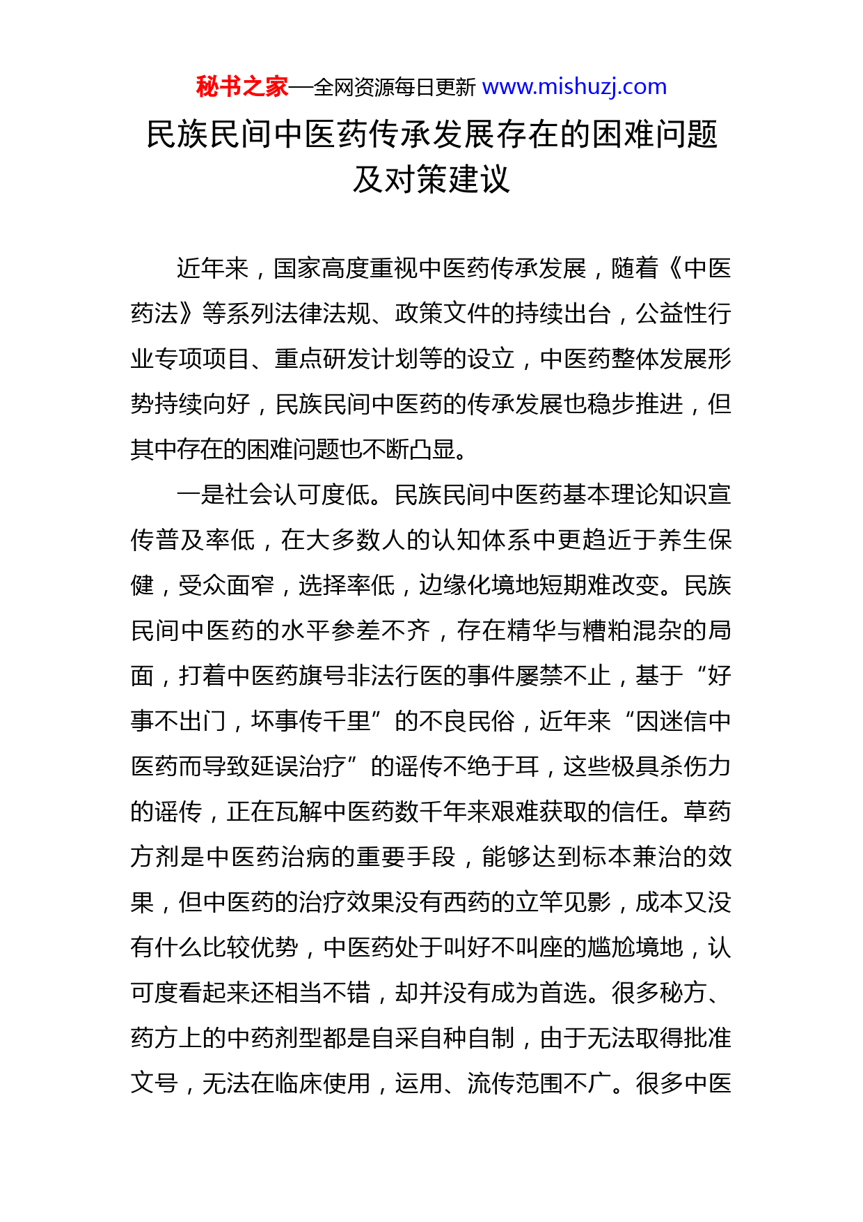 秘书之家—全网资源每日更新www.mishuzj.com民族民间中医药传承发展存在的困难问题及对策建议近年来,国家高度重视中医药传承发展,随着《中医药法》等系列法律法规、政策文件的持续出台,公益性行业专项项目、重点研发计划等的设立,中医药整体发展形势持续向好,民族民间中医药的传承发展也稳步推进,但其中存在的困难问题也不断凸显。一是社会认可度低。民族民间中医药基本理论知识宣传普及率低,在大多数人的认知体系中更趋近于养生保健,受众面窄,选择率低,边缘化境地短期难改变。民族民间中医药的水平参差不齐,存在精华与糟粕混杂的局面,打着中医药旗号非法行医的事件屡禁不止,基于“好事不出门,坏事传千里”的不良民俗,近年来“因迷信中医药而导致延误治疗”的谣传不绝于耳,这些极具杀伤力的谣传,正在瓦解中医药数千年来艰难获取的信任。草药方剂是中医药治病的重要手段,能够达到标本兼治的效果,但中医药的治疗效果没有西药的立竿见影,成本又没有什么比较优势,中医药处于叫好不叫座的尴尬境地,认可度看起来还相当不错,却并没有成为首选。很多秘方、药方上的中药剂型都是自采自种自制,由于无法取得批准文号,无法在临床使用,运用、流传范围不广。很多中医秘书之家—全网资源每日更新www.mishuzj.com医疗机构使用西药、做手术的比重非常大,甚至远远超过中医药的使用比例,多数中医医疗机构汤药使用率不高,中医药特色优势不明显。二是人才培养体系不健全。快节奏的生活让见效更为直接的西医成为了医学人才所热衷的学习领域,且民族民间中医药的理论内容和操作内容学习难度较大,新型人才难以涌入该领域,每年的中医药大学毕业生最终能成为合格中医药大夫的少之又少,许多技艺精湛的中医受限于学历、身份等诸多问题只能流于民间或基层。当前在培养民族民间中医药人才的过程中仍然是以西医人才培养模式为主,但西医和民族民间医学具有不同的特点,导致人才培养效果不理想。三是传承人才队伍老龄化严重。民族民间中医药技术的传承具有一定的私密性和传统性,很多民族民间中医药技术持有人年事已高,目前民族民间中医药事业中医师队伍普遍存在年龄结构偏大的问题,传承人多数在50岁到70岁之间,40岁以下的民族民间中医药从事人数少之又少,中医药类人才匮乏、从事中医药工作人员不能及时补员,不仅影响了民族民间中医药的传承,同时也导致民族民间中医药在发展过程中无法完成有效创新,对于后续民族民间中医药的长远发展造成了不利的影响。四是保护与开发不够。缺少有效保护民族民间中医药秘书之家—全网资源每日更新www.mishuzj.com技术持有人知识产权的手段,珍贵的中医秘方掌握在名老中医手里,既得不到有效的法律保护,对抗别人的侵权,也得不到有效的推广,更不可能产生规模效应。规范化治疗流程不健全,大多数民族民间中医药技术持有人对技术的关注点集中在医药技术的操作层面,理论基础、操作规范的提取、疗效的验证等均缺少深入研究,中医药曾经有着许多奇迹般治愈大病的案例,然而这些病例往往不可复制,同样的治疗方法和中药用在类似病症的患者身上,并不能取得相同的疗效,中医药在诊疗方法上的无序性,缺乏总结和延伸的能力,使得中医至今难以规模化应用。因此建议:一是提升社会认可度。把中医药文化贯穿国民教育始终,全面加强民族民间中医药文化研究阐发,统筹运用各级各类研究机构、高等院校、学术团体、行业行会协会等资源,推动民族民间中医药文化发展。全面加强民族民间中医药文化宣传普及,广泛开展以“中医中药中国行”主题活动为核心的群众性中医药文化传播活动,积极引导群众走进、认识、了解民族民间中医药,提供正确、安全、科学的民族民间中医药知识,促进社会进一步认识、接纳民族民间中医药,激发群众中医文化自信。依法依规强化监管,坚决打击非法行医和制售假药,“去伪存真”创造民族民间中医药生存与发展的良好环境,确保民族民间中秘书之家—全网资源每日更新www.mishuzj.com医药中医药健康发展。二是完善培养体系建设。加强顶层设计,推动地方立法,建立传承人档案,增加高校相关专业设置和招生规模,设立技艺传习馆、完善准入考核机制,建立高年资中医医师带徒制度、中医师承教育管理办法,建立早跟师、早临床学习制度,积极探索民族民间中医药与现代诊疗手段的融合途径,全面加强专业人才队伍建设。加强对高层次中医药专业技术人才的引进力度,及时补充新鲜血液。研究出台省级相关扶持政策,设立专项发展基金,组织开展民族民间中医药传承人认定、管理和使用工作,开展民族民间医药资源普查,收集整理单方验方,确保民族民间医药传承后继有人三是加强开发与保护。从各地实际出发,坚持疗效第一、病人认可的准入标准,探索实施区域性准入制度,改变民族民间中医准入办法“一刀切”现状,切实解决民族民间知名老中医的行医资格问题。鼓励开发中药制剂、剂型创新,适当放宽中医药制剂准入标准,扶持中药制剂的开发和使用。深化医保、价格、审批等改革,促进科技创新和开放交流,推动民族民间中医药高质量发展。加强民族民间中医药健康管理服务和技术规范培训,提升家庭医生签约服务团队民族民间中医药