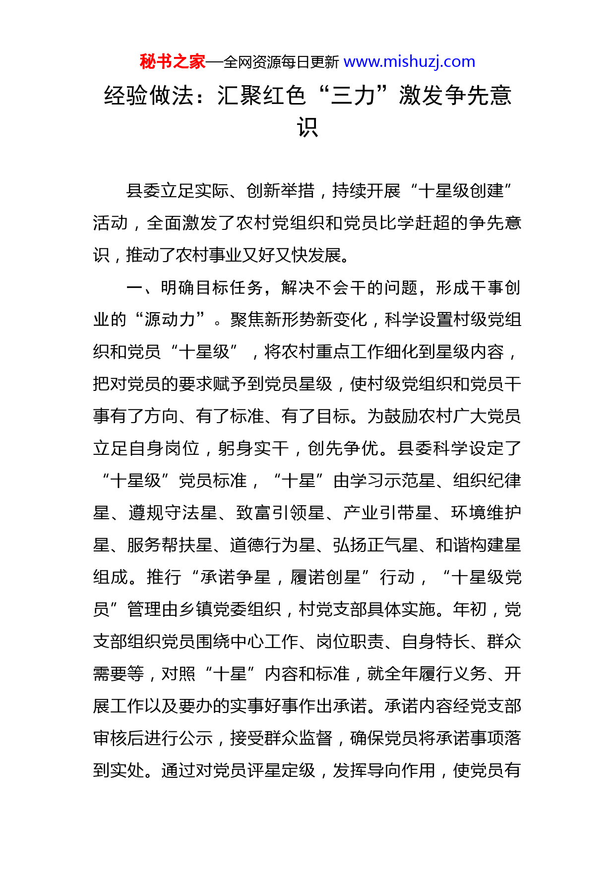 秘书之家—全网资源每日更新www.mishuzj.com经验做法:汇聚红色“三力”激发争先意识县委立足实际、创新举措,持续开展“十星级创建”活动,全面激发了农村党组织和党员比学赶超的争先意识,推动了农村事业又好又快发展。一、明确目标任务,解决不会干的问题,形成干事创业的“源动力”。聚焦新形势新变化,科学设置村级党组织和党员“十星级”,将农村重点工作细化到星级内容,把对党员的要求赋予到党员星级,使村级党组织和党员干事有了方向、有了标准、有了目标。为鼓励农村广大党员立足自身岗位,躬身实干,创先争优。县委科学设定了“十星级”党员标准,“十星”由学习示范星、组织纪律星、遵规守法星、致富引领星、产业引带星、环境维护星、服务帮扶星、道德行为星、弘扬正气星、和谐构建星组成。推行“承诺争星,履诺创星”行动,“十星级党员”管理由乡镇党委组织,村党支部具体实施。年初,党支部组织党员围绕中心工作、岗位职责、自身特长、群众需要等,对照“十星”内容和标准,就全年履行义务、开展工作以及要办的实事好事作出承诺。承诺内容经党支部审核后进行公示,接受群众监督,确保党员将承诺事项落到实处。通过对党员评星定级,发挥导向作用,使党员有秘书之家—全网资源每日更新www.mishuzj.com目标、有动力、有责任、有担当,切实把党员管理抓在日常,作用发挥融入平常。二、健全奖励机制,解决不想干的问题,激发比学赶超的“新活力”。全面推进乡村振兴使得村干部身上的责任和工作量越来越大,导致干部工作动力不足,积极性不高,县委将奖励激励赋予到“十星级创建”中,进一步激发干事创业活力,从而逐步提升村党员干部能力素质,打造“一支不走的驻村工作队”。一是科学评定考核。为让“十星级”党员考评工作更精准、更权威,充分发挥考评“指挥棒”作用,科学设定了考评程序,采取自下而上,上下结合的方式进行评定,按照“村党支部申请、乡镇党委推荐、县级联合审定、县委常委会审议、评选结果公示”程序开展。在县乡村三级民主测评过程中,加大乡镇的测评分值的比重。同时,在县级联合审定环节下功夫,成立以县委组织部、县委宣传部、农业农村局、乡村振兴局等部门的联合考核小组,对“十星级”党员党组织进行随机抽查,通过科学的量化考核和乡村民主测评,让评选结果更具有公信力。二是兑现奖励补贴。为大力提高村党组织和党员干事创业的积极性,激发创先争优活力,建立完善奖励机制,村党组织每夺一次“十星级”,为村党支部书记每月兑现X元、村委会副主任X元奖励补贴。活动开展以来,兑现村干部奖励补贴近X万元,表彰“十星秘书之家—全网资源每日更新www.mishuzj.com级”党员X人次,极大激发了农村党员干事创业的热情。三是强化典型选树。充分发挥典型的示范引领作用,隆重召开表彰大会,为“十星级”党员进行授牌和颁发荣誉证书,指导乡村两级开展表彰宣传活动,在村级活动室亮挂所获荣誉奖牌,组织“十星级”党员开展座谈会,谈体会感想,谈初心使命,激发了所有党员的共鸣。运用微信公众号平台等媒体,加大对“十星级”党员的宣传力度,在全县营造学先进、比先进、争先进的生动局面和浓厚氛围。三、强化推动举措,解决干不成的问题,打造村级发展的“硬实力”。一是夯实了党建根基。村党组织对照“十星级”标准,学习先进村的做法,抓班子、带队伍,强产业、增实力,拓街道、美环境,党员干部对照“十星级”标准,带头干、抢着干、务实干,带动群众建大棚,搞养殖,拆违章,修道路,群众的主人翁意识进一步增强,通过双手建设美丽家园、幸福家园的热情和干劲得到了有效激发,农村党组织战斗堡垒作用和党员先锋模范作用得到充分发挥。二是提升了治理水平。在“十星级创建”活动中,创新完善“村党组织-网格(村民小组)党支部(党小组)-党员联系户”的村党组织体系,开展乡村干部包片、“一对一”结对帮扶、党员承诺践诺活动,把服务管理责任落实到网格,实现网格化管理全覆盖。开展秘书之家—全网资源每日更新www.mishuzj.com“乡风文明进万家”系列教育活动,开展文明村民、“四德”建设,引导群众讲文明、树新风。举办道德讲堂,引导人们讲道德、守道德。举办文明家庭、最美家庭、好邻里、好婆媳、新乡贤等创建评选活动,发挥身边榜样示范带动作用,发挥道德感召力量,促进农村社会和谐稳定,涵养守望相助、崇德向善的文明乡风,实现基层社会治理能力和水平有效提升。三是优化了宜居环境。有力推动了农村环境卫生综合整治进度,依托党员干部责任区等载体,组织集中开展垃圾治理、围栏安装及民房美化等专项行动,解决乱搭乱放等突出问题。在党员干部的密切配合下,全县完成X个村屯污水治理和X户改厕任务,栽植绿化树木达X余万株,乡村生活环境更加宜居。
