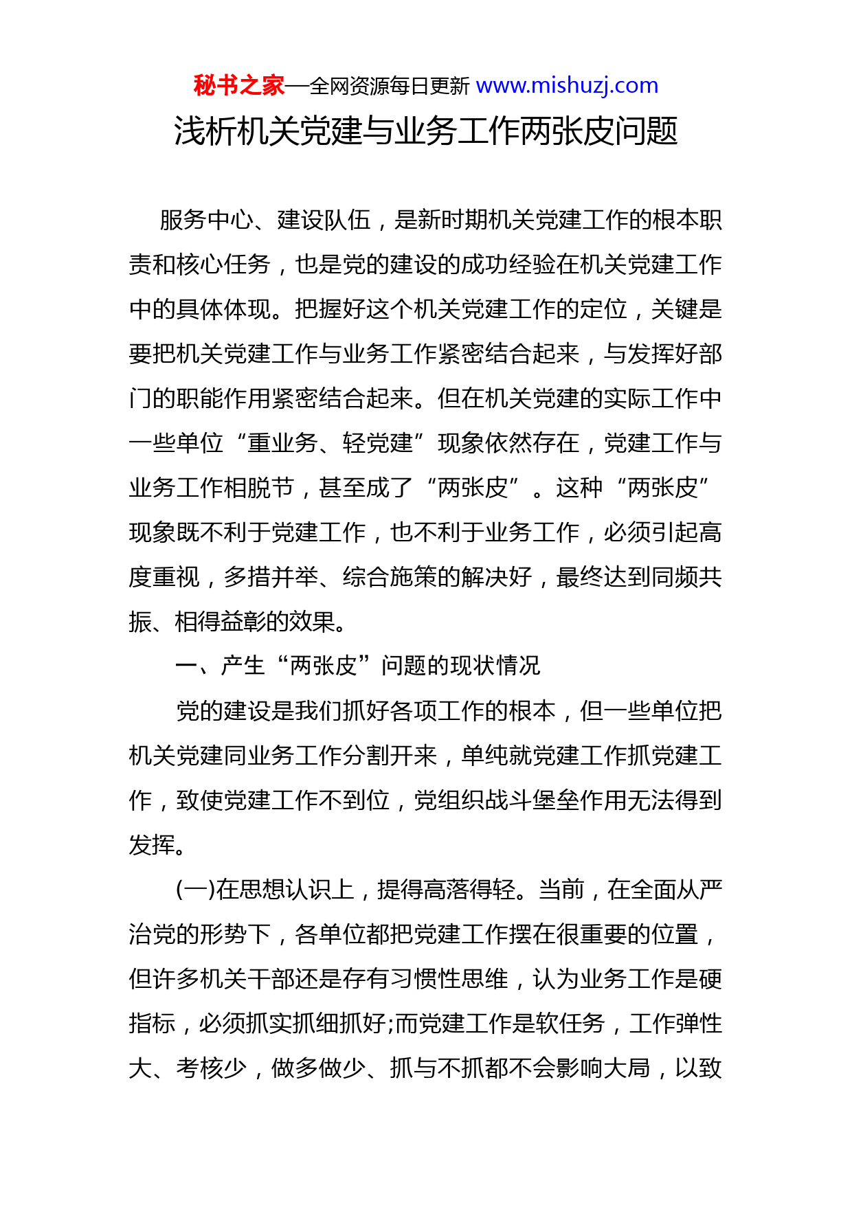 秘书之家—全网资源每日更新www.mishuzj.com浅析机关党建与业务工作两张皮问题服务中心、建设队伍,是新时期机关党建工作的根本职责和核心任务,也是党的建设的成功经验在机关党建工作中的具体体现。把握好这个机关党建工作的定位,关键是要把机关党建工作与业务工作紧密结合起来,与发挥好部门的职能作用紧密结合起来。但在机关党建的实际工作中一些单位“重业务、轻党建”现象依然存在,党建工作与业务工作相脱节,甚至成了“两张皮”。这种“两张皮”现象既不利于党建工作,也不利于业务工作,必须引起高度重视,多措并举、综合施策的解决好,最终达到同频共振、相得益彰的效果。一、产生“两张皮”问题的现状情况党的建设是我们抓好各项工作的根本,但一些单位把机关党建同业务工作分割开来,单纯就党建工作抓党建工作,致使党建工作不到位,党组织战斗堡垒作用无法得到发挥。(一)在思想认识上,提得高落得轻。当前,在全面从严治党的形势下,各单位都把党建工作摆在很重要的位置,但许多机关干部还是存有习惯性思维,认为业务工作是硬指标,必须抓实抓细抓好;而党建工作是软任务,工作弹性大、考核少,做多做少、抓与不抓都不会影响大局,以致秘书之家—全网资源每日更新www.mishuzj.com出现了“喊破了嗓子也没见动静”的局面。(二)在工作重心上,务实好务虚差。虽然同是工作,但一些领导干部认为业务工作是实打实的,抓好了成绩就易被看见被认可,自然而然便在业务工作上投入精力较多;党建工作比较虚、抓手少,难开展、难见效,便缺乏抓党建工作的积极性,甚至不乐意从事党建工作,以致党建工作经常处于被动状态,工作计划性和针对性不强,往往停留在完成上级交办任务的层面上。(三)在制度规范上,内容多作用小。虽然机关党建已经形成了民主生活会、党员思想政治教育、“三会一课”等制度,但这些制度往往只是挂在墙上、流于形式,即使开展了相关活动,作用发挥也不突出,以致不少单位经常以行政会议代替支部组织生活,对党员的思想教育和管理较少,难以引导党员发挥先锋模范作用,不能很好地发挥党建工作的优势。(四)在作用发挥上,信心有成效无。不少机关干部在最初从事党建工作时抱有很大的信心,但由于自身工作经历等原因,缺乏积极主动的融入意识,对业务工作变得不熟悉,对大局变得不了解,抓党建工作时也就不想找、找不到紧贴中心、服务大局的结合点、切入点和着力点,党组织的政治核心作用难以发挥,机关党组织实际上成了行政工作的附庸。秘书之家—全网资源每日更新www.mishuzj.com二、造成“两张皮”问题的原因分析机关党建与业务工作“两张皮”问题,综合起来分析主要有以下原因:(一)思想认识不全面,重业务轻党建。一些领导对党机关党建工作重要性认识不够,认为抓业务是“硬杠杠”,抓党建是“软指标”,在实际工作中有意无意都把业务工作摆在首位、向其倾斜,捎带脚儿的把党建工作抓一抓、干一干。有的对机关党建工作认识模糊、概念不清,认为党建工作主要在于发展党员,壮大党的队伍,与业务工作关系不大。有的对二者之间的关系理解不透、把握不准,认为机关各部门日常工作任务繁重、经常加班加点,机关党建工作过多、过频会影响业务工作的正常开展,容易引起矛盾、造成误解。以至于在实际工作中,满足完成规定动作,缺少相应自选动作,不围绕中心谋划党建,甚至出现了“说起来重要、做起来次要、忙起来不要”的现象,严重影响了机关党建工作的质量水平。(二)工作导向不聚焦,重形式轻实效。党建工作与业务工作在工作内容和特点上存在差异,党建工作主要是做人的工作,工作周期长,短时间内一般难以见到成效,业务工作主要是做事或物的工作,抓一抓就有效果,周期比较短。为此,一些机关在抓党建工作时为抓而抓,偏离了服务中心、建设队伍的核心任务,与业务工作相脱节、相割秘书之家—全网资源每日更新www.mishuzj.com裂甚至相排斥。在检查党建工作时,往往只注意过程、只注重“能看见的”,如今天要记多少笔记、明天要写多少心得体会、后天要参加哪个活动,而不注重效果,没有将新时期党建工作与业务工作进行统筹结合,经常是“更定各的调儿、各铺各的曲儿”,导致机关干部只是抱着应付的心态参与党建工作,致使党建工作存在“一般化”、“格式化”、“边缘化”等突出问题。(三)考核机制不健全,重显绩轻潜绩。在机关工作中,各级党政机关每年工作业绩的等级评定主要靠上一级指导机关制定的目标考核机制来实现,是硬任务、需要逗硬,业务工作都是围绕这根“指挥棒”开展,指标比例占重较高,完不成要挨批评、丢面子、打板子。党建工作是软指标,考核指标体系占比相对较低,存在干与不干一个样、干好与干坏一个样、主动干与被动干一个样、被动应付与改革创新一个样等问题。机关部门负责人作为“一岗双责”的兼职党务工作者,许多人业务工作任务非常重,年中年底都得考评,往往重行政身份,而党支部工作硬性考核目标相对较少,工作的优劣势难以用数值衡量,所以把大部分精力用在业务工作上,在党建上投入的时间和精力明显不足,难免存在“一手硬、一手软”的现象。(四)队伍建设不过硬,重使用轻培养。许多单位平时只管交待任务,只看工作结果,对党务干