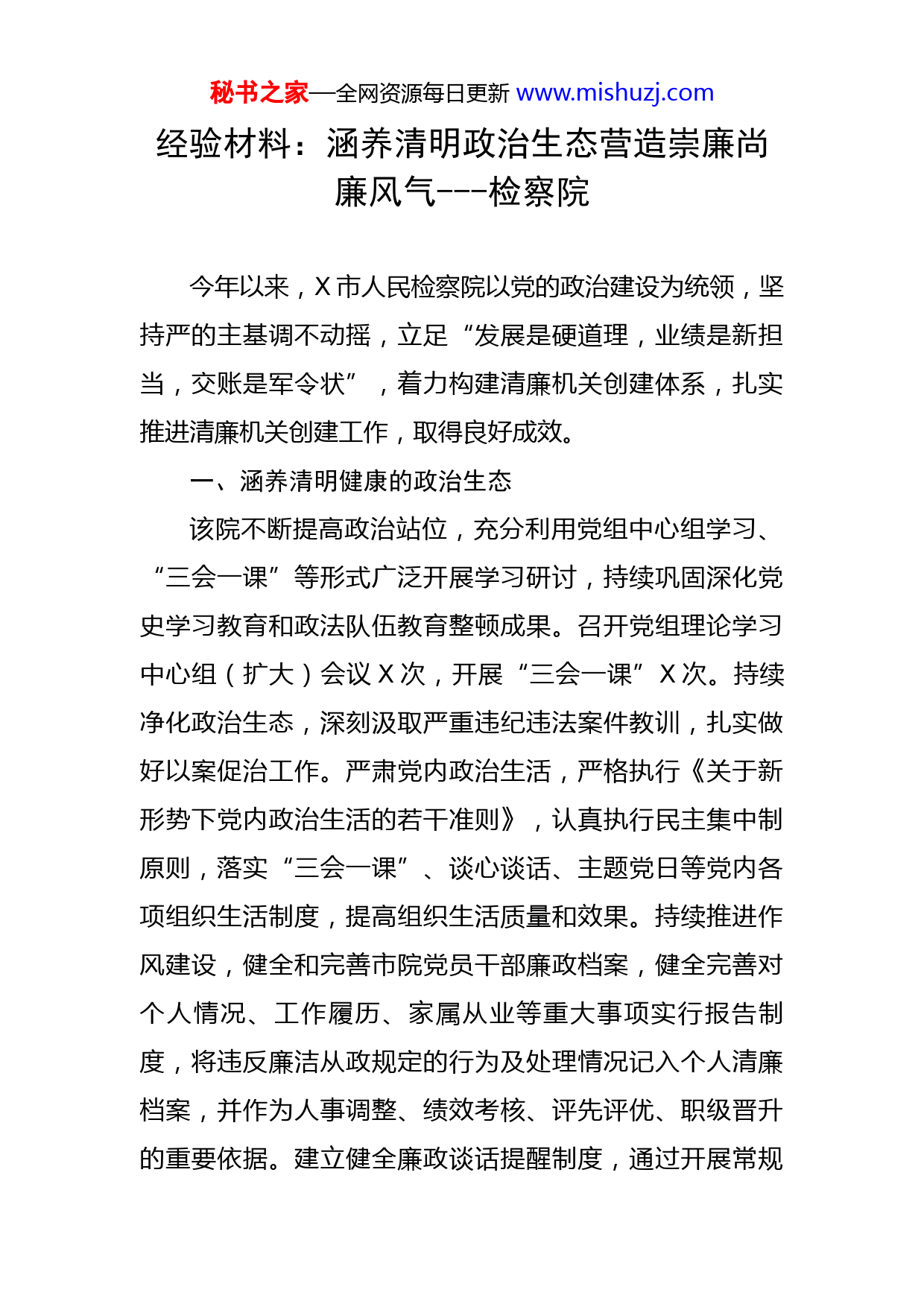 秘书之家—全网资源每日更新www.mishuzj.com经验材料:涵养清明政治生态营造崇廉尚廉风气---检察院今年以来,X市人民检察院以党的政治建设为统领,坚持严的主基调不动摇,立足“发展是硬道理,业绩是新担当,交账是军令状”,着力构建清廉机关创建体系,扎实推进清廉机关创建工作,取得良好成效。一、涵养清明健康的政治生态该院不断提高政治站位,充分利用党组中心组学习、“三会一课”等形式广泛开展学习研讨,持续巩固深化党史学习教育和政法队伍教育整顿成果。召开党组理论学习中心组(扩大)会议X次,开展“三会一课”X次。持续净化政治生态,深刻汲取严重违纪违法案件教训,扎实做好以案促治工作。严肃党内政治生活,严格执行《关于新形势下党内政治生活的若干准则》,认真执行民主集中制原则,落实“三会一课”、谈心谈话、主题党日等党内各项组织生活制度,提高组织生活质量和效果。持续推进作风建设,健全和完善市院党员干部廉政档案,健全完善对个人情况、工作履历、家属从业等重大事项实行报告制度,将违反廉洁从政规定的行为及处理情况记入个人清廉档案,并作为人事调整、绩效考核、评先评优、职级晋升的重要依据。建立健全廉政谈话提醒制度,通过开展常规秘书之家—全网资源每日更新www.mishuzj.com谈话、干部任前谈话、提醒谈话等,促使广大党员干部牢固树立勤政廉政意识。二、打造清正廉洁的干部队伍抓好队伍培养教育。制订科学合理的培训计划,积极参加上级组织的政治轮训和业务培训,全员完成“最高检领导干部业务讲座”“中检网”“好干部在线”等X门课程的线上学习。搭建“忻检大课堂”平台,每周五下午组织全体干警集中学习,大力推进学习型机关建设,努力提高检察干警的政治素质、业务能力、廉政意识。坚持理论联系实际、学以致用、注重实效的原则,探索多部门组团式、“订单式”培训和实战轮训,有针对性地解决队伍存在的各种问题,培养适应检察事业发展的高素质干部队伍。持续优化检察服务。充分运用检察职能,积极拓宽服务领域,努力解决群众反映、提出的“急难愁盼”问题。严格落实奖惩机制。健全完善考核考评机制,制定并印发《X市人民检察院检察人员考核实施细则(试行)》,对工作质效实行分级分类考核,将考核结果作为年终评优评先的依据,真正以考核激励担当者、约束慵懒者、鞭策无为者。三、构建清晰明朗的用权体系完善内部监督。完善院党组全面监督、机关党委日常秘书之家—全网资源每日更新www.mishuzj.com监督、党员群众民主监督和派驻纪检监察组专职监督的机关党内监督制度体系,实现党内监督全覆盖。围绕检察业务工作特点,深入开展办案廉政风险点排查,针对查找出的廉政风险点制定切实可行的风险防控措施和防控机制。强化检务督察,做好重大事项填报和违反“三个规定”情况报送工作,市院机关共主动记录报告过问或干预、插手检察办案等重大事项X件。同时坚持“三重一大”集体研究决策,主动征求派驻纪检监察组意见X次,强化人、财、物等重要环节的监督制约。持续正风肃纪。抓好中央八项规定及其实施细则的贯彻落实,防范“四风”隐形变异新动向,对享乐主义、奢靡之风做到露头就打,坚决整治形式主义和官僚主义,创新作风建设制度运行机制,用好监督执纪“四种形态”,早提醒、早纠正。四、营造崇廉尚廉的机关风气打造清廉文化阵地。充分利用现有党员活动室、机关文化墙、宣传栏、LED显示屏、微信公众号等资源,结合检察文化建设,将“廉洁”元素融入检察工作各个“角落”,营造风清气正的廉洁文化氛围,让党员干部在日常工作中可以“抬头受教育,低头有感悟”,不断凝聚建设清廉机关的强大合力。开展清廉文化活动。创新清廉文化活动形式,通过政治学习、专题党课等形式,丰富党员干部清廉文化生活,秘书之家—全网资源每日更新www.mishuzj.com增强清廉价值认同感和行动自觉性。结合“清廉X”建设和主题党日活动内容,组织机关党员参观廉政教育基地、观看廉政教育电影、上廉政党课等共计X次。营造清廉文化氛围。为充分发挥家庭在预防和抵制腐败方面的作用,通过微信公众号向全院检察干警家属发出《清风徐来·廉以致远》的公开信,倡导广大干警家属当好“廉参谋”“廉伴侣”“廉管家”。邀请干警家属代表召开家庭助廉座谈会并签订《家庭助廉承诺书》。市院检务督察局在重大节假日前发出廉洁提醒,共同营造建设清廉机关的浓厚氛围。