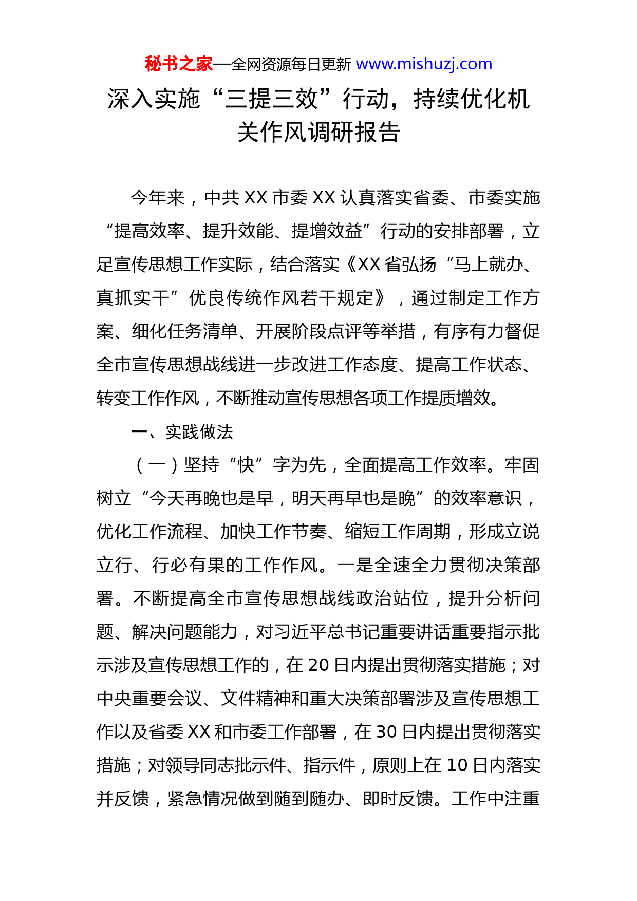 秘书之家—全网资源每日更新www.mishuzj.com深入实施“三提三效”行动,持续优化机关作风调研报告今年来,中共XX市委XX认真落实省委、市委实施“提高效率、提升效能、提增效益”行动的安排部署,立足宣传思想工作实际,结合落实《XX省弘扬“马上就办、真抓实干”优良传统作风若干规定》,通过制定工作方案、细化任务清单、开展阶段点评等举措,有序有力督促全市宣传思想战线进一步改进工作态度、提高工作状态、转变工作作风,不断推动宣传思想各项工作提质增效。一、实践做法(一)坚持“快”字为先,全面提高工作效率。牢固树立“今天再晚也是早,明天再早也是晚”的效率意识,优化工作流程、加快工作节奏、缩短工作周期,形成立说立行、行必有果的工作作风。一是全速全力贯彻决策部署。不断提高全市宣传思想战线政治站位,提升分析问题、解决问题能力,对习近平总书记重要讲话重要指示批示涉及宣传思想工作的,在20日内提出贯彻落实措施;对中央重要会议、文件精神和重大决策部署涉及宣传思想工作以及省委XX和市委工作部署,在30日内提出贯彻落实措施;对领导同志批示件、指示件,原则上在10日内落实并反馈,紧急情况做到随到随办、即时反馈。工作中注重秘书之家—全网资源每日更新www.mishuzj.com联系实际主动抓好落实,对各项工作贯彻落实情况进行半年专题研究,年度分析总结,力求各项工作办结速度快、完成质量高。二是实时处置意识形态风险。不断筑牢意识形态阵地,加强政治谣言和错误思潮的涉意识形态风险监测评估预警,发现风险苗头及时报告并做好处置,涉及重大风险隐患第一时间向省委XX和市委报告。针对重大突发事件敏感舆情,及时启动应急响应,组建工作专班,动态会商研判,迅速做好信息发布、舆论引导工作,密切监测各类案件线索,重点线索10日内完成核查,一般线索30日内完成核查,并及时处置到位,牢牢把握意识形态领域主导权。三是建立健全快速推进机制。坚持要事即办、急事快办、特事特办,做到“文件不过夜、办事不隔天”。对重点任务实施清单管理、限时办理、定期调度,建立“每月一汇总、每季度一调度、每半年一汇报”制度,由责任单位科室每月报送一次进展情况,分管领导每季度召开分析会,每半年向部务会汇报一次落实情况。系统梳理宣传思想文化领域难题积案,建立问题清单、责任清单、整改清单,挂图作战销号,杜绝“悬账”“赖账”。实施流程再造,专项工作实施扁平化管理,促进工作效率大幅提升。(二)坚持“优”字为要,全面提升服务效能。积极创新思维方式和工作方法,抓住宣传思想文化工作的“牛秘书之家—全网资源每日更新www.mishuzj.com鼻子”,最大限度释放潜能、激发动能。一是抓紧关键业务。由部办公室牵头,按照《2022年宣传思想工作要点》及任务分工方案,不断建立健全专班推进和专项督办机制。围绕迎接、宣传、贯彻党的二十大,推动理论舆论、文化文明、内宣外宣、网上网信等相贯通,营造浓厚氛围。以建设“XX省习近平新时代中国特色社会主义思想研究中心中共XX市委XX实践基地”为契机,健全完善理论武装工作体系,打造研究、阐释、宣介新思想的“重要高地”。以构建XX文化标识体系为抓手,横向促进闽北红色文化、朱子文化、“福”文化等特色文化相得益彰,纵向推动理论研究、保护传承、宣传推介、产业发展相互促进,打响XX特色文化品牌。二是抓实改革创新。全面推进工作理念、内容建设、话语体系、体制机制创新,不断激发文化改革发展活力,带动公共文化服务、媒体融合发展、文化旅游融合等领域改革向纵深推进,推动文旅强市建设提质增效、开创新局。三是抓牢争先创优。对党中央的决策部署和省委、市委的工作要求迅速行动、率先落实,对宣传思想工作的前沿领域大胆探索,以争先的实际行动实现创优的最好结果。力争在强化理论武装、壮大主流舆论、筑牢意识形态阵地、繁荣文化产业、文化事业、弘扬践行社会主义核心价值观、落实疫情防控、开展文明城市创建等方面较好发挥“举旗帜、聚民心、育新人、兴秘书之家—全网资源每日更新www.mishuzj.com文化、展形象”的重要作用。(三)坚持“实”字为本,全面提增发展效益。巩固宣传思想工作基层基础,挖掘多重效益、提升综合效益,推动宣传思想文化工作实现新发展、再上新台阶。一是做大做强文化产业。促进文化与相关产业融合发展,推动形成产业结构合理、优势突出、特色鲜明的高质量现代文化产业体系和市场体系。深挖文旅“富矿”,做大做强做优文旅经济,推动闽北文化全链条旅游要素,建设全域生态旅游市。二是用好用活宣传阵地。建强用好新时代文明实践中心、县级融媒体中心和“学习强国”学习平台,盘活传统宣传阵地,推动“数字农家书屋”“数字农村广播”“数字电影放映”提档升级,切实打造一批新型公共文化空间,让各阵地发挥最大效应。三是夯实筑牢基层基础。深化《中国共产党宣传工作条例》贯彻落实,加强宣传思想文化领域法治建设,推动各项工作在法治轨道上运行。围绕迎接党的二十大开展调研,引导全战线深入基层、深入群众、深入一线。加强全战线理论武装,深化“四力”教育实践,努力打造一支政治过硬、本领高强、求实创新、能打胜仗的宣传思想工作队伍。