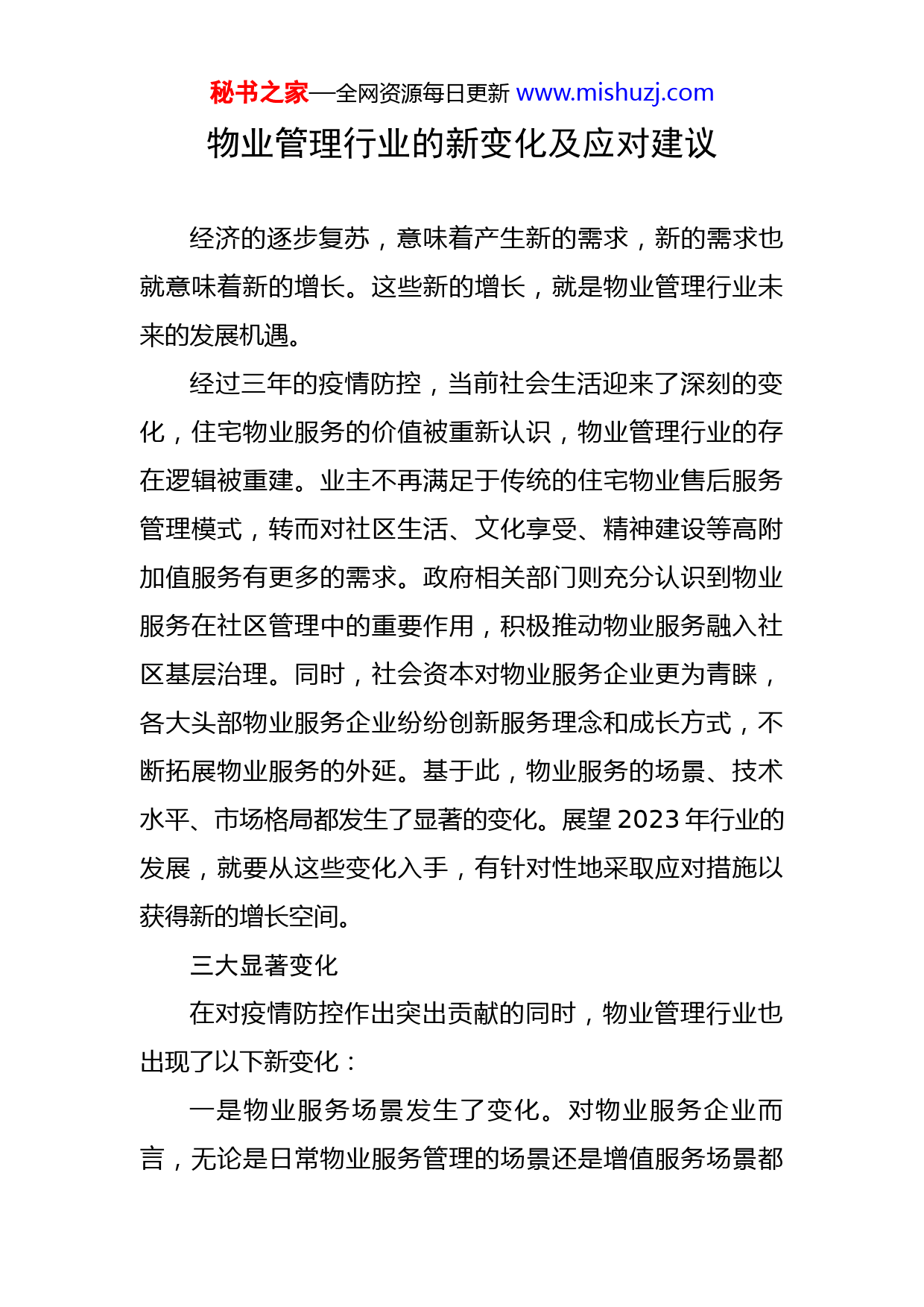 秘书之家—全网资源每日更新www.mishuzj.com物业管理行业的新变化及应对建议经济的逐步复苏,意味着产生新的需求,新的需求也就意味着新的增长。这些新的增长,就是物业管理行业未来的发展机遇。经过三年的疫情防控,当前社会生活迎来了深刻的变化,住宅物业服务的价值被重新认识,物业管理行业的存在逻辑被重建。业主不再满足于传统的住宅物业售后服务管理模式,转而对社区生活、文化享受、精神建设等高附加值服务有更多的需求。政府相关部门则充分认识到物业服务在社区管理中的重要作用,积极推动物业服务融入社区基层治理。同时,社会资本对物业服务企业更为青睐,各大头部物业服务企业纷纷创新服务理念和成长方式,不断拓展物业服务的外延。基于此,物业服务的场景、技术水平、市场格局都发生了显著的变化。展望2023年行业的发展,就要从这些变化入手,有针对性地采取应对措施以获得新的增长空间。三大显著变化在对疫情防控作出突出贡献的同时,物业管理行业也出现了以下新变化:一是物业服务场景发生了变化。对物业服务企业而言,无论是日常物业服务管理的场景还是增值服务场景都秘书之家—全网资源每日更新www.mishuzj.com发生了巨大的变化。在社区日常物业服务场景方面,除了业主传统认知的“四保”服务外,物业服务企业还加强了对相关公共场所例如电梯、垃圾桶、社区进出口等公共易感空间的管理,物业服务各岗位的工作相应作了调整,例如保洁服务人员,在保障社区环境整洁的同时增加杀菌消毒等相关职能,秩序维护人员增加了测温和人流控制的职能。同时相关突发事件的应急管理防控体系也在逐步建立当中。在增值物业服务场景方面,各大物业服务企业通过各自的APP方便业主购买基本生活物资、防疫物资等,并提供送货上门服务,受到了业主的肯定与称赞,这已成为部分物业服务企业新的业绩增长点。二是技术水平发生了变化。疫情期间,封闭式管理成为小区常态,线上服务、无接触服务等成为新的风口,可以说,疫情催化了智慧物业的加速发展。例如碧桂园服务构建起一个“项目-单位-企业”三级监管的疫情数据每日报告系统,可以线上实时监测疫情防控工作情况。通过技术手段,物业服务企业对个人信息的收集更为精确和细化,有效提高了交流与咨询服务的效率。绿城服务的智能社区服务平台已上线“园区居民行程采集”等问卷调查工具,已累计接收近两万个问题反馈。三是市场竞争格局发生了变化。物业管理行业的市场竞争格局出现了全新的转变,逐渐呈现强者恒强的局面,秘书之家—全网资源每日更新www.mishuzj.com“强者”不断扩展的服务能力与业务拓展能力也加速了“大鱼吃小鱼”的情况。据不完全统计,仅2021年1月,中国各大挂牌物业服务企业就发布了15起收并购。行业收并购的加速,既表明了物业管理行业竞争的残酷性,更表明了行业洗牌速度的加快。在这一趋势下,物业管理行业的竞争更加激烈,服务质量、服务能力、品牌影响力等成为企业立足市场的关键制约因素,企业和企业之间的差异化进一步加剧,行业两极分化明显。对未来发展的五条建议新变化下蕴藏的是产业高速生长的新机遇。在这一重大战略机遇期,对于如何进一步推进行业的转型升级,笔者提出以下建议:一是把握社区增值服务的窗口期。当前,随着业主对物业服务感知度的增加,业主不仅认识到物业服务的重要性,也逐步养成了购买服务的习惯。业主生活方式的改变对物业服务企业的经营模式将产生深远影响,社区增值业务有望迎来高速发展时期。我们认为,物业服务企业应积极布局多元化业务,增强自己在社区网络平台的运营能力,利用轻资产模式不断嫁接新型服务来获得收入的进一步提升,如电商业务、房屋经纪、社区养老等。同时,通过大数据等先进的技术手段对业主的需求进行精准定位,增强业主对物业平台的黏性,整合外部商家与垂直电商在秘书之家—全网资源每日更新www.mishuzj.com社区内部的业务协同,开启社区商业增值服务新局面,有效带动业主消费。二是重塑物业服务价值。当前,物业服务企业要通过重构服务方式和服务内容的方式重塑服务价值。首先,物业服务企业应着力建设“物业服务+生活服务”的整体服务框架,把握5G、大数据等技术红利,以智慧化转型驱动企业管理方式、服务方式、治理方式的转变;其次对内开展相关标准化建设,提升自身服务水平,对外拓展物业服务的外延,切入城市服务、乡村治理等公共服务领域,提升行业发展空间;最后,物业服务企业要尽力营造温馨的服务场景和人文场景,并提供有温度的客户服务,不断探索共治、共建、共享模式。三是构建全产业链的生态圈。针对物业服务场景的改变,物业服务企业要兼顾科技与业务的双重驱动,集成各行业的技术资源,以互联网思维做产业链整合,构建物业服务全产业链生态圈。首先,利用互联网技术在社区到家服务、电子商务等方面营造互动场景体验;其次,针对业主需求营造个性化的定制服务,以及便捷高效的24小时服务;最后,针对健康、绿色环保、智能家居需求的不断增加,物业服务企业可以在精神健康、医疗服务、居家养老、运动出行、金融等层面与业主进行积极互动,构建一个健康生活场域,服务业主的全生命周期,满足老人、孩秘书之家—全网资源