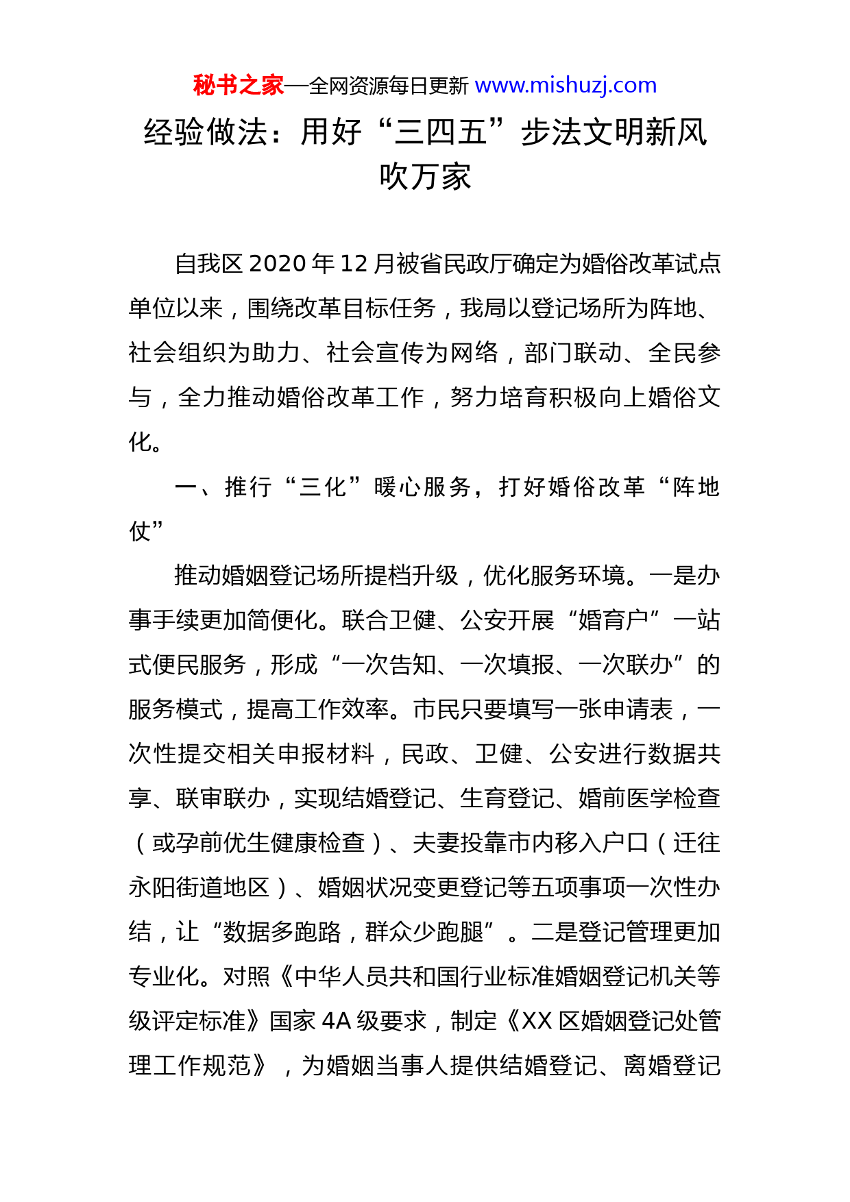 秘书之家—全网资源每日更新www.mishuzj.com经验做法:用好“三四五”步法文明新风吹万家自我区2020年12月被省民政厅确定为婚俗改革试点单位以来,围绕改革目标任务,我局以登记场所为阵地、社会组织为助力、社会宣传为网络,部门联动、全民参与,全力推动婚俗改革工作,努力培育积极向上婚俗文化。一、推行“三化”暖心服务,打好婚俗改革“阵地仗”推动婚姻登记场所提档升级,优化服务环境。一是办事手续更加简便化。联合卫健、公安开展“婚育户”一站式便民服务,形成“一次告知、一次填报、一次联办”的服务模式,提高工作效率。市民只要填写一张申请表,一次性提交相关申报材料,民政、卫健、公安进行数据共享、联审联办,实现结婚登记、生育登记、婚前医学检查(或孕前优生健康检查)、夫妻投靠市内移入户口(迁往永阳街道地区)、婚姻状况变更登记等五项事项一次性办结,让“数据多跑路,群众少跑腿”。二是登记管理更加专业化。对照《中华人员共和国行业标准婚姻登记机关等级评定标准》国家4A级要求,制定《XX区婚姻登记处管理工作规范》,为婚姻当事人提供结婚登记、离婚登记秘书之家—全网资源每日更新www.mishuzj.com“四个一”服务,进一步规范婚姻登记,从初审、受理、审查、登记、颁证“一条龙”服务,全面提升了婚姻登记服务能力和管理水平,更好地为百姓服务。今年截至12月3日共办理婚姻登记4847件,其中结婚2835件,离婚952件,补办结婚登记983对,补办离婚登记77对,登记合格率均达100%。三是窗口服务更加人性化。要求工作人员积极转变服务理念,变被动服务为主动服务、微笑服务,积极打造群众满意优质窗口。婚姻登记处专门安排一名接待人员,审核材料的同时帮助办事群众免费复印身份证、户口本等材料;印制《XX区婚姻登记预约服务温馨提示》《XX区婚姻登记处一次性告知书》《离婚登记流程、需知》等,让办事群众对所需资料及流程一目了然,避免资料不齐而多次跑路的情况,大厅“填表区”设立了各种表格样表及“自助取表栏”,方便群众填写相关表格。二、实现“四动”多元联合,绘制婚俗改革“施工图”整合资源,搭建平台,确保婚俗改革有序推进。一是强化民政主抓推动。加快打造具有XX特色的“婚俗馆”,为婚俗改革、婚姻家庭教育增添平台载体;依托我区旅游资源,打造启用“户外颁证基地”,让婚姻文化延伸至农村;将婚俗改革工作纳入区对街镇考核任务,充分调动镇秘书之家—全网资源每日更新www.mishuzj.com街参与的积极性,将软任务变成硬指标,在全区营造积极创建婚俗改革试验区的良好氛围,全域持续推进婚俗改革。二是突出部门协调互动。联合宣传部、组织部、纪委、妇联等部门,常态化开展“最美金婚”、“最美家庭”、好家风好家训评选,开展青年职工相亲、婚恋交友活动,并多渠道、全媒体开展“我的婚姻家庭故事”“我的婚礼我做主”等系列主题文章照片征集活动。从机关青年入手,签订婚俗改革承诺书。设置特色婚姻辅导课堂,经常性送课进机关。三是注重上下有机联动。将婚俗改革触角延伸至镇街、社区,在镇街建立婚俗、家庭文化宣教阵地、组织;在社区设立“婚姻调解室”。发挥112个村(居)红白理事会等村民自治组织和乡贤等作用,将婚丧礼俗工作写入村规民约、社区公约,倡导广大群众不讲排场、不搞攀比、文明节俭办婚丧,杜绝天价彩礼,引导群众移风易俗,树立文明新风。四是引导社会参与行动。加强新媒体运用,多形式多角度多方面扩大宣传教育范围,采取“互联网+”模式,借助“微XX”、微信群、网格直播等方式,在群众中宣传婚俗改革理念,宣传婚姻家庭的责任和义务、婚姻生活中“情绪管理”、“夫妻智慧”等知识。11月27日,我局举行了“放大幸福,传递浪漫”夫妻婚姻家庭主题文艺直播演出,线上观看达3400余人次,反响良好。秘书之家—全网资源每日更新www.mishuzj.com三、丰富“五项”内涵举措,提升婚俗改革“含金量”多措并举,一步一个脚印,拓展延伸婚俗改革成效。一是党员带头作示范。要求各级党员干部特别是领导干部,发挥示范引领作用,带头宣传倡导移风易俗,带头文明节俭办婚丧,自觉抵制陈规陋习和大操大办,将文明节俭办婚丧列入党员干部日常考核内容,实行党员干部婚丧事宜报备制度,加大对违规行为的处理力度。二是婚姻辅导再深化。在婚姻登记处设立婚姻家庭辅导室,引进社会组织参与,通过购买服务实现婚姻家庭辅导专业化,向婚姻当事人宣传法律法规,普及和谐婚姻家庭知识,同时也为有需求的离婚当事人提供心理辅导,减少冲动离婚,实行以来我区离婚率明显下降,与去年同期相比,下降近44.5%。联合妇联、法院等部门,不定期邀请名师、专家、志愿者进社区、企业开展婚姻家庭健康辅导讲座和家庭活动,积极倡导现代文明的幸福和谐婚姻家庭理念。今年以来我区已开展各类婚姻家庭辅导、活动20余场。三是文明礼仪常倡导。健全由区级部门主要领导、社会知名人士、金婚夫妇和劳模等组成的XX区结婚登记特邀颁证嘉宾库,将集体颁证活动常态化,通过引导婚姻当事人宣读结婚誓言、颁发结婚证,在庄重神圣的仪式中宣告婚姻缔结,让当事人感悟铭记婚姻家庭蕴含的责任担当,今年受秘书之家—全网资源每日更新www.mishuzj.com疫情影响,我区开展集体颁证活动