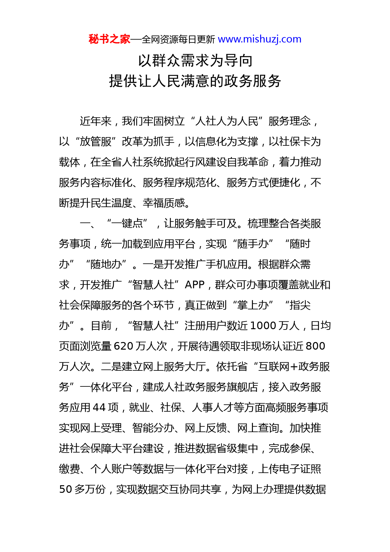 秘书之家—全网资源每日更新www.mishuzj.com以群众需求为导向提供让人民满意的政务服务近年来,我们牢固树立“人社人为人民”服务理念,以“放管服”改革为抓手,以信息化为支撑,以社保卡为载体,在全省人社系统掀起行风建设自我革命,着力推动服务内容标准化、服务程序规范化、服务方式便捷化,不断提升民生温度、幸福质感。一、“一键点”,让服务触手可及。梳理整合各类服务事项,统一加载到应用平台,实现“随手办”“随时办”“随地办”。一是开发推广手机应用。根据群众需求,开发推广“智慧人社”APP,群众可办事项覆盖就业和社会保障服务的各个环节,真正做到“掌上办”“指尖办”。目前,“智慧人社”注册用户数近1000万人,日均页面浏览量620万人次,开展待遇领取非现场认证近800万人次。二是建立网上服务大厅。依托省“互联网+政务服务”一体化平台,建成人社政务服务旗舰店,接入政务服务应用44项,就业、社保、人事人才等方面高频服务事项实现网上受理、智能分办、网上反馈、网上查询。加快推进社会保障大平台建设,推进数据省级集中,完成参保、缴费、个人账户等数据与一体化平台对接,上传电子证照50多万份,实现数据交互协同共享,为网上办理提供数据秘书之家—全网资源每日更新www.mishuzj.com支持。三是创新开展线上服务。积极应对疫情影响,搭建线上就业服务平台,开发推广“湘就业”微信公众号,开展线上“春风行动”,举办“同心战疫、在线湘约”网上公益招聘月活动,共上线企业7800多家,累计发布岗位150多万个,1500多万人次通过线上查询或求职,实现“就业服务不打烊,网上招聘不停歇”,有力促进了企业复工和农民工返岗。二、“一卡通”,让服务拓展延伸。加快推进社保卡发行和应用,健全服务功能、优化服务体验,把社保卡打造成为群众“记录一生、保障一生、服务一生”的暖心卡。一是加快推进扩面发卡。全面放开银行准入,参与全省社保卡建设的银行由12家增加到18家,最大限度方便群众用卡。迅速启动第三代社会保障卡发行,全省社会保障卡持卡人数达到6000万人,覆盖87.01%的常居人口。加快签发电子社保卡,签发渠道拓展到22个,APP客户端累计签发电子社保卡664万张。二是全面推广即时制卡。针对群众反映办卡难、周期长的突出问题,开展社会保障卡即办服务,上线即时制卡网点1240个,将制卡周期由原来的3个月缩短到10分钟左右,基本实现了省内跨地区跨银行“立等可取”。三是大力推进社保卡应用。立足“一卡多用”总目标,开展102项具体应用,广泛用于跨省异地就医直接结算、养老保险待遇发放,部分地区还通秘书之家—全网资源每日更新www.mishuzj.com过社保卡发放惠农补贴、困难人员救助补贴、在职人员工资等。日前,为方便劳动者返岗复工,在电子社保卡加载“防疫健康信息码”服务,帮助实现防疫健康核验。三、“一单清”,让服务简洁明了。在权力清单和责任清单基础上,创新建立行政审批和公共服务事项清单,让群众明白办、就近办。一是梳理服务事项。根据法律法规赋予的职责,清理取消2项行政审批事项,梳理明确人社领域行政审批事项8项、公共服务事项199项,逐项确定事项名称、事项编码、办理层级、设定依据,摸清“家务”,亮出“家底”。二是下放办事权限。坚持应放尽放,将劳务派遣许可、人力资源服务许可、特殊工时审批、机关事业单位工勤技能岗位考核、劳动能力初次鉴定等事项下放市县办理。清理的199项公共服务事项中,省级可办166项、市级可办196项、县级可办186项,与群众密切相关的41项常规事项可在乡镇(街道)和村(社区)办理。三是优化办理流程。对每一事项进行流程优化,编制办事指南,明确在申请、受理、审查、决定等各个环节的工作内容、服务标准、工作时限等要素,最大程度减环节、减材料、减时限,职业资格证书核发、劳务派遣许可、特殊工时审批办结时限均缩短50%以上。四、“一次办”,让服务提速增效。从用户体验角度进一步合并办理事项,推进服务事项进窗口,实现“一窗秘书之家—全网资源每日更新www.mishuzj.com受理、集成服务、一次办结”。一是推行“一件事一次办”。聚焦群众眼中的“一件事”,将“我要办理社保卡”等17件“事”纳入省政府“一件事一次办”改革内容,占全省200件“事”的8.5%,17项改革任务均实现办事“一门进、一窗办、一次结”。将程序相近、材料相同、结果关联的“多件事”整合为“一件事”,如单位参保人员断档补缴涉及的修改建账时间、补缴打单、登账、开具收据等4个环节作为“一件事”办理。二是推进服务事项窗口办。积极配合省政府政务服务中心办事大厅建设,成立“厅政务服务和行风建设工作专班”,配备骨干力量,加快推进“三集中三到位”改革要求,推进政务服务事项进驻省政府政务服务中心。目前,按照“应入尽入”原则,梳理事项102项,拟在省政府政务服务中心办事大厅设立40个办理窗口,推动实现“前台综合受理、后台分类审批、窗口统一出件”。三是推动协同事项并联办。主动协同配合省直有关部门,推动部门间共同办理事项程序无缝衔接、数据实时共享,实现联办通办。积极推进商事制度改革,落实“多证合一、一照一码”登记制,社保登记在企业设立时即与市场监管部门共享信息自动完成,自2016年9月实