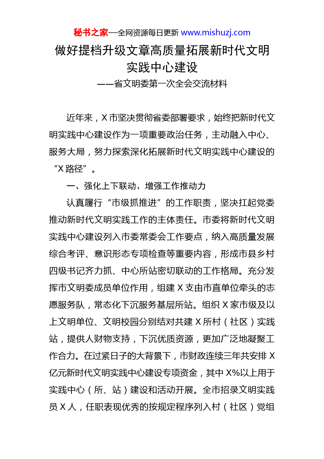 秘书之家—全网资源每日更新www.mishuzj.com做好提档升级文章高质量拓展新时代文明实践中心建设——省文明委第一次全会交流材料近年来,X市坚决贯彻省委部署要求,始终把新时代文明实践中心建设作为一项重要政治任务,主动融入中心、服务大局,努力探索深化拓展新时代文明实践中心建设的“X路径”。一、强化上下联动、增强工作推动力认真履行“市级抓推进”的工作职责,坚决扛起党委推动新时代文明实践工作的主体责任。市委将新时代文明实践中心建设列入市委常委会工作要点,纳入高质量发展综合考评、意识形态专项检查等重要内容,形成市县乡村四级书记齐力抓、中心所站密切联动的工作格局。充分发挥市文明委成员单位作用,组建X支由市直单位牵头的志愿服务队,常态化下沉服务基层所站。组织X家市级及以上文明单位、文明校园分别结对共建X所村(社区)实践站,提供人财物支持,下沉优质资源,更加广泛地凝聚工作合力。在过紧日子的大背景下,市财政连续三年共安排X亿元新时代文明实践中心建设专项资金,其中X%以上用于实践中心(所、站)建设和活动开展。全市招录文明实践员X人,任职表现优秀的按规定程序列入村(社区)党组秘书之家—全网资源每日更新www.mishuzj.com织书记后备人选,真正做到有机构管事、有专人干事、有经费办事。二、因地制宜整合、增强资源统筹力将新时代文明实践中心融入经济社会发展大局,作为巩固脱贫攻坚成果、助推乡村振兴、实现共同富裕的重要抓手,通过整合各方面人员、资金、平台、项目等资源,实现场地相对集中布局、功能集合构建、资源集聚壮大,发挥1+1>2的倍增效应,更好地为广大群众服务。重点盘活老祠堂、老“村部”、闲置“教学点”等场所,推动党群服务中心、新时代文明实践站、综合文化服务中心、农家书屋、综治中心等村级阵地有效整合,打造“党群服务+文明实践”综合体。截至目前,辖区X个县(市、区)均已建立新时代文明实践中心,X%的乡镇(街道)建成实践所,X%的村(社区)建成实践站。坚持群众在哪里、文明实践就推进到哪里,打造了一大批“不设墙”的新时代文明实践广场、公园、基地,不断延伸新时代文明实践领域。三、聚焦群众需求、增强活动吸引力充分利用线上线下各种手段广泛收集群众意见,依托省点单平台,建立群众喜爱的活动“菜单”和项目。调动“草根明星”、文艺骨干、乡土能人的积极性,在活动组织上编排群众自导自演的节目,让群众上舞台当主角,提秘书之家—全网资源每日更新www.mishuzj.com高群众的参与度。充分发挥X丰厚的红色资源优势,积极探索红色基因传承长效机制,通过乡间夜话、屋场会、采茶戏、“大喇叭”等方式,让群众在春风化雨中接受宣传教育。探索开展“文明集市”做法,结合节庆日、周末、乡镇圩日等设立相对固定的文明实践集中活动日,依托相对固定、便于聚集的场所,为群众提供义诊、义剪、家电维修、衣物缝补、旧物互换等一站式便民利民志愿服务,让群众形成一种日常习惯。结合深化“我为群众办实事”实践活动,聚焦农村“一老一小”问题发力,在实践中心(所、站)全面推行“亲情连线”行动,建立了“亲情连线工作室”X个,开展便民服务X万余人次,不仅温暖了留守群体的心,还进一步密切了党群干群关系,优化了乡村治理,增强了群众的获得感幸福感。四、完善工作机制、增强基层内动力在全省率先制定实践中心(所、站)星级评估验收方案,明确星级评估标准和细则,X年对X个获评三星级及以上的实践中心(所、站)和延伸领域示范、达标阵地下拨差异化奖补资金X万元,进一步调动了基层积极性。印发高质量拓展新时代文明实践中心建设实施方案,就阵地建设、活动开展、队伍建设、机制健全等方面提出明确要求,进一步提高文明实践员报酬待遇,在原来“报酬不低于村党组织书记的X%”的基础上,提高至“参照一般村干秘书之家—全网资源每日更新www.mishuzj.com部标准安排报酬待遇”,并“动员文明实践员加入工会组织”。落实“日调度、周快报、月提示、季通报、年评估、不定期暗访”工作机制,与宣传思想工作评先评优、文明村镇(单位)创建等挂钩,调动各级各部门工作积极性。按照“抓两头、带中间”的原则,推动县级四套班子领导每人挂点一个薄弱村(社区)实践站,组织星级阵地与薄弱阵地开展结对帮扶。推广文明实践积分制度、爱心超市、志愿服务礼遇等激励措施,切实引导广大群众自觉主动参与文明实践。下一步,我们将深入学习贯彻今天的会议精神,按照省委有关要求,进一步强化措施、压实责任、开创新局,真正把这件大事、好事、实事办好,奋力建设革命老区高质量发展示范区。