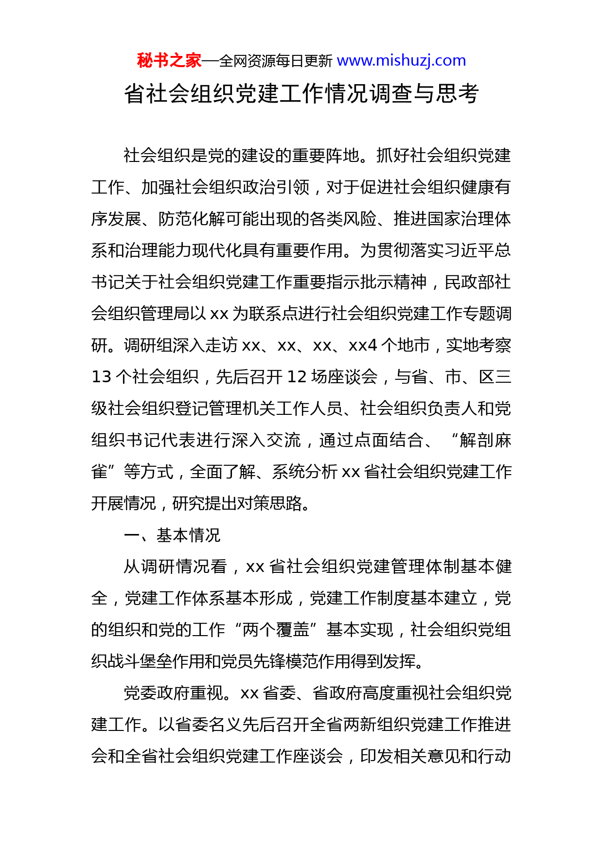 秘书之家—全网资源每日更新www.mishuzj.com省社会组织党建工作情况调查与思考社会组织是党的建设的重要阵地。抓好社会组织党建工作、加强社会组织政治引领,对于促进社会组织健康有序发展、防范化解可能出现的各类风险、推进国家治理体系和治理能力现代化具有重要作用。为贯彻落实习近平总书记关于社会组织党建工作重要指示批示精神,民政部社会组织管理局以xx为联系点进行社会组织党建工作专题调研。调研组深入走访xx、xx、xx、xx4个地市,实地考察13个社会组织,先后召开12场座谈会,与省、市、区三级社会组织登记管理机关工作人员、社会组织负责人和党组织书记代表进行深入交流,通过点面结合、“解剖麻雀”等方式,全面了解、系统分析xx省社会组织党建工作开展情况,研究提出对策思路。一、基本情况从调研情况看,xx省社会组织党建管理体制基本健全,党建工作体系基本形成,党建工作制度基本建立,党的组织和党的工作“两个覆盖”基本实现,社会组织党组织战斗堡垒作用和党员先锋模范作用得到发挥。党委政府重视。xx省委、省政府高度重视社会组织党建工作。以省委名义先后召开全省两新组织党建工作推进会和全省社会组织党建工作座谈会,印发相关意见和行动秘书之家—全网资源每日更新www.mishuzj.com计划。成立省社会组织党委和9个行业党委,从人力、财力、物力等方面给予大力支持。省级和16个地市分别建立由分管省市领导任总召集人、各部门参加的社会组织工作联席会议制度,基本形成党委政府牵头抓总、省市统筹发展、部门协同联动的社会组织党建工作格局,建立起分级负责、条块结合、区域兜底的社会组织党建工作综合管理体系。职能部门尽责。xx省民政部门积极履行职责、有效发挥作用,着力加强社会组织党建工作。印发有关通知,将坚持党的全面领导写入社会组织章程。在社会组织登记时同步开展党建工作,在审查年报时同步检查评估党建工作。在全省范围内建立社会组织党组织书记任前考察工作机制,开展社会组织党组织书记年度述职评议考核工作,组织新任社会组织党支部书记集体谈话,举办社会组织党组织负责人培训示范班,实现社会组织党务干部岗前轮训全覆盖。通过一系列务实举措,有力推进社会组织党建工作全面提升、全面过硬。社会组织尽力。xx省社会组织主动担当、积极作为,结合行业特点、社会组织特征、服务对象诉求等开展党组织活动。如:xx省食品医药行业联合党委以党建工作促进行业自律,编制两个省级标准;xx省中小企业发展促进会党支部带领会员企业整合资源,开拓市场,加快复工复秘书之家—全网资源每日更新www.mishuzj.com产;xx市企业联合会党委建立结对共建模式,以党建为抓手,激发企业发展活力;xx市社会工作者协会党委打造“五星党建”工作模式,开展提升“党建+社工素养”行动,提供为民服务公益项目;xx市金网教育集团党委建立“人民学习+智慧课堂”,免费提供线上党建公益直播课程;xx市江西商会党支部打造“党旗映车间,助企创辉煌”工作模式,用党的政策服务会员企业成长和发展;xx市xx区以惠民综合服务社党支部、义线阳光志愿者协会党支部为代表,带领党员骨干为老年人、残疾人等捐赠生活用品、开展志愿服务、提供心理辅导。通过举办会员单位欢迎、服务对象满意的党组织活动,进一步提升了党组织在社会组织中的战斗堡垒作用。党建效果明显。xx省社会组织党组织积极发挥作用,促进社会组织自觉服务国家、服务社会、服务群众、服务行业,党建成效明显。在新冠肺炎疫情防控中,全省社会组织累计捐款捐物支援抗疫超过xx亿元,社会组织中的党员捐款捐物超x亿元。在帮助企业复工复产中,开展支持企业复工复产“十项行动”,为企业减免会费,支持帮助企业复工复产约x万家。在助力经济社会发展过程中,省环境保护产业协会、省家具协会、省食品行业协会等社会组织在制定行业标准、开展国际经贸合作、助力化解经济风险等方面发挥了积极作用。通过将党建融入社会组织管秘书之家—全网资源每日更新www.mishuzj.com理、运行和发展全过程,保证社会组织坚持正确政治方向、团结凝聚群众,服务经济发展和社会建设的思想行动更加自觉。二、经验做法xx省社会组织党建工作正在形成具有时代特点、xx特征、切合实际的中国特色社会组织发展之路的xx样本,实现了由初期嵌入式发展到目前融合性发展的转变,形成了党建带“会建”、“会建”促党建、共建促发展的良好局面。组织建设上形成体系。严格按照党章要求,应建尽建党组织,分层分类推进组织建设。从纵向看,形成了党建示范点、党建工作站、党支部和党委3个层次;从横向看,每个社会组织有党组织,同一个行业有行业党委、行业联合党委、综合党委。从而形成了纵向到底、横向到边、纵横交错、全面覆盖的网络化组织体系,实现了社会组织党组织覆盖。队伍建设上形成制度。发挥传统体制的党务工作者作用,建构了第一书记制度、党建组织员制度、党建工作指导员制度、通过政府购买服务向社会公开招聘社会组织党建工作岗位人员制度,以多种形式、不同方式加强社会组织党务工作者队伍建设,进一步强化了党建工作力量。活动开展上形成品牌。xx省社会组织坚持围绕中心工秘书之家—全网资源每日