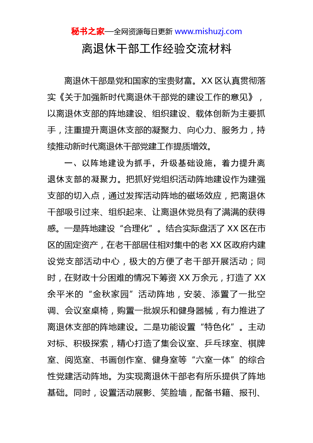 秘书之家—全网资源每日更新www.mishuzj.com离退休干部工作经验交流材料离退休干部是党和国家的宝贵财富。XX区认真贯彻落实《关于加强新时代离退休干部党的建设工作的意见》,以离退休支部的阵地建设、组织建设、载体创新为主要抓手,注重提升离退休支部的凝聚力、向心力、服务力,持续推动新时代离退休干部党建工作提质增效。一、以阵地建设为抓手,升级基础设施,着力提升离退休支部的凝聚力。把抓好党组织活动阵地建设作为建强支部的切入点,通过发挥活动阵地的磁场效应,把离退休干部吸引过来、组织起来、让离退休党员有了满满的获得感。一是阵地建设“合理化”。结合实际盘活了XX区在市区的固定资产,在老干部居住相对集中的老XX区政府内建设党支部活动中心,极大的方便了老干部开展活动;同时,在财政十分困难的情况下筹资XX万余元,打造了XX余平米的“金秋家园”活动阵地,安装、添置了一批空调、会议室桌椅,购置一批娱乐和健身器械,有力推进了离退休支部的阵地建设。二是功能设置“特色化”。主动对标、积极探索,精心打造了集会议室、乒乓球室、棋牌室、阅览室、书画创作室、健身室等“六室一体”的综合性党建活动阵地。为实现离退休干部老有所乐提供了阵地基础。同时,设置活动展影、笑脸墙,配备书籍、报刊、秘书之家—全网资源每日更新www.mishuzj.com音像制品等党建学习资料,让广大离退休干部随时接受党建文化熏陶。三是学用结合“常态化”。制订管理规定,明确开放时间,落实专人负责日常管理。探索实行“主题党日+”活动,发挥活动阵地大效能。近年来,在“金秋家园”举行重温入党誓词、党员过政治生日、开展文娱活动等事项XX余场次。二、以支部建设为抓手,强化组织保障,着力提升离退休支部的向心力。认真贯彻落实新时代党的建设总要求,以创建“乐为桂林·银龄本色”党建品牌为契机,不断优化组织设置、完善制度建设,进一步提升了离退休党支部的向心力。一是优化组织设置。本着“灵活、方便、自愿”且有利于教育管理、有利于发挥作用的原则,在离退休干部集中居住地、兴趣爱好团体建立XX个党小组,为各项组织活动的顺利开展提供了便利。同时,将离退休干部党建经费纳入全区财政预算,全面落实离退休干部支委班子每月工作补贴,为党支部活动开展提供了资金保障。二是配齐配强班子。以支部换届为契机,选出XX名党性强、威信高、乐于奉献的离退休干部党员组成新一届支委班子。新一届支委班子平均年龄XX岁,比上一届班子平均年龄降低XX岁。同时,专门聘用了XX名熟悉党务工作的年轻党员担任离退休干部党支部党建指导员、联络员,进一步加强了离退休干部党支部党建工作力量。三是完善各项秘书之家—全网资源每日更新www.mishuzj.com制度。完善学习制度、党日制度等常规制度,建立老干部生活发生困难必访、离退休干部住院必访等“五必访”制度,2022年至今,共走访探视生病离退休干部XX人次,慰问离退休干部XX余人次,年前已发放春节慰问金XX余万元。三、以载体创新为抓手,注重活动策划,着力提升离退休支部的服务力。坚持把党建工作寓于服务之中,以活动彰显党建引领成效,激励引导离退休干部永葆“离岗不离党、退休不褪色”的精神风貌。一是精心组织主题活动。组织开展“建言二十大”、专题视察、座谈会等主题活动,积极引导老干部为XX区的发展建真言、献良策、出实招。二是着力提升支部活力。每年组织“春游踏青”“五一健身”“秋游寻景”“年终体检”等生动活泼、丰富多彩的活动,有效提高了离退休支部的活力,增强了离退休干部的幸福感。三是积极搭建服务平台。深入开展“银龄行动”,积极组织“红色宣讲”进校园、“六一送爱心”等活动,引导老干部在正能量传递、关爱下一代等工作中持续贡献“金秋力量”。近年来,开展各项志愿服务活动XX余次,宣讲XX余场,帮扶贫困儿童XX余名,帮扶金额达XX万余元。