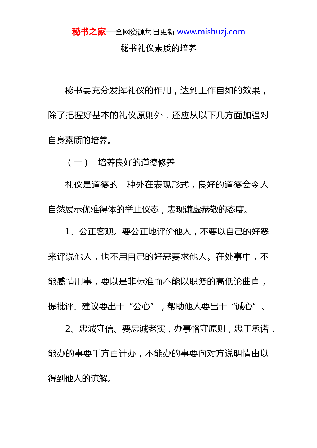 秘书之家—全网资源每日更新www.mishuzj.com秘书礼仪素质的培养秘书要充分发挥礼仪的作用,达到工作自如的效果,除了把握好基本的礼仪原则外,还应从以下几方面加强对自身素质的培养。(一)培养良好的道德修养礼仪是道德的一种外在表现形式,良好的道德会令人自然展示优雅得体的举止仪态,表现谦虚恭敬的态度。1、公正客观。要公正地评价他人,不要以自己的好恶来评说他人,也不用自己的好恶要求他人。在处事中,不能感情用事,要以是非标准而不能以职务的高低论曲直,提批评、建议要出于“公心”,帮助他人要出于“诚心”。2、忠诚守信。要忠诚老实,办事恪守原则,忠于承诺,能办的事要千方百计办,不能办的事要向对方说明情由以得到他人的谅解。秘书之家—全网资源每日更新www.mishuzj.com3、摆正站位。秘书一定要摆正自己的位置,在与不同身份的人交往处事中,要正确履行自己的职责,而不能超越权限,既要积极地配合工作,又不能干预领导的决策和下属或其它部门的工作。(二)培养谦虚而恭敬落落大方的态度谦虚是指正确地看待自己,也正确地看待别人。不过高估计自己,不过低估计别人,善于发现自己的缺点并改正,善于发现别人的优点欣赏和学习。恭敬就是尊重对方的人格,诚恳待人,和蔼热情,不骄横。谦虚而恭敬的态度往往是一个人的神态、语言、动作和行为的综合表现。1、表情。表情中最主要的因素是眼神和微笑。它们可以表现出对对方的欣赏、理解和。特别在与人交谈时,眼神要能显示你在倾听对方的谈话,因为每个人都喜欢用语言表达自己,喜欢别人听自己讲话,如果你用眼神告诉对方“你是一个值得我倾听的人”无形中会提高对方的自尊秘书之家—全网资源每日更新www.mishuzj.com心和信心,使对方感到你能理解他、尊重他,才能赢得对方的信任,从而产生愿意同你交往。同样微笑能使生疏变为亲密,真诚的微笑能造成互相信任和亲切友好的气氛。2、举止。手势和行立坐态都能表现出谦虚而恭敬的态度。秘书经常与总经理出现于各种场合,更应注意礼节。在社交场合要主动、大方地与对方接触、递送名片、自我介绍。让对方尽快了解自己,言谈中注意语言的文雅与委婉,说话方式轻松自如,语速不急不徐,落落大方。3、牢记别人的姓名,称呼恰当亲切。一般人对于自己的姓名特别在意,如果记得对方的姓名,会使对方对你产生莫大的好感。即使忘记了对方的姓名,也要委婉地“套”出或不动声色地处理。,切忌直白对方“记不起了”或“我忘记了”等让对方难堪。4、培养温文而雅的仪表风度。衣着仪表是个性的表征,反映一个人的文化修养和格秘书之家—全网资源每日更新www.mishuzj.com调,显示自己的职业和职位。秘书正式场合应着整洁得体大方优雅的职业装。
