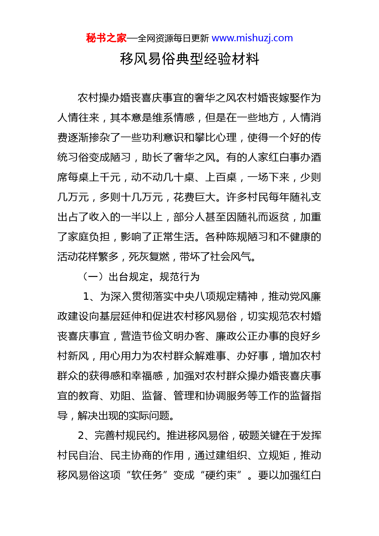 秘书之家—全网资源每日更新www.mishuzj.com移风易俗典型经验材料农村操办婚丧喜庆事宜的奢华之风农村婚丧嫁娶作为人情往来,其本意是维系情感,但是在一些地方,人情消费逐渐掺杂了一些功利意识和攀比心理,使得一个好的传统习俗变成陋习,助长了奢华之风。有的人家红白事办酒席每桌上千元,动不动几十桌、上百桌,一场下来,少则几万元,多则十几万元,花费巨大。许多村民每年随礼支出占了收入的一半以上,部分人甚至因随礼而返贫,加重了家庭负担,影响了正常生活。各种陈规陋习和不健康的活动花样繁多,死灰复燃,带坏了社会风气。(一)出台规定,规范行为1、为深入贯彻落实中央八项规定精神,推动党风廉政建设向基层延伸和促进农村移风易俗,切实规范农村婚丧喜庆事宜,营造节俭文明办客、廉政公正办事的良好乡村新风,用心用力为农村群众解难事、办好事,增加农村群众的获得感和幸福感,加强对农村群众操办婚丧喜庆事宜的教育、劝阻、监督、管理和协调服务等工作的监督指导,解决出现的实际问题。2、完善村规民约。推进移风易俗,破题关键在于发挥村民自治、民主协商的作用,通过建组织、立规矩,推动移风易俗这项“软任务”变成“硬约束”。要以加强红白秘书之家—全网资源每日更新www.mishuzj.com理事会建设为总抓手,健全理事会组织,制定工作章程,并将其纳入村规民约,明确村民办理红白事的标准、流程及奖惩规定。同时,各级要进一步夯实基层责任,将移风易俗工作纳入对各村的年度考核,使村规民约这个“小宪法”成群众办理婚丧嫁娶事宜的“硬杠杠”。(二)加大宣传,教育引导加大宣传力度,引导村民转变思想观念和行为方式。移风易俗重要的是改变行为习惯,但关键是改变价值观念。只有观念变了,移风易俗才能真正实现。营造浓厚舆论氛围,通过宣传栏、墙报等形式,大力宣传有关婚丧改革的法律法规,宣传婚事新办、丧事简办、移风易俗的积极意义,鞭挞婚丧嫁娶比阔气、讲排场、搞封建迷信等陈规陋习,引导群众从我做起,从身边做起,移风易俗,倡树新风。在农村(社区)道德讲堂,将移风易俗作为必讲内容。通过多种形式的宣传教育,使广大干部群众树立起正确的婚丧事办理观念,形成移风易俗的良好社会新风尚。通过召开党员干部大会、专题座谈会等形式给广大党员干部群众常打招呼、常敲警钟;及时对有婚丧事大操大办苗头的人员说服教育,进行正确引导。(三)加大投入,强化服务开展移风易俗,不仅要向旧传统“开刀”,推动形成秘书之家—全网资源每日更新www.mishuzj.com新规范,还要丰富实践载体,大力倡树文明新风。各地可以通过文艺等多种形式推树典型,倡导厚养薄葬新风。可以设立公共场所,免费为村民提供“一条龙”服务。同时,要搭建文明创建评选载体,引导人们见贤思齐,崇德向善,让乡风民风真正美起来。(四)定期检查,严格考核定期对移风易俗工作开展情况进行全面检查,督促各地扎实开展工作,对农村群众违规操办或者违规参与婚丧喜庆事宜的,依照《村规民约》《红白理事会章程》等处理,确保治理这股歪风,破解这一陋习取得实效。种种污浊混沌之气,是文明乐章中的不和谐音符。我们要围绕“移旧俗、除陋习、尚科学、倡新风”,积极倡导勤俭节约,婚事新办、丧事简办、喜事小办或不办,倡导理性人情消费,抵制各种庸俗的交往方式,推动”软环境”与“硬环境”同步发展,积极培育践行社会主义核心价值观,全面提升XX农村社会文明程度。
