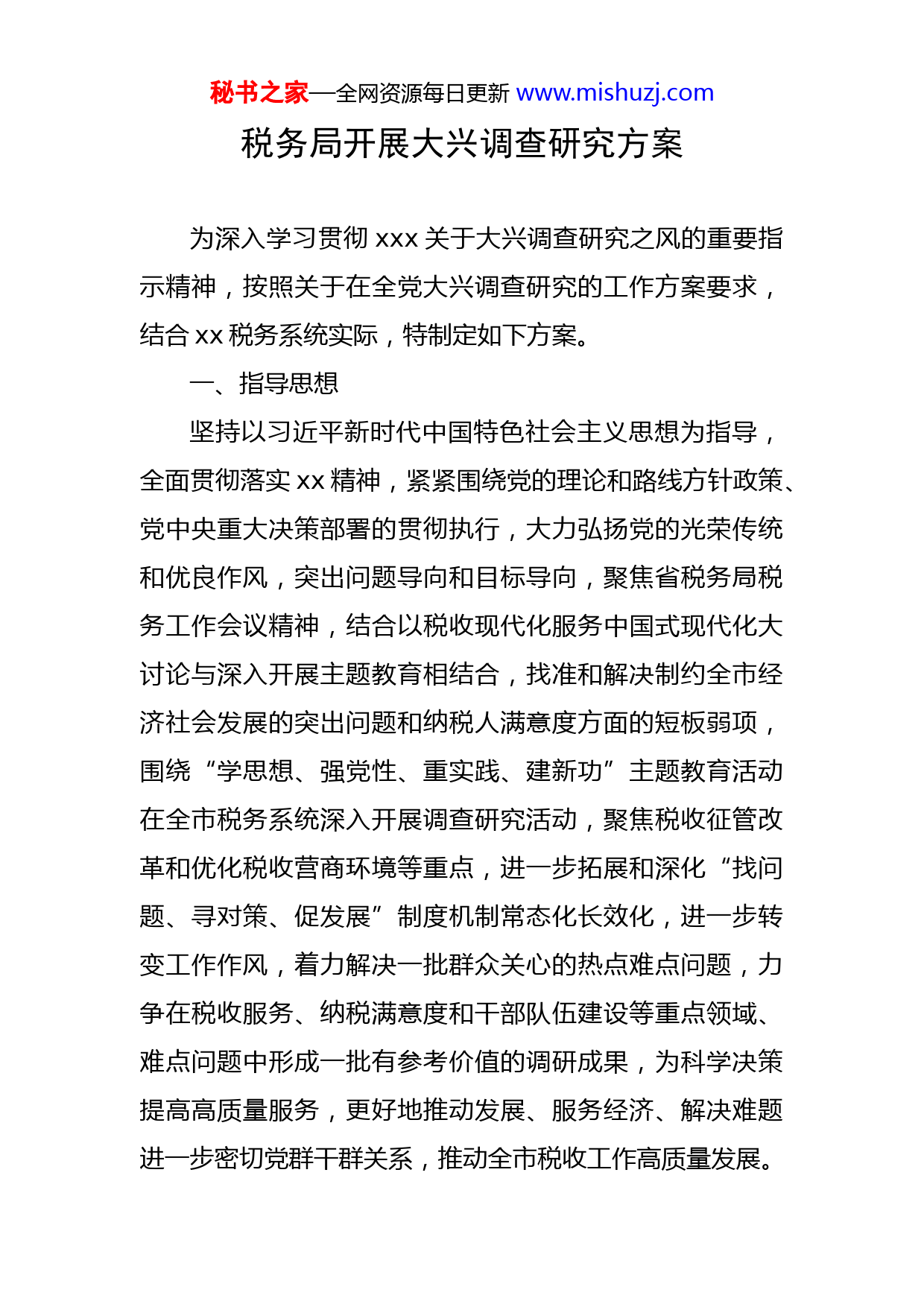 秘书之家—全网资源每日更新www.mishuzj.com税务局开展大兴调查研究方案为深入学习贯彻xxx关于大兴调查研究之风的重要指示精神,按照关于在全党大兴调查研究的工作方案要求,结合xx税务系统实际,特制定如下方案。一、指导思想坚持以习近平新时代中国特色社会主义思想为指导,全面贯彻落实xx精神,紧紧围绕党的理论和路线方针政策、党中央重大决策部署的贯彻执行,大力弘扬党的光荣传统和优良作风,突出问题导向和目标导向,聚焦省税务局税务工作会议精神,结合以税收现代化服务中国式现代化大讨论与深入开展主题教育相结合,找准和解决制约全市经济社会发展的突出问题和纳税人满意度方面的短板弱项,围绕“学思想、强党性、重实践、建新功”主题教育活动在全市税务系统深入开展调查研究活动,聚焦税收征管改革和优化税收营商环境等重点,进一步拓展和深化“找问题、寻对策、促发展”制度机制常态化长效化,进一步转变工作作风,着力解决一批群众关心的热点难点问题,力争在税收服务、纳税满意度和干部队伍建设等重点领域、难点问题中形成一批有参考价值的调研成果,为科学决策提高高质量服务,更好地推动发展、服务经济、解决难题进一步密切党群干群关系,推动全市税收工作高质量发展。秘书之家—全网资源每日更新www.mishuzj.com二、找准调查研究主题方向紧紧围绕大调研12个方面和税务总局、省局和市局党委2023年安排部署的各项指标任务确定调研主题,把调查研究贯穿于决策和执行全过程。聚焦“三大问题”开展调查研究。要聚焦收入质量不高的问题、业务基础薄弱的问题、队伍培育不强的问题深入开展调查研究,提出建设性意见建议。聚焦“三大不足”开展调查研究。聚焦党建引领不足、税收监管力度不足、纳税服务水平不足等问题,深入开展调查研究,提出可行性分析报告。聚焦“三大风险”开展调查研究。聚焦税收执法风险、行政管理风险和税务干部廉政风险等开展调研,深入剖析原因,提出意见建议。三、完善调查研究工作机制(一)进一步完善领导干部带头调查研究机制。领导干部要带头开展调查研究,亲自确定调研课题、提出调研方案,亲自深入基层了解实情,亲自分析研究调查材料,推动解决矛盾问题。要建立调研台账,班子成员下基层调研不得少于30天,全年撰写调研报告不少于1篇。(二)进一步完善调查研究综合协调机制。强化调研工作统筹,对调研内容相近、地点重合的合并开展调研。针对重要政策、重要部署落实情况和工作开展新情况新问题适时组织开展集中调研,或组建若干调研组,由局领导秘书之家—全网资源每日更新www.mishuzj.com带队到基层调研,提高调研效能。(三)进一步完善调查研究问题建议办理反馈机制。对调研中收集到的基层反映的问题和建议,能现场解决的应在现场解决,不能坚决的,做好记录、梳理归类,交相关部门研究提出坚决方案,对需要上级统筹坚决的复杂问题和全局性问题,及时报党委会研究后,提请上级部门坚决。(四)进一步完善在调查研究中为基层办实事工作机制。聚焦少数民族地区、边远山区、革命老区基层矛盾和诉求,以及先进典型、退休干部、退役军人、困难职工等基层干部群体工作生活情况,适时开展专题调研,加强综合分析,会商工作措施,切实为基层解难题补短板,提高基层保障水平。四、注重调查研究的方式方法(一)进一步改进调查研究方法。要立足新时代发展需要,坚持以围绕中心、服务决策、促进发展、服务群众推动工作为根本要求,大兴调查研究之风,深入开展大调研。要灵活运用专题座谈、个别访谈、实地考察等方式,多开展体验式、蹲点式、解剖式调研,全面深入、详实具体掌握基本情况,找准制约发展的问题所在,切实深入基层一线收集数据、发现问题、研究办法。创新运用在线问卷调查、远程访谈、大数据分析等方式,收集调研信息。秘书之家—全网资源每日更新www.mishuzj.com要将困难较多、情况复杂的地方和领域作为调查研究的主阵地,针对税收收入、减税降费、营商环境、队伍建设等选择有代表性的调研目的地,组织人员深入实际开展调查研究;要热情主动、坦荡真诚地同企业家交往,建立完善政企沟通渠道;通过开展座谈调研,召开不同层次、不同类型的座谈会,鼓励企业家、基层干部讲真话、谈实情、建诤言,掌握了解与调研内容相关的情况和问题;开展书面调研,由相关单位和部门根据调研提纲要求提供书面汇报材料,从中掌握情况,总结工作,分析对策,在调研中发现新事物、研究新问题、探求新规律。(二)进一步推进调查研究成果转化。各级党委要认真听取重要调查研究成果汇报,积极推进调查研究成果转化,及时把有价值的调查研究成果融入带决策部署、工作措施中。符合条件的,以制度规范的形式固化下来。五、调查研究的实施步骤(一)动员部署阶段(3月下旬)。制动大兴调研研究活动工作方案,成立活动组织领导机构,召开全市税务系统干部大会进行动员部署,启动开展大兴调查研究之风活动。(二)开展实地调研(4月-9月)。制定调研活动计划,选定调研课题,运用多种方式,开展实地调研。要突出重点,紧紧围绕调研主题进行,坚决避免电话调研、网秘书之家—全网资源每日更新www.mishuzj.com上调研和坐在办公室调研,要通过“四直两不”方式,大力