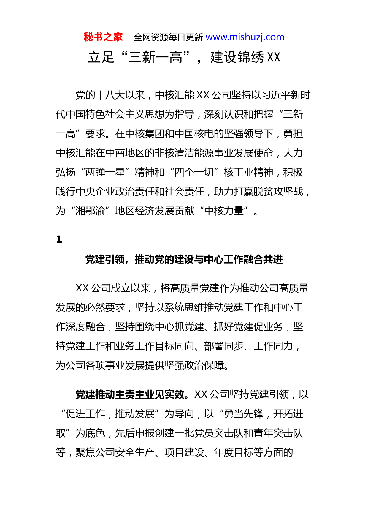 秘书之家—全网资源每日更新www.mishuzj.com立足“三新一高”,建设锦绣XX党的十八大以来,中核汇能XX公司坚持以习近平新时代中国特色社会主义思想为指导,深刻认识和把握“三新一高”要求。在中核集团和中国核电的坚强领导下,勇担中核汇能在中南地区的非核清洁能源事业发展使命,大力弘扬“两弹一星”精神和“四个一切”核工业精神,积极践行中央企业政治责任和社会责任,助力打赢脱贫攻坚战,为“湘鄂渝”地区经济发展贡献“中核力量”。1党建引领,推动党的建设与中心工作融合共进XX公司成立以来,将高质量党建作为推动公司高质量发展的必然要求,坚持以系统思维推动党建工作和中心工作深度融合,坚持围绕中心抓党建、抓好党建促业务,坚持党建工作和业务工作目标同向、部署同步、工作同力,为公司各项事业发展提供坚强政治保障。党建推动主责主业见实效。XX公司坚持党建引领,以“促进工作,推动发展”为导向,以“勇当先锋,开拓进取”为底色,先后申报创建一批党员突击队和青年突击队等,聚焦公司安全生产、项目建设、年度目标等方面的秘书之家—全网资源每日更新www.mishuzj.com“急、难、险、重、新”任务和综合管理提升,贡献党员智慧,展现青年风采、凝聚群众力量,带领全体干部职工全力贯彻落实中核汇能在中南区域的战略部署。田珍湖光伏项目党员突击队面对协调难度大、设备供货慢、材料到场受阻等诸多困难,始终坚持高标准、高质量,团结一心,攻坚克难,在保证安全、质量的前提下昼夜奋战,确保了汇能公司中南区域第一个自建渔光互补光伏项目并网发电;通道湘寿坪风电场青年突击队秉承“四个一切”核工业精神,一路披荆斩棘、攻坚克难,20天内完成了XX公司首个收并购场站的接产工作,让“不可能”变成了“成功”。党建融入科技创新结硕果。XX公司认真学习习近平总书记关于科技创新等重要论述,聚焦自主创新,开展形式多样的理论学习成果大转化活动。通过支部专题研究、党员带头选取攻关课题等方式,鼓励和带领职工围绕本领域业务超前开展课题研究,强化科研成果转化落地,解决生产经营中的关键技术问题并取得实效。公司累计完成14篇专利和1项软件著作权的申报,公司首份自创科技创新刊物《春粟》累计收录职工政策研究研究5篇、行业动态分析6篇、专利专题分析5篇、专业论文10篇,其中《光伏发电系统对电力调控的影响》等3篇专业论文已在外部省秘书之家—全网资源每日更新www.mishuzj.com级期刊发布见刊,相关研究成果已运用至各项目实际工作中,实现成果转化。党建树立品牌赋新能。XX公司深入贯彻落实“党建融入中心三年行动”,融合湖湘文化持续深化公司“汇能爱心大风车”“莲洁文化教育”“争先创优”“阳光党务”等四大党建品牌建设。一是聚焦社会公益,开展“汇能爱心大风车”助学活动,采取职工与当地学子一对一结对帮扶的形式,通过发放助学金、定期关注受助学生学习和生活动态、开展红色教育活动等多种方式助力当地学子成长成材。截至2022年8月,已帮助3名学子完成学业、步入职场,6名学子在爱心大风车的守护下茁壮成长;二是聚焦清廉公司建设,以湖湘地区“出淤泥而不染”的“莲”文化为抓手,组建成立一批“莲”小组,开展学“莲”倡廉系列活动,深入挖掘湖湘传统文化中的廉洁元素,逐步使全公司廉洁从业思想根基更加稳固,廉洁奉公文化基础得到厚植,推动全公司清正廉洁价值理念深入人心,营造出风清气正的廉洁文化氛围。2因地制宜,打造企地合作产业扶贫“桂东模式”XX公司结合XX省桂东县扶贫工作情况和当地风电产业发展条件,创新打造中核集团首个风电扶贫项目桂东牛秘书之家—全网资源每日更新www.mishuzj.com郎山风电场,将当地5152户贫困户集中到“风电”这一优势产业上来。通过创新“政企合作、产业发展、贫困户入股分红”帮扶模式,使贫困户与企业、政府共享风电产业发展红利。截至2021年,项目已累计为贫困户分红600万元,有效推动了桂东县成功脱贫摘帽,打造了央企与地方政府合作实现精准扶贫、产业扶贫的“桂东模式”。桂东项目的扶贫新模式不仅履行了央企社会责任,同时也以高度的政治责任感彰显了中核汇能在参与地方扶贫时“狠抓实干”的工作精神;既体现了中核汇能服务社会的企业宗旨,又建立起企业、政府、贫困户多方受益的利益共享机制;既深刻落实了习近平总书记提出的“精准扶贫”理念,又为地方发展和企业进步注入了源源不断的动力,成为央企创新思想帮助地方脱贫摘帽的又一鲜活样本,体现了扶贫攻坚大潮中的“中核智慧”。3闻令而动,争当中核集团“新基建”建设排头兵2020年3月23日,中共中央政治局常务委员会召开会议,指出要进一步加快5G网络、数据中心、新能源汽车充电桩等新型基础设施建设进度。秘书之家—全网资源每日更新www.mishuzj.comXX公司闻令而动,迅速贯彻落实国家“新基建”战略及上级党组织部署安排,仅用31天就成立了中核集团探索新能源汽车充电桩项目的首个试点单位——长沙汇天智慧能源有限公司。在无成熟经验借鉴、缺乏专业的市场开发及技术人员、没有建成项目案例可以参考的情况下,汇天公司攻坚克难,自主编制了财务测算模型、场站建设标准、市场开发流程、项目申报与备案、内外部流程审批等
