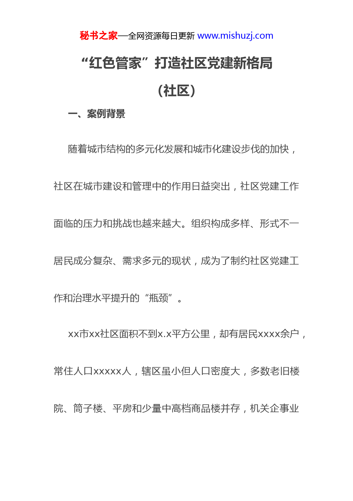 秘书之家—全网资源每日更新www.mishuzj.com“红色管家”打造社区党建新格局(社区)一、案例背景随着城市结构的多元化发展和城市化建设步伐的加快,社区在城市建设和管理中的作用日益突出,社区党建工作面临的压力和挑战也越来越大。组织构成多样、形式不一居民成分复杂、需求多元的现状,成为了制约社区党建工作和治理水平提升的“瓶颈”。xx市xx社区面积不到x.x平方公里,却有居民xxxx余户,常住人口xxxxx人,辖区虽小但人口密度大,多数老旧楼院、筒子楼、平房和少量中高档商品楼并存,机关企事业秘书之家—全网资源每日更新www.mishuzj.com单位、个体工商户和私营企业多,下岗人员、困难户、弱势群体更多。近年来,该社区创新基层党建工作形式,充分调动和发挥辖区内资源和力量,在小区党支部、物业服务公司、业委会、共建单位、小区居民中遴选出一批党员担任“红色管家”,构建起用党旗引领“管家”、用“管家”联动党员、靠党员推动服务、让服务温暖邻里的新格局,社区呈现出共驻共享、共建共治的生动局面。二、主要做法(一)感悟红色情怀,解决好为啥管的问题。秘书之家—全网资源每日更新www.mishuzj.com社区是党在城市的执政之基,党员是党的肌体的细胞和党的活动的主体。在促进社会和谐、服务人民群众中充分发挥先锋模范作用,是党员先进性的根本体现。为强化党员特别是群众党员参与社区治理、致力为民服务的自觉性该社区将“红色管家”的支部建在小区里,以联合党支部为中心,把“红色管家”的学习教育纳入到社区党建范围里,通过常态化组织主题教育、理论辅导、政策解读、典型学习等党建活动,每周一次党课、每月一次宣讲、每季一次竞赛,不断提高“红色管家”的政治思想觉悟,让为民服务、为党分忧成为他们的思想自觉和行为自觉。(二)扎根红色沃土,解决好管什么的问题。秘书之家—全网资源每日更新www.mishuzj.com“红色管家”以“丰富居民日常生活-引导居民协商共治-营造和谐温馨小区”为服务思路,涵盖了六大服务功能:维修维护类(亮化、硬化、绿化、美化)、爱心帮扶类(救助老、幼、病、残等弱势群体)、信息咨询类(提供金融、教育、医疗、法律、旅游等方面咨询)、文化娱乐类(传承国学文化、开放乒乓球室、图书室等文娱场所)应急处理类(协调处理各类突发事件)、矛盾调处类(调解邻里矛盾纠纷)。通过宣传栏公示,列出小区资源清单需求清单、项目清单,让居民可按图索骥,轻轻松松享受各类便捷服务,增强居民满意度和获得感,实现了老旧小秘书之家—全网资源每日更新www.mishuzj.com区物业定向提升、回迁小区物业规范提升、标准小区物业精准提升、新建小区智慧提升。(三)打造红色方阵,解决好谁来管的问题。在物业服务公司、业委会、小区业主之中成立“红色管家”党支部,凝聚社区党委、小区党支部、物业服务公司业委会、共建单位、小区居民等多方力量,定期召开共建联席会议,明晰各方责任,搭建沟通平台,强化监管落实实现同向发力、共同促进。通过党建引领各方联动,将日常服务和主题服务相结合,有针对性的组织党员志愿者开展政策宣传、法律咨询、卫生保健、文化科技等系列志愿服务活动,用一举一动、一言一行层层传递党组织的关怀秘书之家—全网资源每日更新www.mishuzj.com和温暖,打通基层党建为民服务的微循环。“红色管家”以其自身的权威性、影响力和号召力广泛集聚共建单位、机关企业、社会团体等各行各业的专业性优秀人才,通过党建项目认领,多方群策群力,发挥各自优势,用“零距离”服务温暖人心。(四)建强红色阵地,解决好怎么管的问题。以“适度规模、便于服务、全面覆盖”为原则,完善“社区党委-网格党支部-楼栋党小组-党员中心户”四级负责制的组织设置,将“红色管家”支部建在小区上,深化社区党委领导下的小区网格党支部、业委会、物业、共建单位“四方联动”机制,建立“x+N”物业联席会议制度。秘书之家—全网资源每日更新www.mishuzj.com各党支部根据居民多样化、精细化、个性化的需求,向上对接社区资源,向下团结小区居民,通过“问题收集、统筹协调、资源融合、群众评议”这一机制,将矛盾化解在家门口、服务提供在家门口、力量凝聚在家门口。以居民需求为导向,通过思想上“引”,工作上“推”,方法上“教”,经验上“传”,形象上“带”等做法发挥党支部战斗堡垒和党员先锋模范作用,推动小区治理水平的提升加大物业服务领域党建工作力度,把物业服务企业打造成党组织联系服务群众的工作平台,把物业服务人员中的党员变成党在小区联系服务群众的工作队队员,激发小区党建“新活力”。秘书之家—全网资源每日更新www.mishuzj.com(五)形成红色闭环,解决好管长远的问题。制度是管长远的。为将“红色管家”打造成为一支能打硬仗、作风优良的战斗队,它们把政治标准放在首位,在建立大数据库的基础上,制定了成员准入、培训、考核和退出机制。对拟成为“红色管家”的单位和个人进行资格审查和公示,无异议方可进入“红色管家”数据库。定期组织成员参与共建活动,使其在实践中学习在工作中成长适应流程内容和方式方法。对成员定期进行考核,从参与活动积极度、效果、居民满意度等方面打分,做到“优者上、庸者下、劣者汰”