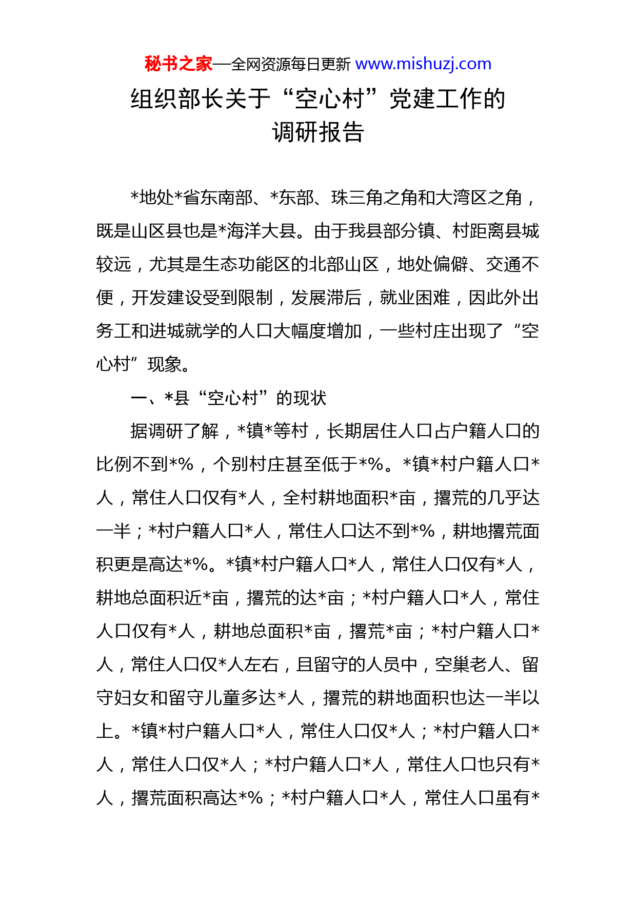 秘书之家—全网资源每日更新www.mishuzj.com组织部长关于“空心村”党建工作的调研报告地处省东南部、东部、珠三角之角和大湾区之角,既是山区县也是海洋大县。由于我县部分镇、村距离县城较远,尤其是生态功能区的北部山区,地处偏僻、交通不便,开发建设受到限制,发展滞后,就业困难,因此外出务工和进城就学的人口大幅度增加,一些村庄出现了“空心村”现象。一、县“空心村”的现状据调研了解,镇等村,长期居住人口占户籍人口的比例不到%,个别村庄甚至低于%。镇村户籍人口人,常住人口仅有人,全村耕地面积亩,撂荒的几乎达一半;村户籍人口人,常住人口达不到%,耕地撂荒面积更是高达%。镇村户籍人口人,常住人口仅有人,耕地总面积近亩,撂荒的达亩;村户籍人口人,常住人口仅有人,耕地总面积亩,撂荒亩;村户籍人口人,常住人口仅人左右,且留守的人员中,空巢老人、留守妇女和留守儿童多达人,撂荒的耕地面积也达一半以上。镇村户籍人口人,常住人口仅人;村户籍人口人,常住人口仅人;村户籍人口人,常住人口也只有人,撂荒面积高达%;村户籍人口人,常住人口虽有秘书之家—全网资源每日更新www.mishuzj.com人,但留守妇女却高达人,几乎占了留守人员的%。此外,全县个村(社区)中,除山区乡镇“空心村”现象较为严重外,沿江沿海部分乡镇的村组也存在人口“空心化”现象。比如镇域经济相对发达的大岭街道,户籍人口万人,常住人口却高达万人,但其下辖的文布村依然存在“空心”现象,该村户籍人口人,常住人口仅有人。除外,沿区的镇村东上、东下、桥下等多个自然村也同样出现大量人流外出的现象,外出比例均达%以上。二、“空心村”党建存在的主要问题农村空心化,大部分流失的是青壮年劳动力,是农村中最有活力的人群,不仅使得农村社会治理和新农村建设困难重重,也给农村基层党建工作带来了严峻挑战。(一)党组织领导核心作用发挥不明显。一是开展活动不正常。“空心村”大多地处偏僻,交通不便,“鞭长莫及”容易使上级监督管理出现“真空”,村党组织存在“三会一课”、主题党日活动等组织生活开展不正常等问题,学习活动效果不明显。二是决策在先机制执行不到位。《村民委员会组织法》赋予村民自治权,村小组自行管理村中事务财务,对涉及村民利益的事项,经村民会议讨论决定。目前我县全面推行《市强化村党组织领导核心地位暂行办法》“三个在先”决策运行机制。在具体操作秘书之家—全网资源每日更新www.mishuzj.com中,“空心村”党组织弱化,党组织书记领导作用没有发挥,导致党组织领导决策在先机制没有得到全面贯彻执行。三是服务发展能力不强。村党组织在资源整合、发展经济、推动乡村振兴、提供公共服务等方面引领力不强,能力不足,“等靠要”现象严重。部分“空心村”党组织对违法违纪行为不敢管、怕得罪人,对村民的生产生活、矛盾纠纷不想管,村民参与赌博、封建迷信、治安刑事案件等现象相对高发。(二)村干部队伍断层现象严重。一是村干部队伍年龄偏大、素质不高。据统计,我县山区乡镇共有个行政村,村党组织书记、主任共人,岁以上人,占比%;—岁人,占比%;—岁人,占比%;岁以下人,占比%。村干部共人,岁以上人,—岁人,-岁人,岁以下人,仅占比%。村干部中大专及以上文化程度人,占比%;高中(中专)文化程度人,占比%;初中及以下文化程度人,占比%。由此可以见,目前山区乡镇农村干部队伍年龄偏大,文化素质不高,传达贯彻落实上级决策部署的能力不强,带领群众致富的思路不宽、办法不多。二是农村后备干部匮乏、质量不高。调查了解到,山区乡镇农村后备干部储备人选不多,质量不优,个别“空心村”甚至无适合人选。近年来,虽然我们为适应农村发展的形势,采取了机关干部驻点包村、局长驻村工秘书之家—全网资源每日更新www.mishuzj.com作室、选派第一书记到村任职等措施,一定程度上充实了农村干部队伍,但是从长远来看,还应把选人用人视野扩大到外出群体当中,因为他们长期在外务工、创业,逐步开阔了眼界视野,掌握了技术信息,积累了经验财富,更重要的是,他们都是土生土长的本地人,熟悉当地的语言和风土人情,对自己的村庄也有着特殊的感情。(三)党员教育管理面临挑战。一方面,流动党员管理难度大。据统计,“空心村”约有三分之二以上党员外出,年轻党员(主要是大学生、退伍军人,还有部分外嫁女)大多外出,导致农村党组织召开支部会议或党员大会时,因党员人数达不到规定,决策难以形成,组织生活难以开展。在管理方面也存在诸多困难,相当一部分党员长期游离在党组织的有效管理之外,很少过组织生活,有的根本不过组织生活,甚至不按期交纳党费。据调查,“空心村”流动党员中还有约%未纳入党组织的有效管理。另一方面,党员先锋模范作用难发挥。从山区乡镇情况看,在年龄结构方面,农村党员年龄岁以上的占%;岁以下的仅占%。如安墩镇澄华村共有党员人,其中岁以上党员达人,岁以下党员仅有人。在文化结构方面,大专及以上学历的占%,初中及以下学历的占%。如镇新丰村共有党员人,其中初中及以下学历占比%以上;安墩镇澄华村共有党员人,初中及以下学历占比%。留守在村中的秘书之家—全网资源每日更新www.mishuzj.com党员年龄较大、文化程度偏低,这部分党员对接受新事物、