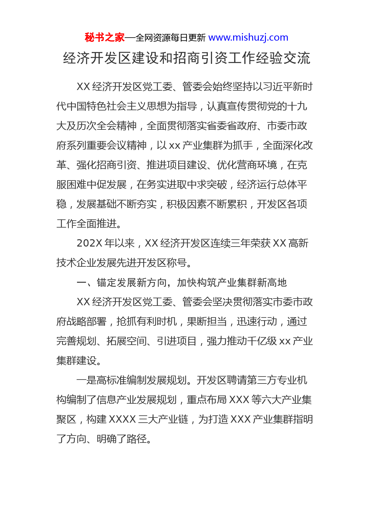 秘书之家—全网资源每日更新www.mishuzj.com经济开发区建设和招商引资工作经验交流XX经济开发区党工委、管委会始终坚持以习近平新时代中国特色社会主义思想为指导,认真宣传贯彻党的十九大及历次全会精神,全面贯彻落实省委省政府、市委市政府系列重要会议精神,以xx产业集群为抓手,全面深化改革、强化招商引资、推进项目建设、优化营商环境,在克服困难中促发展,在务实进取中求突破,经济运行总体平稳,发展基础不断夯实,积极因素不断累积,开发区各项工作全面推进。202X年以来,XX经济开发区连续三年荣获XX高新技术企业发展先进开发区称号。一、锚定发展新方向,加快构筑产业集群新高地XX经济开发区党工委、管委会坚决贯彻落实市委市政府战略部署,抢抓有利时机,果断担当,迅速行动,通过完善规划、拓展空间、引进项目,强力推动千亿级xx产业集群建设。一是高标准编制发展规划。开发区聘请第三方专业机构编制了信息产业发展规划,重点布局XXX等六大产业集聚区,构建XXXX三大产业链,为打造XXX产业集群指明了方向、明确了路径。秘书之家—全网资源每日更新www.mishuzj.com二是高效率完成拆迁腾退。经济开发区正式启动了XX产业园区拆迁工作,全体干部职工团结一心、顽强拼搏,坚持早晚调度、昼夜奋战,仅用XX天的时间完成了XXX亩土地的拆迁清表工作,为信息产业集群建设拓展了承载空间。三是高质量谋划重点项目。在土地征迁过程中,开发区同步谋划对接了总投资近XX亿元产业园项目,建成后将新入驻电子信息企业XX家以上、预计年可实现销售收入XX亿元,目前正在抓紧办理各项开工手续,争取快竣工、快见效,加速动能转换。下一步,经济开发区将力争一年见成效、两年翻一番、三年达到亿级规模,让广大企业共享改革发展的丰硕成果。二、机制改革动真格,推动深化改革实现新突破XX经济开发区党工委、管委会审时度势,抢抓机遇,以“壮士断腕”“刮骨疗毒”的勇气和魄力全面系统地开展了管理体制、人事薪酬制度、行政审批制度、投融资体制四项重点改革。在管理体制改革方面实行“放权赋能”。由开发区统筹托管区域的产业布局规划、基础设施配套、招商引资、企业服务等工作,增强了发展自主权,扩大了服务新阵地在人事薪酬制度改革方面实施“瘦身强体”。建立并实行了全员聘任、合同管理的人事制度和低底薪、高绩效秘书之家—全网资源每日更新www.mishuzj.com的薪酬考核制度,增强了干事创业的激情,提升了服务发展的热情。在行政审批制度改革方面坚持“收放结合”。在全市率先设立了开发区行政审批局,基本实现“园区事、园内办”,进一步方便了园区企业和群众办事。三、多措并举出实策,助推招商引资再上新台阶近年来,xx经济开发区不断创新招商方式、开拓招商渠道,多措并举、全面发力,努力提高招商引资质量和水平。出台优惠政策。研究出台了招商引资和支持现有企业做大做强的两个“黄金十条”,政策的覆盖面和奖励力度省内最优,为主导产业发展插上了腾飞的双翼。充实招商力量。抽调精干人员充实招商队伍,向C派驻了招商小分队,在X建设飞地实验室,与XX等招商机构建立了合作机制。开展招商活动。先后赴北XX等地外出招商,成功举办了XX物联网大会、XXXX等系列招商活动,提高了XX开发区知名度和美誉度。坚持以商招商。制定了以商招商奖励办法,组建了企业家联盟,聘请XX余名企业家担任招商大使,使广大企业家成为了开发区的招商员、宣传员,切实提高了招商成功率。秘书之家—全网资源每日更新www.mishuzj.com下一步,xx经济开发区党工委、管委会将继续坚持以坚持以习近平新时代中国特色社会主义思想为指导,牢牢抓住省委省政府大力支持高质量发展的历史窗口期和战略机遇期,以更饱满的热情、更昂扬的斗志、更务实的作风,一张蓝图绘到底、一身担当拼到底,以崭新面貌和优异成绩迎接党的二十大胜利召开!