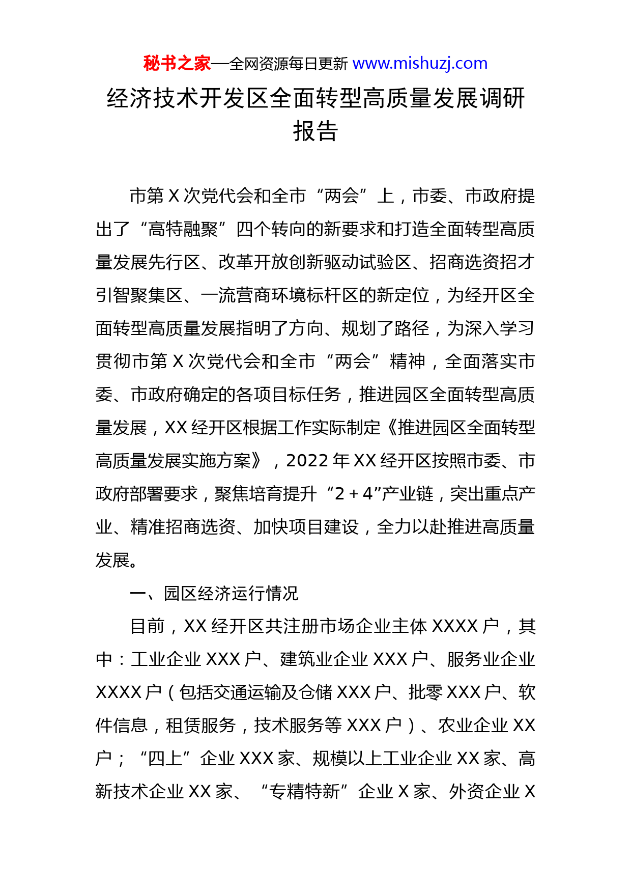 秘书之家—全网资源每日更新www.mishuzj.com经济技术开发区全面转型高质量发展调研报告市第X次党代会和全市“两会”上,市委、市政府提出了“高特融聚”四个转向的新要求和打造全面转型高质量发展先行区、改革开放创新驱动试验区、招商选资招才引智聚集区、一流营商环境标杆区的新定位,为经开区全面转型高质量发展指明了方向、规划了路径,为深入学习贯彻市第X次党代会和全市“两会”精神,全面落实市委、市政府确定的各项目标任务,推进园区全面转型高质量发展,XX经开区根据工作实际制定《推进园区全面转型高质量发展实施方案》,2022年XX经开区按照市委、市政府部署要求,聚焦培育提升“2+4”产业链,突出重点产业、精准招商选资、加快项目建设,全力以赴推进高质量发展。一、园区经济运行情况目前,XX经开区共注册市场企业主体XXXX户,其中:工业企业XXX户、建筑业企业XXX户、服务业企业XXXX户(包括交通运输及仓储XXX户、批零XXX户、软件信息,租赁服务,技术服务等XXX户)、农业企业XX户;“四上”企业XXX家、规模以上工业企业XX家、高新技术企业XX家、“专精特新”企业X家、外资企业X秘书之家—全网资源每日更新www.mishuzj.com家,建成省级以上研发机构XX个、国家级科技企业孵化器X个。2022年,XX经开区预计实现地区生产总值XXX亿元,增长XXX%,工业增加值XXX亿元,增长XX%,工业总产值XXXX亿元,增长XX%;预计实现进出口总额XXX亿元,增长XX%;完成一般公共预算收入X亿元,增长XX%;完成固定资产投资XX亿元,增长XX%,是2021年全年的X倍;向上争取资金XXXX万元,完成全年目标任务的XXX%,招商引资到位资金XX亿元,增长XXX%,完成全年目标任务的XXX%,经济运行持续保持稳中有进良好态势。二、园区全面转型高质量发展的主要措施(一)坚持延链补链,抓好招商选资。坚持缺什么补什么招什么,聚焦培育提升“2+4”产业链,启动编制经开区重点产业链发展规划及招商引资规划,健全完善有色金属新材料、新能源锂电及智能制造、数据信息、化工循环、资源综合利用7个产业链招商图谱,组建XX经开区新能源电池产业联盟,发挥以商招商优势,创新产业链招商方式,进一步延伸产业链、扩大产业群,重点围绕有色金属新材料、新能源电池谋划储备项目XX个,引进磷酸铁锂储能电芯、六氟磷酸锂、铝壳、钢壳、盖帽等项目XX个,已开工XX个,到位资金XX亿元,同比增长XXX%,努力实现“短链”延伸、“断链”联通。注重发挥经开区对外秘书之家—全网资源每日更新www.mishuzj.com开放排头兵作用,加大外资外企引进力度,新引进外资企业X家(XX化肥、XX汽车租赁有限公司XX分公司),累计注册外资企业X家,实际使用外资达到XXXX万美元,增长XXX%,外商再投资突破XXX万美元。(二)坚持市企融合,培育龙头骨干。深化市企融合一体化发展,充分发挥XX集团龙头引领作用,强化经济运行调度,高能环境低镍高硫阳极泥、佰利联40万吨合成金红石、晶科能源10GW单晶切片等项目试车投产,18GWh磷酸铁锂储能电池、15万吨双氧水、3万吨石墨负极等新能源项目顺利推进,预计全年有色金属新材料产业产值将达到XXXX亿元,新能源电池产业产值将达到XX亿元,网络货运交易规模将达到XX亿元;整合要素资源、强化集聚扶持,加快培育金拓锂电、甘肃佰利联、XX数字等“链主”企业,预计全年新增“四上”企业XX家以上(其中规模以上工业企业XX家),“四上”企业总数达到XXX家(其中规模以上工业企业XX家),新增高新技术企业X家,高新技术企业总数达到XX家,新增“专精特新”企业X家,“专精特新”企业总数达到X家,形成龙头带产业、产业促发展的良好态势。(三)坚持要素跟进,完善基础配套。坚持“项目落到哪里,基础配套就跟进到哪里”,持续加大基础设施建设力度,争取政府专项债券资金X亿元启动实施标准化厂秘书之家—全网资源每日更新www.mishuzj.com房二三期,经开区污水处理厂尾水水质提升、园区道路建设等基础设施建设项目XX项,其中:续建项目X项,新建项目XX项,已完成XX项、正在建设XX项,全力保障企业生产运营。统筹发展和安全,牢牢守住安全环保底线红线,开展《XX经开区总体规划(2021—2035)》环境影响评价,优化产业布局,提升园区环境容量;提高基础配套的前瞻性,立足长远发展,全面启动污水处理厂扩容提升、中水回用净化园、再生水厂、化工集中区要素输送综合管廊和液体危化品储运项目;注重运用信息化手段提升综合治理能力,应急管理平台建成启用,污水源头管控在线监测系统进一步升级,切实推动基础配套提档升级,着力提升园区本质安全水平。(四)坚持对标一流,优化营商环境。坚持以优质服务塑造优质营商环境,持续深化“放管服”改革和清廉窗口示范点建设。推行企业信用承诺制改革,制定实施“1+10”方案,完成12宗项目用地带标出让,项目审批时限压缩至30个有效工作日内。从省级政务系统认领编制284项行政权力事项和公共服务事项,全面开展流程优化再造。制定落实稳住经济一揽子政策措施XX条,帮助企业克服困难,助力企业发展,完成园区企业增值税留抵退税XXXX万元,组织XX家(次)企业赴XX学院、XX财经大学开展校园招聘达成就业意向XXX人(次),向企业兑秘书之家—全网资源每日更新www.mishuzj.com现招商引资奖补资金XXXX万元,累计协调金融机构向企业发放贷款XXX笔XXX亿元。三、园区全面转型高质量发展存在的主要问题