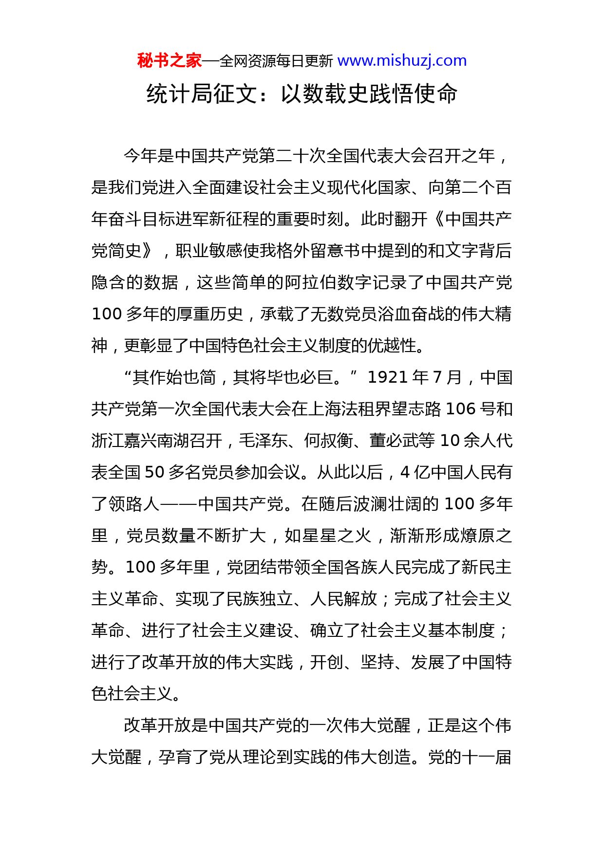秘书之家—全网资源每日更新www.mishuzj.com统计局征文:以数载史践悟使命今年是中国共产党第二十次全国代表大会召开之年,是我们党进入全面建设社会主义现代化国家、向第二个百年奋斗目标进军新征程的重要时刻。此时翻开《中国共产党简史》,职业敏感使我格外留意书中提到的和文字背后隐含的数据,这些简单的阿拉伯数字记录了中国共产党100多年的厚重历史,承载了无数党员浴血奋战的伟大精神,更彰显了中国特色社会主义制度的优越性。“其作始也简,其将毕也必巨。”1921年7月,中国共产党第一次全国代表大会在上海法租界望志路106号和浙江嘉兴南湖召开,毛泽东、何叔衡、董必武等10余人代表全国50多名党员参加会议。从此以后,4亿中国人民有了领路人——中国共产党。在随后波澜壮阔的100多年里,党员数量不断扩大,如星星之火,渐渐形成燎原之势。100多年里,党团结带领全国各族人民完成了新民主主义革命、实现了民族独立、人民解放;完成了社会主义革命、进行了社会主义建设、确立了社会主义基本制度;进行了改革开放的伟大实践,开创、坚持、发展了中国特色社会主义。改革开放是中国共产党的一次伟大觉醒,正是这个伟大觉醒,孕育了党从理论到实践的伟大创造。党的十一届秘书之家—全网资源每日更新www.mishuzj.com三中全会召开以后,改革开放的大幕徐徐拉开,中国经济焕发出前所未有的勃勃生机。1978年国内生产总值仅为3679亿元,经过40多年的探索和努力,社会主义市场经济体制不断完善,我国经济实力不断增强。到2020年,国内生产总值首次突破100万亿元大关,达到1015986亿元,稳居世界第二大经济体,占世界经济的比重达到17%左右。统计数据如实呈现出中国经济快速发展的轨迹,记录了改革开放以来中国经济建设取得的巨大成就,这些无不彰显了中国共产党领导和中国特色社会主义制度的优势。统计部门作为提供国民经济和社会发展数据信息的主要部门,紧密围绕党中央国务院和各级党委政府的经济决策分析需要,坚持实事求是,以提供真实客观准确的统计数据为责任担当,不断提高统计工作的科学性和权威性。“历史充分证明,江山就是人民,人民就是江山,人心向背关系党的生死存亡。”“全面建成小康社会、实现第一个百年奋斗目标,农村贫困人口全部脱贫是一个标志性指标。”2012年12月,习近平总书记作出向贫困宣战的战略部署,向全党全国发出脱贫攻坚的动员令,提出消除贫困是全面建成小康社会的底线任务。彼时,全国有近亿的农村贫困人口,其后8年,在党的组织领导下,党员干部冲锋在前,充分发挥出党员干部在脱贫攻坚路上的表率作用,带领全体扶贫工作者披荆斩棘、栉风沐雨,完成这秘书之家—全网资源每日更新www.mishuzj.com一世界扶贫史上的伟大壮举。8年间,累计300多万名驻村干部、第一书记和数百万名基层工作者奋战在没有硝烟的战场,舍小家为大家打响脱贫攻坚战。之所以叫战场,是因为截至2020年底,1800余人牺牲在脱贫攻坚一线,历史将铭记每一位用生命诠释信仰的英烈。正是因为全国上下一心、众志成城,共同创造了一个彪炳史册的人间奇迹。在2021年2月25日,全国脱贫攻坚总结表彰大会上,习近平总书记庄严宣告,我国脱贫攻坚战取得了全面胜利,现行标准下9899万农村贫困人口全部脱贫,832个贫困县全部摘帽,12.8万个贫困村全部出列,区域性整体贫困得到解决,完成了消除绝对贫困的艰巨任务。这一成就向世界有力证明了中国共产党领导和中国特色社会主义制度的优越性。庆幸我们有一个伟大的党,名字叫中国共产党。历经百年,党始终是民族解放、发展、复兴的中坚与核心力量。时代发生变化,任务会有更新,但共产党人“为中国人民谋幸福,为中华民族谋复兴”的初心和使命,一如既往,从未改变。从拨乱反正到全面深化改革的战略决策,从科学技术是第一生产力到坚持走共同富裕道路,从对腐败零容忍到保持党的先进性和纯洁性,透过“绿水青山就是金山银山”,透过“两不愁三保障”“全面小康路上一个不能少”,透过对“老少边穷革命老区”扶贫攻坚,透秘书之家—全网资源每日更新www.mishuzj.com过新冠肺炎患者国家免费救治,透过统计现代化改革等等,我们可以清晰地看到,在中国,“江山就是人民,人民就是江山”,人民的福祉是共产党人永远的牵挂。历史是流动的统计,统计是静止的历史。万千数据,演绎着一幕幕的历史壮举,以数读史,以数载史,我们要学数据背后的历史,悟未来前行的道路。