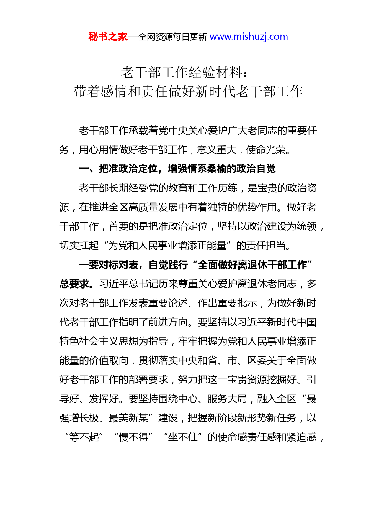 秘书之家—全网资源每日更新www.mishuzj.com老干部工作经验材料:带着感情和责任做好新时代老干部工作老干部工作承载着党中央关心爱护广大老同志的重要任务,用心用情做好老干部工作,意义重大,使命光荣。一、把准政治定位,增强情系桑榆的政治自觉老干部长期经受党的教育和工作历练,是宝贵的政治资源,在推进全区高质量发展中有着独特的优势作用。做好老干部工作,首要的是把准政治定位,坚持以政治建设为统领,切实扛起“为党和人民事业增添正能量”的责任担当。一要对标对表,自觉践行“全面做好离退休干部工作”总要求。习近平总书记历来尊重关心爱护离退休老同志,多次对老干部工作发表重要论述、作出重要批示,为做好新时代老干部工作指明了前进方向。要坚持以习近平新时代中国特色社会主义思想为指导,牢牢把握为党和人民事业增添正能量的价值取向,贯彻落实中央和省、市、区委关于全面做好老干部工作的部署要求,努力把这一宝贵资源挖掘好、引导好、发挥好。要坚持围绕中心、服务大局,融入全区“最强增长极、最美新某”建设,把握新阶段新形势新任务,以“等不起”“慢不得”“坐不住”的使命感责任感和紧迫感,秘书之家—全网资源每日更新www.mishuzj.com以“时不我待”的昂扬姿态、“奋斗有我”的责任担当奋斗新时代、奋进新征程,不断开创新时代老干部工作新局面。二要以人为本,自觉践行尊老敬老、崇德向善的道德之律。“敬田有谷、敬老有福”,尊老敬老是中华民族的传统美德。尊重老干部,就是尊重党的光荣历史;关心爱护老干部,就是关心爱护党的事业,也是贯彻“以人民为中心”理念、弘扬尊老敬老传统美德的题中之义。做好老干部工作,既是义不容辞的政治责任,也是正心明道的实践要求。饮水当思源,我们应当常思创业之艰,常怀敬老之心,常倾反哺之情,把感恩转化为关心爱护老干部的具体行动,倾注真心真情服务好广大老干部,使他们健康长寿、安度晚年。三要融入大局,始终把握“强富美高”新某建设的所需所盼。当前,全区上下正凝心聚力推动“强富美高”新某建设。站在新起点,谋求新突破,离不开方方面面的支持,需要团结凝聚包括广大老同志在内的一切积极力量。老干部熟悉区情区貌,工作阅历丰富,群众基础深厚,社会影响广泛,有着不可替代的政治优势、经验优势和威望优势。要着眼“四个融入”,找准区委区政府所需所盼与老同志所能所愿互融互促的契合点、切入点和着力点,通过多种途径和方式,让老同志有用武之地、能尽展其长,影响和带动周围群众坚秘书之家—全网资源每日更新www.mishuzj.com定不移跟党走,为“强富美高”新某建设汇聚强大合力。二、坚持与时俱进,创造情暖桑榆的扎实业绩围绕中心大局,努力探索老干部工作高质量发展与“最强增长极、最美新某”建设相融促进的途径和方法,力争做到“让区委放心、让老干部满意”。一要锚定路径,在久久为功上下功夫。这些年,全区老干部工作,提前谋篇布局、铆劲持续发力,做了大量扎实细致且富有成效的工作,收获很多成绩和荣誉。成绩和荣誉已成历史。面对新时期新任务新考验,我们不能有“原地踏步”歇一歇的满足感、优越感,要始终保持不进则退的危机感、紧迫感,以“争当表率、争做示范、走在前列”的现实责任担当,对标找差不停滞,务实创新求突破,进一步找准新定位、确立新目标、主动新作为,努力推动老干部工作高质量发展再上新台阶,力争跨入全省乃至全国前列。二要固本培元,在守正创新上求发展。党的力量来源于组织。近年来,全区在创特色亮底色、狠抓离退休干部党建上,打造出一批相对成熟、叫得响、辐射广的离退休干部党建品牌,赢得了广大老同志信任和社会广泛认可。习近平总书记指出:“组织是‘形’,思想是‘魂’。加强党的组织建设,既要‘造形’更要‘铸魂’,这是组织建设的核心和秘书之家—全网资源每日更新www.mishuzj.com关键所在。”要在不断总结经验做法的基础上,着力“造形”以深化“六有一提升”工程,着力“铸魂”以厚植理想信念,着力固本培元以提升离退休干部党组织的组织力,力争把富有某特色的党建项目创得更实,把某品牌擦得更亮、叫得更响。要充分利用我区高校集中、教育资源丰厚的优势,采取单位共建、活动共办、资源共享等合作模式,引导和激发更多高校“银发人才”走出大学、走进基层社区,走向群众、走近青少年,着力构建离退休干部党建与高校党建互联互动的新格局。三要把握重点,在彰显价值上做文章。习总书记多次引用“莫道桑榆晚,为霞尚满天”这句古诗,对老干部发挥作用、续写人生辉煌寄予殷切期望。当前,退休干部已成为老干部队伍的主体,特别是五十年代出生的干部队伍正逐渐步入老干部的队伍,这个群体退出工作岗位时间不长,精力还很充沛,身体状况也普遍较好,他们当中不乏学识卓越、经验丰富的专家学者。要持续深化“银发生辉”工程,根据退休干部的专业特长,统筹整合资源,合理搭建平台,灵活设计载体,拓宽服务渠道,教育引导更多老同志围绕“五个助力”献智献力,支持帮助他们成为“银发生辉志愿者队伍”主力军,助力基层社会治理,在“强富美高”新某建设中发秘书之家—全网资源每日更新www.mishuzj.com挥余热、再建新功。四要精准服