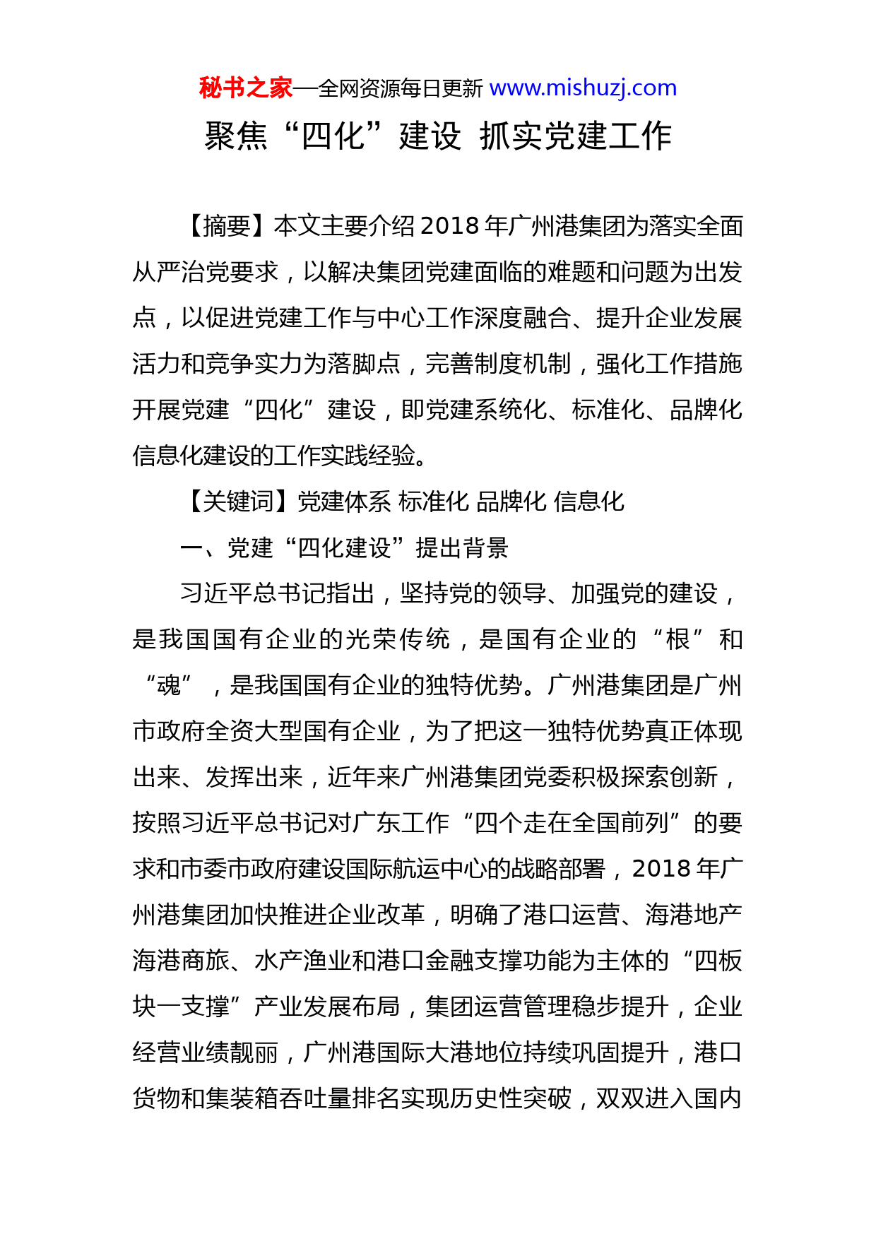 秘书之家—全网资源每日更新www.mishuzj.com聚焦“四化”建设抓实党建工作【摘要】本文主要介绍2018年广州港集团为落实全面从严治党要求,以解决集团党建面临的难题和问题为出发点,以促进党建工作与中心工作深度融合、提升企业发展活力和竞争实力为落脚点,完善制度机制,强化工作措施开展党建“四化”建设,即党建系统化、标准化、品牌化信息化建设的工作实践经验。【关键词】党建体系标准化品牌化信息化一、党建“四化建设”提出背景习近平总书记指出,坚持党的领导、加强党的建设,是我国国有企业的光荣传统,是国有企业的“根”和“魂”,是我国国有企业的独特优势。广州港集团是广州市政府全资大型国有企业,为了把这一独特优势真正体现出来、发挥出来,近年来广州港集团党委积极探索创新,按照习近平总书记对广东工作“四个走在全国前列”的要求和市委市政府建设国际航运中心的战略部署,2018年广州港集团加快推进企业改革,明确了港口运营、海港地产海港商旅、水产渔业和港口金融支撑功能为主体的“四板块一支撑”产业发展布局,集团运营管理稳步提升,企业经营业绩靓丽,广州港国际大港地位持续巩固提升,港口货物和集装箱吞吐量排名实现历史性突破,双双进入国内秘书之家—全网资源每日更新www.mishuzj.com前4、全球前5。广州港集团共有党组织234个(党委19个,党总支21个,党支部194个),在册党员3900多名。这些基层组织不仅是公司抓好党建工作的重要基础和力量,更是推动所属各单位、各部门经营管理工作的战斗堡垒,在落实广州航运枢纽建设和集团“四板块一支撑”战略发展,实现公司更快更均衡发展当中,各级党组织和全体党员必然承担着主要的责任。通过观察分析,结合集团自身现状,在推动企业党建和经营管理深度融合方面存在以下几个方面需要解决的问题。一是思想认识不到位的问题。对党建作用认识不够,没有形成抓党建的政治自觉,对党建也缺乏深入系统的思考。二是基层党组织发展不平衡,存在支部组织生活缺乏规范,难以对基层党建工作落实的过程与结果进行评估,做与不做、做多与做少没有明确标准加以衡量。三是党组织活动载体比较单一,党建工作创新不足。四是党建工作信息传达不到位、工作落实不到位和督导检查不到位等具体问题。因此,只有进一步加强企业党建工作,真正把政治优势全面发挥出来,才能确保集团沿着正确的方向实现健康持续发展。二、广州港集团党建“四化建设”措施(一)以系统化建设提高党建科学化水平秘书之家—全网资源每日更新www.mishuzj.com党建工作是一项系统性的工程,开展党建工作首先需要运用系统思维。系统思维要求对事物进行全面思考,探索事物与事物的关联性。系统思维是从整体上推进工作的科学方法,要义在于构建科学分工、合理制约、高效运行的工作机制。没有科学有效机制保障,党建工作目标任务就会“悬空”。党建工作与其他工作、组织部门与其他部门关联度越来越高,只有整合各类党建要素资源,才会释放“1+1>2”的倍增效应。2018年广州港集团党委为全面提高党建科学化水平,运用系统思维聚合力、用系统方法谋全局,从而整体提升工作水平。强化党建工作的顶层设计,构建了“145”党建工作体系,整合资源、互联互通,以系统视野提升基层党建工作。实施“145”党建工作模式,具体来说包括聚焦一个中心,以党的建设促进生产经营工作为中心,建立四个工作体系,遵循(PDCA)计划、执行、督导、评价的闭环管理,开展党建“责任、运行、督导、考评”四个体系。系统的合理化,很大程度上取决于系统各部分的组合状况,只有形成从计划、执行,到检查、改进的闭环系统,具体工作中,建立健全任务责任分解、定期督导检查、年度述职考评等机制,有责任计划、有督导检查、有落实整改,党建工作才会实起来。秘书之家—全网资源每日更新www.mishuzj.com同时集团党委全面实施“五大工程建设”,即党建“铸魂”工程、“育才”工程、“强基”工程、“创优”工程、“廉洁”工程五大工程融合,从而实现党建通业务党建融业务、党建促业务的良好局面,不断促进党建工作制度化、规范化、系统化,构建高质量的“大党建格局”推动企业健康、可持续发展。(二)以标准化建设夯实基层党建基础标准化建设。即党建常规工作规范化,包括阵地建设、组织建设、党员教育管理、组织生活、制度建设等方面。积极创造有利条件,建设规范的党员活动室;规范党员发展程序,严把源头关;建立健全党建工作责任制、党支部议事规则、党员管理制度等,保障党建工作的有序开展。2018年6月集团党委根据广州市委组织部关于开展党支部标准化建设的通知,制定了《广州港集团基层党支部标准化建设实施方案》,全集团203个党支部开展标准化创建工作。梳理了《广州港集团党支部标准化建设工作清单、制度清单、工作流程、工作台账》进行规范化建设指引,集团党建工作以标准化建设为基础,是开展基层党建工作的有效途径,也为党建工作注入了活力,使党委下属的党组织建设趋向于规范化、制度化、精细化、程序化。同时,根据《中国共产党党支部工作条例》建立了党支部考核标准,建立基层党建工作分类考评体系,既有共秘书之家—全网资源每日更新www.mishuzj.com性要求也有个性