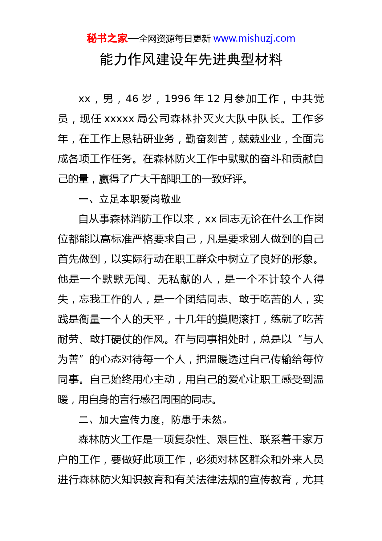 秘书之家—全网资源每日更新www.mishuzj.com能力作风建设年先进典型材料xx,男,46岁,1996年12月参加工作,中共党员,现任xxxxx局公司森林扑灭火大队中队长。工作多年,在工作上恳钻研业务,勤奋刻苦,兢兢业业,全面完成各项工作任务。在森林防火工作中默默的奋斗和贡献自己的量,赢得了广大干部职工的一致好评。一、立足本职爱岗敬业自从事森林消防工作以来,xx同志无论在什么工作岗位都能以高标准严格要求自己,凡是要求别人做到的自己首先做到,以实际行动在职工群众中树立了良好的形象。他是一个默默无闻、无私献的人,是一个不计较个人得失,忘我工作的人,是一个团结同志、敢于吃苦的人,实践是衡量一个人的天平,十几年的摸爬滚打,练就了吃苦耐劳、敢打硬仗的作风。在与同事相处时,总是以“与人为善”的心态对待每一个人,把温暖透过自己传输给每位同事。自己始终用心主动,用自己的爱心让职工感受到温暖,用自身的言行感召周围的同志。二、加大宣传力度,防患于未然。森林防火工作是一项复杂性、艰巨性、联系着千家万户的工作,要做好此项工作,必须对林区群众和外来人员进行森林防火知识教育和有关法律法规的宣传教育,尤其秘书之家—全网资源每日更新www.mishuzj.com是在防火期间,只有这样,才能真正把林区广大群众发动起来,人人自觉防火,从源头上防止森林火灾的发生。根据我区林场分布广、村庄多、人员复杂、野外用火频繁的实际情况,毛磊经常白天带领中队与护林员一起走街串巷深入到林区生产点和林区周边村庄进行森林防火宣传教育,向群众宣传《森林法》、《森林防火条例》等法律法规,从而提高居民的防火意识,规范其生产、生活用火。在防火期期间,特别是清明节,将制作好的森林防火宣传标语、森林防火宣传板报,张贴在林区路口、村庄、坟山周围,并悬挂横幅,使广大村民增强了护林防火和爱护国家森林资源的意识。三、强化组织发挥职能作用一是自担任专业扑火队中队长以来,xx同志刻苦钻研扑火队伍的管理。针对扑火作战时间长、体能消耗大的特点,组织中队开展了经常性的负重越野等体能训练,从而进一步增强了队员吃苦耐劳精神。为使队伍正规化,不断完善各项规章制度,先后制定扑火队员学习、训练、作息等制度,规范了扑火队伍管理,进一步增强了队伍的凝聚力和战斗力。二是积极创新扑火队伍的实战实训。并通过实战实训进一步提高了专业扑火队伍整体作战能力,为保护森林资源夯实了基础。真正做到了“招之即来,来之能战,战之能胜”。xx同志始终坚持“预防为主、积极消秘书之家—全网资源每日更新www.mishuzj.com灭”的森林防火方针,狠抓基础设施和队伍建设。坚持每月召开会议,认真接受相关法律法规的宣传和扑火常识教育,定期参加培训,提高使用风力灭火机、二号工具等科学扑火技能。四、不畏艰险、深入扑火一线2019年6月,在接到前往xx林场扑火的命令后,在上级组织下迅速带领队员奔赴火场,选择突破口,沿火线一路智打猛扑,通过近4个小时的扑救,火势得到初步控制,但就在扑打最后两个火头时,意外发生了,由于风向突变,在专业队员背后20米左右,一个火头腾起三、四米的火焰向队员们扑来,xx同志发现后赶紧叫身边的队员向安全地带转移,但在最前面的两个风力灭火机手由于灭火机声音大听不到,于是他赶紧跑过去,拽起他们就跑,当队员们刚刚跑过,就听到火头而过。事后那两个队员说,幸亏是队长及时把我们从火里拽出来了,要不就会出现意想不到的后果。2020年5月,在刚扑完一场大火后又接到扑火的命令,xx同志匆匆忙忙的买了点干粮和水,并迅速前往外援扑火,他首先观察整个火情,发现火场范围大,把现场情况向扑火指挥员作了汇报,然后请缨前往火势较大的地方进行扑救,由于火场山高林密,加上当天风势较大,火借风势,人根本靠不上去,扑这样的火,只能智取不能硬秘书之家—全网资源每日更新www.mishuzj.com拼,趁火势较小他组织本中队沿火线一路扑打,饿了吃一口饼干,渴了喝口山水,到了晚上5点的时候,整个火场的火才全部熄灭,连续打了十七八个小时的火,多远的山路,从来没喊苦喊累。可以说,在只要有火情的地方就有他的身影。xx同志并没有做什么惊天动地的事儿,只是做了自己应该做的。用自己的方式护卫绿色屏樟保护森林及人民财产安全,用实际行动为森林消防工作出一份力。今后将继续在护卫绿色屏障,建设生态文明,保护森林及人民财产安全上做出属于自己的贡献,为森林防火事业添上绿色的一笔。