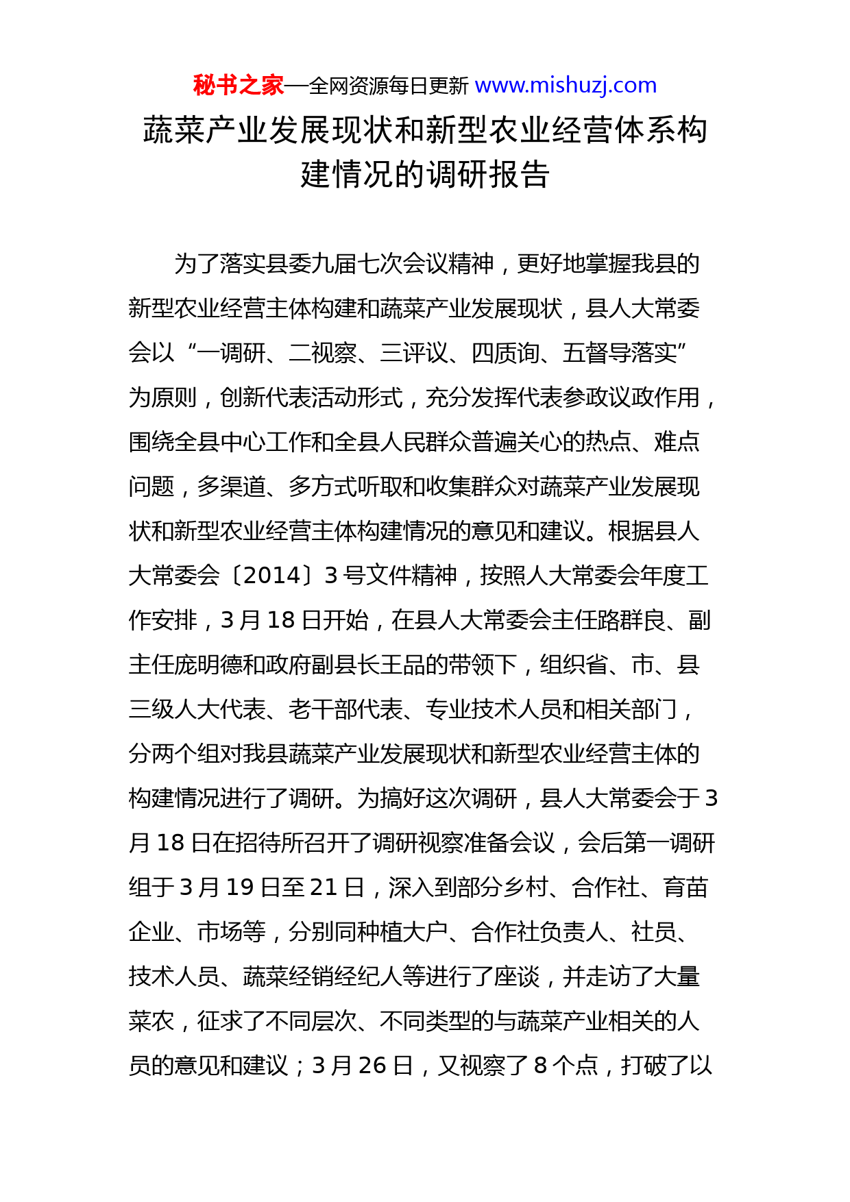 秘书之家—全网资源每日更新www.mishuzj.com蔬菜产业发展现状和新型农业经营体系构建情况的调研报告为了落实县委九届七次会议精神,更好地掌握我县的新型农业经营主体构建和蔬菜产业发展现状,县人大常委会以“一调研、二视察、三评议、四质询、五督导落实”为原则,创新代表活动形式,充分发挥代表参政议政作用,围绕全县中心工作和全县人民群众普遍关心的热点、难点问题,多渠道、多方式听取和收集群众对蔬菜产业发展现状和新型农业经营主体构建情况的意见和建议。根据县人大常委会〔2014〕3号文件精神,按照人大常委会年度工作安排,3月18日开始,在县人大常委会主任路群良、副主任庞明德和政府副县长王品的带领下,组织省、市、县三级人大代表、老干部代表、专业技术人员和相关部门,分两个组对我县蔬菜产业发展现状和新型农业经营主体的构建情况进行了调研。为搞好这次调研,县人大常委会于3月18日在招待所召开了调研视察准备会议,会后第一调研组于3月19日至21日,深入到部分乡村、合作社、育苗企业、市场等,分别同种植大户、合作社负责人、社员、技术人员、蔬菜经销经纪人等进行了座谈,并走访了大量菜农,征求了不同层次、不同类型的与蔬菜产业相关的人员的意见和建议;3月26日,又视察了8个点,打破了以秘书之家—全网资源每日更新www.mishuzj.com往只看好的视察习惯,既看了好的,也看了不好的,对我县蔬菜生产现状和存在的问题进行了深入调研。第二调研组针对我县的土地流转现状和农业专业合作社建设情况,先在小龙马乡政府召开了由小龙马乡、讲武乡、东杨庄乡、刘营乡等乡镇合作社法人、种粮大户、土地流转大户、群众代表、部分村支部书记参加的座谈会,26日上午又到东杨庄乡喆兴合作社、小北汪华翔粮食合作社、刘备张纺霞的种粮基地进行了观摩调研,通过调研对我县的土地流转的现状和农业专业合作社建设情况有了进一步了解。现将调研情况报告如下:一、关于大蒜产业方面大蒜是我县蔬菜产业上的一个传统的标志性品牌,在我县种植已历史悠久,提起永年蔬菜就会想起永年的大蒜,我县大蒜还申请通过了国家级地理标志保护产品认证,是河北大蒜之乡。目前现状。全县大蒜播种面积上报15万亩,实际只有4-5万亩,与往年种植高峰期相比下降了一半。我县大蒜属于薹用型品种,蒜农的主要收入依靠蒜薹,所以播种密度很大,一般每亩5.5-6万株。蒜薹收获后经冷库储藏,到春节前后上市,是全国最耐储藏的蒜薹品种。蒜头除蒜农留种和自食外,大部分用于加工,加工品为蒜米和蒜粉,秘书之家—全网资源每日更新www.mishuzj.com部分用于国内方便食品调料,部分出口日本、东南亚和欧洲等国。存在问题。近几年来,大蒜种植面积逐年减少,呈萎缩趋势。我县的蒜头在本地的餐桌上见不到,没有体现出国家级地理标志保护产品的优势。形成原因。一是由于大蒜的栽种、覆膜、蒜薹采收、蒜头刨收等不能使用机械化作业,用工量大,相比较效益低,而外出打工收入稳定,每天人均在200元左右,这是导致蒜农放弃种蒜的主要原因。二是随着冷库储藏技术的不断提高,我县蒜薹的耐储藏优势显现不出来,价位受储藏商上年的收益影响较大,忽高忽低,致使蒜农的收入不稳定。前些年,南方的蒜薹储藏时间短必须在元旦前上市,元旦、春节一直延续到3月份是我县蒜薹的上市黄金期,价格是我们说了算。现在,因储藏技术的提高,我县蒜薹的上市受到很大冲击,迟迟不能上市,即使上市也与南方蒜薹同时上市,因入库价格高,没有竞争优势。对策建议。一是降低播种密度,使我县大蒜成为薹头兼用型品种,不仅蒜薹有较高的收益,蒜头也要成为人们餐桌上的必需品。二是加大宣传力度,把我县大蒜的国家级地理标志保护品牌叫响。三是帮助和扶持一批致力于大蒜生产、储藏和销售的企业、合作社、经纪人,比如:企秘书之家—全网资源每日更新www.mishuzj.com美的有机蒜、永丰的包装蒜等。经过几年不断努力,把我县大蒜推向餐桌,重拾往日大蒜之乡的盛名。二、关于蔬菜棚室结构方面目前现状。我县蔬菜实际种植面积约23万亩,扣除大蒜4-5万亩,其它品种蔬菜在18万亩左右。我县蔬菜生产的特点是冬季进行保护地生产,夏季露地生产。在保护地中,真正称得上日光温室的不足2000亩,其余全部是中小拱棚,种植的品种以叶菜类为主。近几年来,为改变我县棚室结构落后、冬季生产叶菜类蔬菜档次较低的现状,“学山东、赶山东”,在县委、政府的大力扶持下,2009、2010连续两年财政投资450多万元,在小龙马、杨庄、顾小营等十二个村建造了455亩日光温室,目前的情况是,赵庄16栋温室已拆平,长桥的十几栋仅剩2-3栋还在使用,顾小营的温室全部改种了葡萄,东张寨、姚寨、袁庄、后当头、后陈义冬季以叶菜类为主,春季种植西红柿、黄瓜,西河庄、小龙马、杨庄以一年两季种植西红柿为主,只有吴良寨村有几个棚搞越冬西红柿栽培。从效益上看,顾小营效益最好,亩年收入4-5万元,其次是杨庄,亩年收入3-3.5万元,其它都是2-3万元。存在问题。中小拱棚改造难度大,菜农不接受日光温室。秘书之家—全网资源每日更新www.mishuzj.com形成原因。一是拱棚投资小,技术难度低,菜农精通叶菜种植技术,效益不错。日光温室投资大,种植技术难度高,种拱棚叶菜的菜农不会种果菜,建了