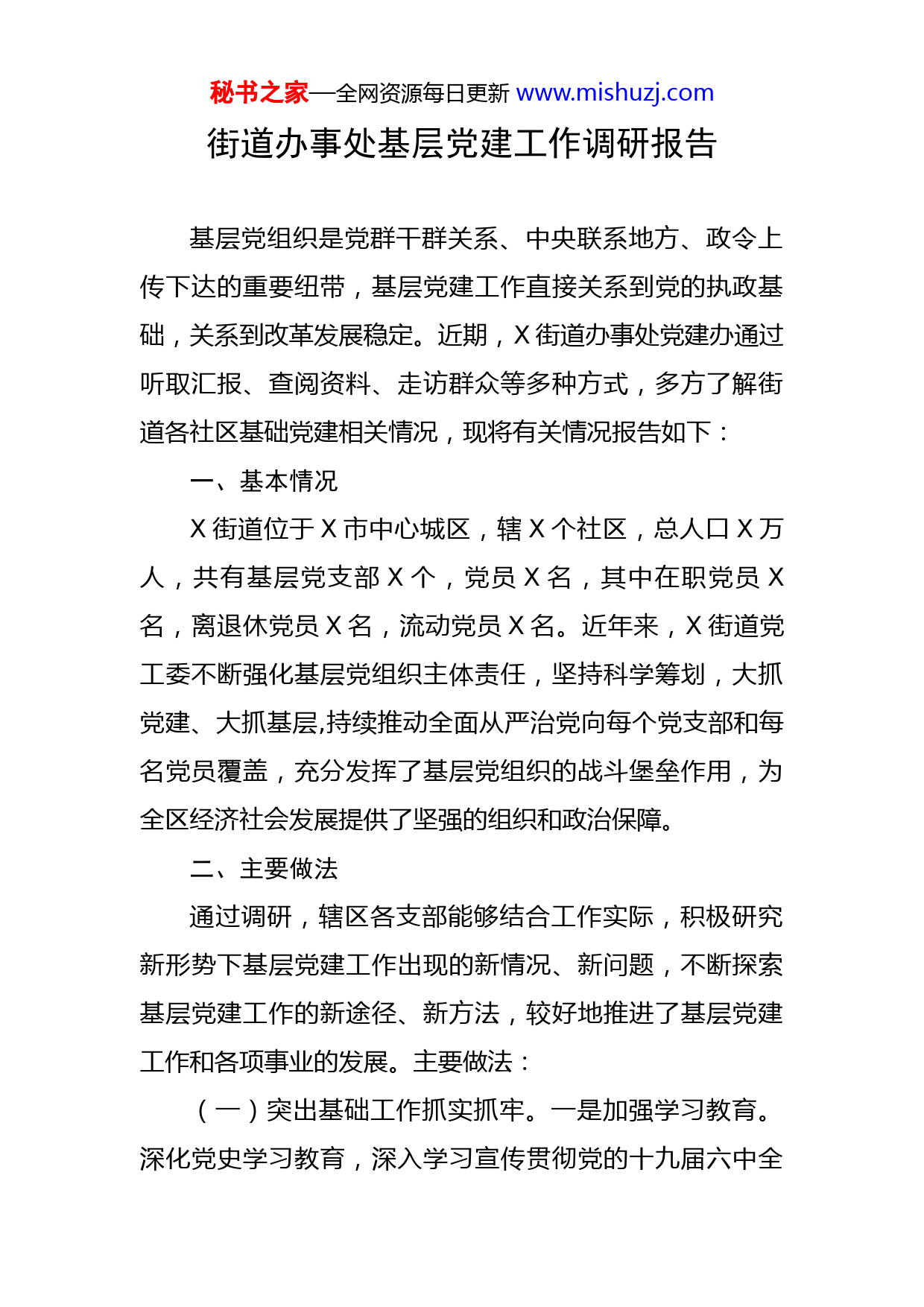 秘书之家—全网资源每日更新www.mishuzj.com街道办事处基层党建工作调研报告基层党组织是党群干群关系、中央联系地方、政令上传下达的重要纽带,基层党建工作直接关系到党的执政基础,关系到改革发展稳定。近期,X街道办事处党建办通过听取汇报、查阅资料、走访群众等多种方式,多方了解街道各社区基础党建相关情况,现将有关情况报告如下:一、基本情况X街道位于X市中心城区,辖X个社区,总人口X万人,共有基层党支部X个,党员X名,其中在职党员X名,离退休党员X名,流动党员X名。近年来,X街道党工委不断强化基层党组织主体责任,坚持科学筹划,大抓党建、大抓基层,持续推动全面从严治党向每个党支部和每名党员覆盖,充分发挥了基层党组织的战斗堡垒作用,为全区经济社会发展提供了坚强的组织和政治保障。二、主要做法通过调研,辖区各支部能够结合工作实际,积极研究新形势下基层党建工作出现的新情况、新问题,不断探索基层党建工作的新途径、新方法,较好地推进了基层党建工作和各项事业的发展。主要做法:(一)突出基础工作抓实抓牢。一是加强学习教育。深化党史学习教育,深入学习宣传贯彻党的十九届六中全秘书之家—全网资源每日更新www.mishuzj.com会精神和习总书记系列讲话,引导党员群众政治学习向纵深发展。二是加强党员队伍建设。严格执行“双推双评三全程”,持续做好发展党员工作,切实提高发展党员质量,加强对党员的经常性教育、管理和监督。三是严肃组织生活。认真落实党章、党内政治生活准则、党内监督条例、组织生活会规定,教育引导各党组织和广大党员干部严格落实“三会一课”、组织生活和民主评议党员等制度。四是加强业务培训。通过专题培训、以会代训等方式,加强对社区党建工作人员教育培训工作。五是加强监督与管理。严格落实党风廉政建设责任制,认真落实中央八项规定精神和省市区有关要求。通过开展谈话、重大事项报告等,强化对党员干部的监督制约,促进党风廉政建设各项规定的贯彻落实,常态化开展“以案促改”工作,并纳入年度考核。(二)突出重点工作抓好抓严。一是加强党建责任落实。街道党工委领导干部履行党建“一岗双责”,结合党组织述职评议,建立党组织书记抓党建工作台账,将全年党建工作细化,确保责任落到实处。二是加强督导考核。街道每月召开党建工作例会部署党建重点工作,每季度开展“逐社区观摩,整街道推进”活动,通过现场观摩评比,推进社区党建工作逐步提升,召开年度党建述评,不断增强抓党建主体责任意识。三是加强阵地建设。进一步秘书之家—全网资源每日更新www.mishuzj.com深挖资源,通过租赁、借用等方式,努力解决社区办公服务场所难题,为服务居民打下坚实基础。四是加强党支部规范化建设。严格落实《中共X市委组织部关于推进党支部规范化建设的实施意见(试行)》,深入推进党支部规范化建设三年行动,开展自查摸底,查摆存在问题,明确整改措施和完成时限。扎实开展“夺旗争星”活动,在基层党组织和广大党员中营造学习先进、崇尚先进、争当先进浓厚氛围。五是加大非公企业和社会组织党建工作力度。党建指导员加强对非公经济组织和社会组织党组织组建工作的指导,对符合组建党组织的非公有制经济组织应建尽建,推动非公企业和社会组织党建工作进一步提升。(三)突出品牌工作创特创新。一是深入开展共驻共建。主动与共建单位沟通交流,每季度组织开展党建联席会议,并在年初签订切实可行的共驻共建协议。深入开展在职党员到社区报到活动,引导在职党员发挥自身专长为主,实现党员兜底管理服务,彰显基层党建工作亮点。二是打造基层党建品牌。根据各社区自身实际,以打造服务型党组织为目标,以项目化建设为抓手,扎实推进城市基层党建项目建设工作,努力实现“一社区一特色”品牌创建。三是提升党建特色服务。总结推广“三大暖情”和“爱心商户联盟”项目的经验做法,推动优质项目的复制升级。继续加大宣传,不断提高党建特色服务项目知晓秘书之家—全网资源每日更新www.mishuzj.com率,扎实推进“X红服”特色服务项目,带动更多的共建单位、爱心人士和企业商户参与其中,持续扩大党建项目的影响力。四是发挥示范引领作用。打造街道社区党建新亮点,有重点有选择地培育一批示范社区、典型项目、先进党员,发挥示范引领作用,以点带面推进党建工作迈上新台阶。三、存在的问题(一)基层党组织引领作用发挥不够充分。部分基层党组织抓思想政治建设与抓中心任务及群众关心关切的问题结合不紧,在社会治理和基层协商中,角色转换较慢,过于依赖行政手段,党组织核心引领作用难以有效发挥,出现弱化、虚化、边缘化等倾向。(二)基层党组织统筹协调能力弱。部分基层党组织开展工作仅停留在“完成上级布置的基本目标和任务”上,对一些群众关注的难点问题存在畏难情绪。(三)基层党组织工作力量不足。党员干部参与基层治理能力不强,仍用传统模式做基层党建工作,工作方式方法粗放,精细化程度不够。党务工作者队伍因待遇低、任务重、发展有限等原因,队伍流动性大、素质参差不齐,后备干部缺乏,严重影响基层党组织工作的延续性,制约基层党组织在城市基层管理中的作用发挥。四、下步打算秘书之家—全网资
