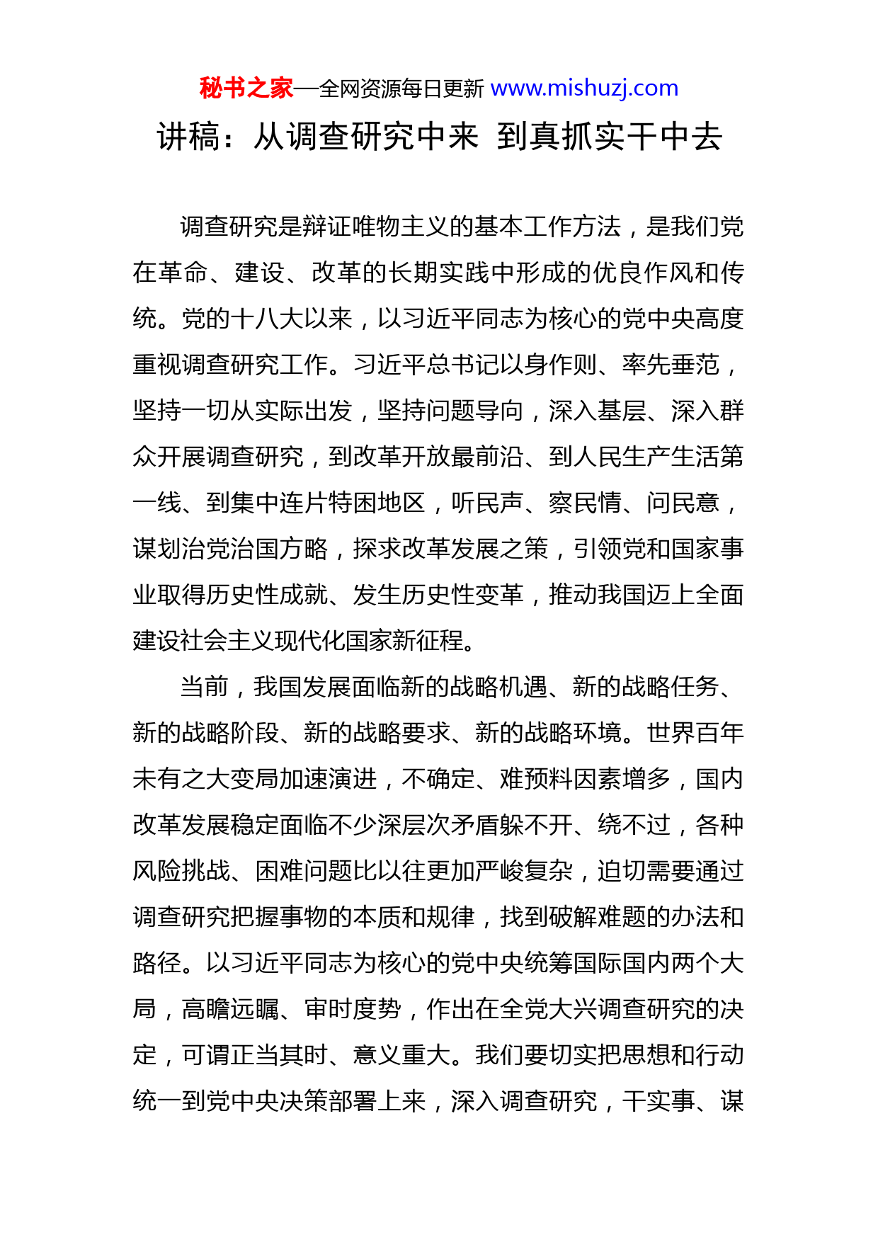 秘书之家—全网资源每日更新www.mishuzj.com讲稿:从调查研究中来到真抓实干中去调查研究是辩证唯物主义的基本工作方法,是我们党在革命、建设、改革的长期实践中形成的优良作风和传统。党的十八大以来,以习近平同志为核心的党中央高度重视调查研究工作。习近平总书记以身作则、率先垂范,坚持一切从实际出发,坚持问题导向,深入基层、深入群众开展调查研究,到改革开放最前沿、到人民生产生活第一线、到集中连片特困地区,听民声、察民情、问民意,谋划治党治国方略,探求改革发展之策,引领党和国家事业取得历史性成就、发生历史性变革,推动我国迈上全面建设社会主义现代化国家新征程。当前,我国发展面临新的战略机遇、新的战略任务、新的战略阶段、新的战略要求、新的战略环境。世界百年未有之大变局加速演进,不确定、难预料因素增多,国内改革发展稳定面临不少深层次矛盾躲不开、绕不过,各种风险挑战、困难问题比以往更加严峻复杂,迫切需要通过调查研究把握事物的本质和规律,找到破解难题的办法和路径。以习近平同志为核心的党中央统筹国际国内两个大局,高瞻远瞩、审时度势,作出在全党大兴调查研究的决定,可谓正当其时、意义重大。我们要切实把思想和行动统一到党中央决策部署上来,深入调查研究,干实事、谋秘书之家—全网资源每日更新www.mishuzj.com实招、求实效,为推动全面建设社会主义现代化国家开好局起好步贡献力量。把真实情况摸上来,这回答的是调查研究“为什么”的问题习近平总书记指出,调查研究是谋事之基、成事之道,没有调查就没有发言权,没有调查就没有决策权。作决策本身并不难,难的是对情况的准确把握。总书记在浙江工作期间,在《浙江日报》“之江新语”专栏中曾经谈到,为什么我们现在有些决策的针对性和可操作性不强,说到底,根子还是在于调查研究少了一点儿,“情况不明决心大,心中无数点子多”。调查研究就是一个了解情况的过程,就是为了把真实情况掌握得更多一些、把客观规律认识得更透一些,从而使思想、行动、决策符合客观实际,确保形成的思路、提出的对策经得起历史、人民和实践的检验。把真实情况摸上来,必须坚持实事求是。能不能、敢不敢坚持实事求是,是水平问题,更是党性问题。要坚守党性原则,一切从实际出发,理论联系实际,听真话、察实情,坚持真理、修正错误,有一是一、有二是二,既报喜又报忧,不唯书、不唯上、只唯实,对调研不预设前提、不预设框框、不预设结论,使结论真正产生在调研之后,而不是调研之前。要多层次、多方位、多渠道地了解秘书之家—全网资源每日更新www.mishuzj.com情况,既要调查机关也要调查基层,既要调查干部也要调查群众,既要解剖典型也要了解全局,做到点面结合、上下结合、内外结合,从而使决策有更多的事实依据。同时,还要综合运用座谈访谈、随机走访、问卷调查、专家调查、抽样调查、统计分析等方式,充分运用互联网、大数据等现代信息技术,提高科学性和实效性。要坚持发展地而不是静止地、全面地而不是片面地、系统地而不是零散地、普遍联系地而不是单一孤立地观察事物,准确把握客观实际,通过“交换、比较、反复”,取得真实可信、扎实有效的调研成果,从而得出正确的结论。直奔问题去,这回答的是调查研究“干什么”的问题问题是时代的声音,每个时代总有属于它自己的问题,只有始终树立问题意识,坚持问题导向,科学分析问题,深入研究问题,弄清问题性质,找到症结所在,才能不断有效破解前进中的各种难题,才能不断开创党和国家事业发展新局面。奔着问题去,是搞好调查研究的基本前提。毛泽东同志形象比喻:“调查就像‘十月怀胎’,解决问题就像‘一朝分娩’。调查就是解决问题。”党的十八大以来,在改革发展稳定、内政外交国防、治党治国治军等各方面,以习近平同志为核心的党中央都注重通过调查研究发现矛盾和问题,扭住深层次矛盾和重点难点问题精准发力。中办近日印发的《关于在全党大兴调查研究的秘书之家—全网资源每日更新www.mishuzj.com工作方案》,重点突出了这一观点,指出调查研究必须“以解决问题为根本目的,真正把情况摸清、把问题找准、把对策提实,不断提出真正解决问题的新思路新办法”。奔着问题去,必须胸怀国之大者、情系民之所盼,紧紧围绕党的路线方针政策和中央重大决策部署的贯彻执行,聚焦实践遇到的新问题、改革发展稳定存在的深层次问题、人民群众急难愁盼问题、国际变局中的重大问题、党的建设面临的突出问题,扎实做好事关全局的战略性调研、破解复杂难题的对策性调研、新时代新情况的前瞻性调研、重大工作项目的跟踪性调研、典型案例的解剖式调研、推动落实的督查式调研,突出重点、直击要害。对调研中反映和发现的问题,逐一梳理形成问题清单、责任清单、任务清单,逐一列出解决措施、责任单位、责任人和完成时限。对短期能够解决的,立行立改、马上就办。对一时难以解决、需要持续推进的,明确目标,紧盯不放,一抓到底,做到问题不解决不松劲、解决不彻底不放手。真正沉下去,这回答的是调查研究“怎么干”的问题“纸上得来终觉浅,绝知此事要躬行。”开展调查研究,就要扑下身子、沉到一线,亲身察看、亲身体验,不仅