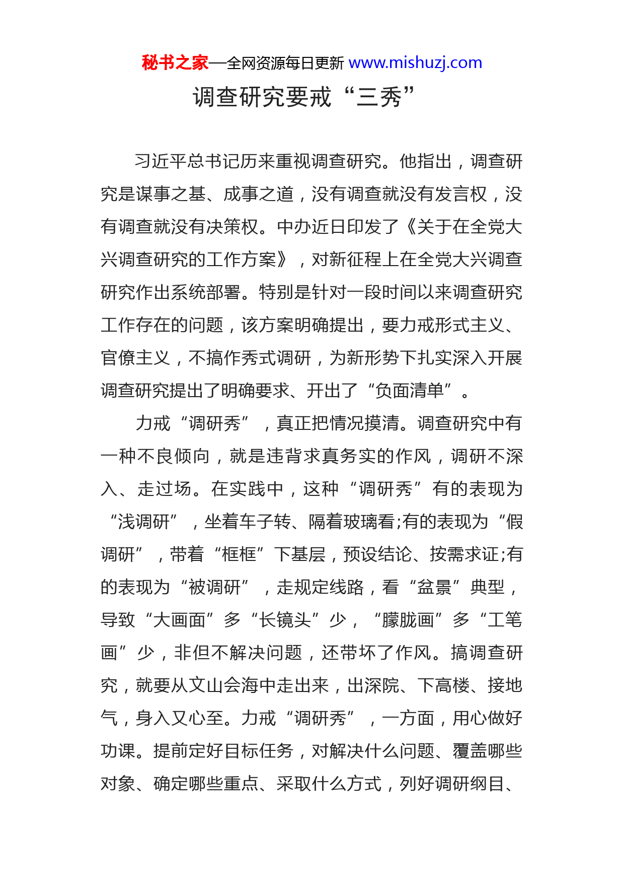 秘书之家—全网资源每日更新www.mishuzj.com调查研究要戒“三秀”习近平总书记历来重视调查研究。他指出,调查研究是谋事之基、成事之道,没有调查就没有发言权,没有调查就没有决策权。中办近日印发了《关于在全党大兴调查研究的工作方案》,对新征程上在全党大兴调查研究作出系统部署。特别是针对一段时间以来调查研究工作存在的问题,该方案明确提出,要力戒形式主义、官僚主义,不搞作秀式调研,为新形势下扎实深入开展调查研究提出了明确要求、开出了“负面清单”。力戒“调研秀”,真正把情况摸清。调查研究中有一种不良倾向,就是违背求真务实的作风,调研不深入、走过场。在实践中,这种“调研秀”有的表现为“浅调研”,坐着车子转、隔着玻璃看;有的表现为“假调研”,带着“框框”下基层,预设结论、按需求证;有的表现为“被调研”,走规定线路,看“盆景”典型,导致“大画面”多“长镜头”少,“朦胧画”多“工笔画”少,非但不解决问题,还带坏了作风。搞调查研究,就要从文山会海中走出来,出深院、下高楼、接地气,身入又心至。力戒“调研秀”,一方面,用心做好功课。提前定好目标任务,对解决什么问题、覆盖哪些对象、确定哪些重点、采取什么方式,列好调研纲目、秘书之家—全网资源每日更新www.mishuzj.com做好统筹谋划,切实以目标导向指引调研方向。另一方面,用心深入群众中去。放下架子和群众坐在一条板凳上,多一些现场看、随机点、当面听、直接问,组织“七嘴八舌式”的讨论,走在田间地头考虑问题,扎在群众中间问计于民,摸清群众的急难愁盼、工作落实的堵点淤点。力戒“问题秀”,真正把问题找准。调查研究中还有一种不良倾向,是没有坚持问题导向,不敢正视问题、不善于发现问题。在实践中,这种“问题秀”有的表现为浅尝辄止,把听到看见的问题照单全收;有的表现为听风是雨、添油加醋,夸大事实博眼球;有的表现为避重就轻,对真问题大问题避而不谈,缺乏坚持真理、修正错误的勇气。调查研究前期重点在“调查”,重头戏在“研究”,要通过定量与定性的综合分析,把零散的认识系统化,把粗浅的结论深刻化,直至抓准问题的本质规律,真正研在关键处、谋在点子上。力戒“问题秀”,善于握紧“竹竿”求实、解剖“麻雀”求深、剥好“洋葱”求细,通过研究分析典型现象和问题,由个别到一般、由个性到共性,去粗取精、去伪存真,进行一番交换、比较、反复,得出具有普遍规律性的认知,更好地透过“一管”而窥“全豹”。秘书之家—全网资源每日更新www.mishuzj.com力戒“成果秀”,真正把对策提实。调查研究以解决问题为根本目的,归根到底要不断提出真正解决问题的新思路新办法。调查研究中还有第三种不良倾向,重过程轻结果、对策多实效少,脱离了解决问题这个根本目的。在实践中,这种“成果秀”有的表现为调研成果一大片、成效看不见;有的调研报告只重视能否“受关注”“得批示”,忽视贯彻落实。调查研究不能坐而论道、“光开花不结果”,关键要把调查研究的所知所得体现于工作、付之于实践。力戒“成果秀”,注重一体发力、链条推动、末端问效,系统分析调研牵涉的各个方面、问题形成的各个因素、工作链路的各个卡点,对研究成熟的调研成果,及时上升为决策部署、转化为具体措施;对尚未研究透彻的,更深入地听取意见,完善后再付诸实施;对已经形成举措、落实落地的,及时跟踪评估,视情况调整优化。同时,建立调研成果转化运用清单,加强对调研课题完成情况、问题解决情况的督查督办和跟踪问效,定期对调研对象和解决问题等事项进行回访,注意发现和解决新的问题,切实把调查研究的“问题清单”变成工作实绩的“成效清单”。