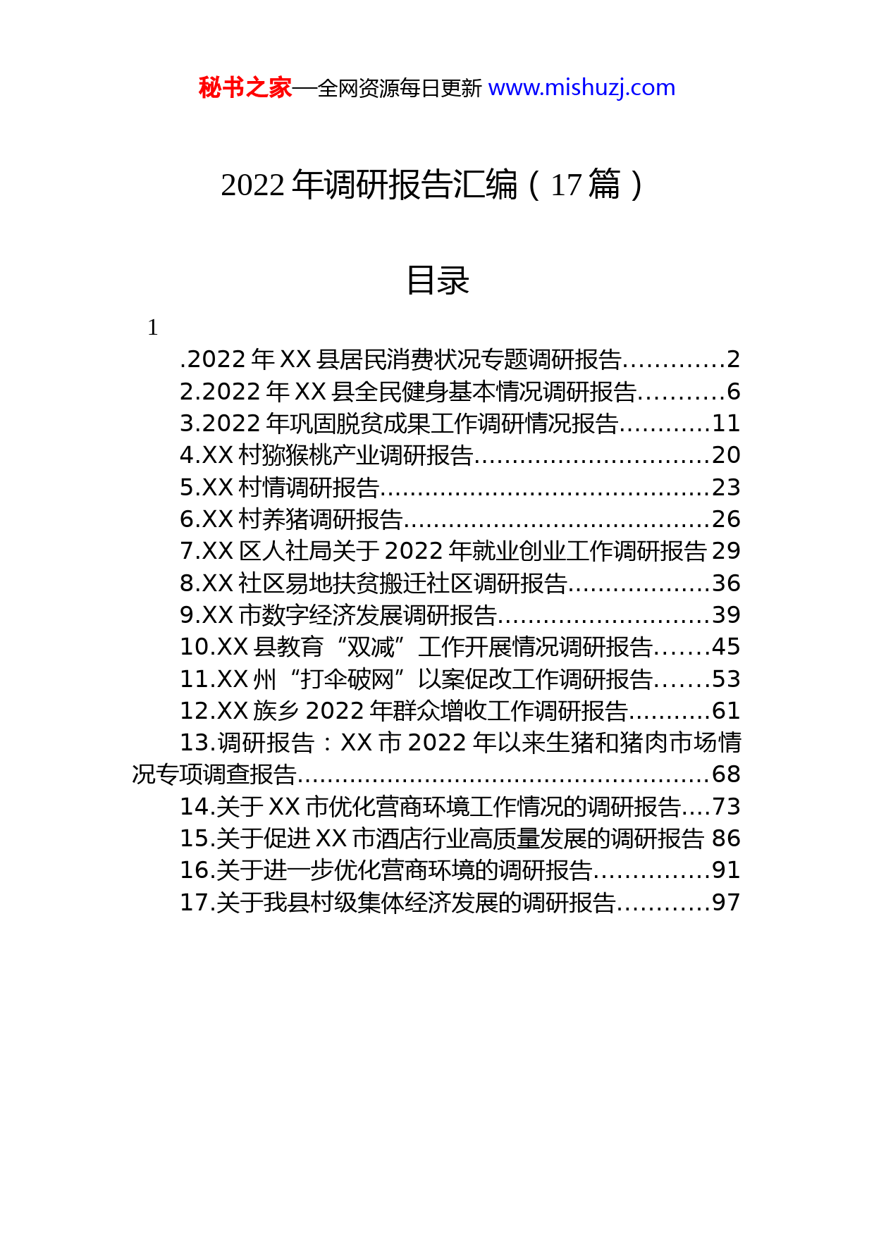 秘书之家—全网资源每日更新www.mishuzj.com2022年调研报告汇编(17篇)目录1.2022年XX县居民消费状况专题调研报告.............22.2022年XX县全民健身基本情况调研报告...........63.2022年巩固脱贫成果工作调研情况报告............114.XX村猕猴桃产业调研报告...............................205.XX村情调研报告............................................236.XX村养猪调研报告.........................................267.XX区人社局关于2022年就业创业工作调研报告298.XX社区易地扶贫搬迁社区调研报告...................369.XX市数字经济发展调研报告............................3910.XX县教育“双减”工作开展情况调研报告.......4511.XX州“打伞破网”以案促改工作调研报告.......5312.XX族乡2022年群众增收工作调研报告...........6113.调研报告:XX市2022年以来生猪和猪肉市场情况专项调查报告.......................................................6814.关于XX市优化营商环境工作情况的调研报告....7315.关于促进XX市酒店行业高质量发展的调研报告8616.关于进一步优化营商环境的调研报告...............9117.关于我县村级集体经济发展的调研报告............97秘书之家—全网资源每日更新www.mishuzj.com2022年XX县居民消费状况专题调研报告消费是推动经济增长的“主引擎”,是我国长期向好发展的巨大潜力所在。在疫情多点散发的背景下,社会经济复苏受到阻碍,居民消费仍存在波动,为了解当前居民的消费能力、消费信心和消费预期,宁波市统计局借助“浙江民调在线”平台,在全市范围内开展了居民消费状况快速调研。在本次调研中,XX县共收集到有效问卷1021份,覆盖全县18个镇乡街道,调研对象涉及各个年龄段和各类职业。一、调研基本情况调研显示,当前XX县居民消费情况总体平稳,保守心理占据上风,主要有以下三方面特征:(一)超六成居民看好当前经济形势,消费资源有待发掘。在本次调研中,14%的调研对象认为XX县当前经济形势非常好,50.9%的对象选择比较好,31.5%的对象认为不太好,认为当前经济形势很不好的调研对象不足3%。(二)六成居民看好当前就业形势,消费根基较为稳固。本次调研中,12.7%的调研对象认为XX县当前就业形势非常好,47.8%的对象选择比较好,36.2%的对象认为不太好,认为当前就业形势很不好的调研对象不足3%。(三)半数居民认为当前物价水平偏高,消费动力略显不足。调研显示,9.1%的调研对象认为当前物价水平非常合理,40.3%的对象选择比较合理,45.2%的对象认为不太合理,认为当前物价水平很不合理的调研对象不足5%。二、调研发现的问题(一)近半数居民对收入预期不满,增收创收仍需助力。从调研得知,8.9%的调研对象对未来家庭收入情况非常满意,45.2%的对象选择比较满意,41.8%的对象不太满秘书之家—全网资源每日更新www.mishuzj.com意,对未来家庭收入情况很不满意的调研对象不足4%。总的来看,近五成受访居民对今年收入预期不满意。国际环境形式依然复杂严峻,国内疫情反复短期之内难以彻底消除,经济回升压力依然较大,如何促进居民收入平稳增长增强居民消费积极性将成为下一步工作重点。(二)偿债与储蓄压力凸显,消费空间被挤压。在满足最基本的生活开销后,偿还欠款(31.3%)已成为居民家庭收入的首要去向,日常消费(30.5%)以微弱的差距位居第二,其他的消费去向还包括投资理财(26.8%),培训教育消费(26.2%),大宗消费(10.1%),其中有15.77%的家庭在每月消费过后几乎没有剩余的钱。偿还债务,包括房贷、车贷等,已成为阻碍居民消费的主要障碍,普遍的债务压力迫使居民不得不降低消费预期,部分居民在满足日常的生活消费与债务偿还后,难以积攒存款,进一步削减了消费的可能性。面对当前严峻的经济形势,在收入难以得到明显提升的情况下,通过降低居民的债务压力,或许是提升居民消费能力的有效途径。(三)基础物质消费占主导,消费结构有待升级。在限选三项的日常消费内容选择中,服装消费与饮食消费分别以65%与64.6%成为居民消费的首要内容,选择旅游消费的占32.8%,医疗保健消费占比较小,仅为16.1%。从结构上来看,我县居民消费风格上更偏向于较为基础的基本物质消费,文娱、保健等消费占比较低,居民消费信心不足钱袋子捂得紧,消费结构有待升级。三、促进居民消费的建议(一)稳企业提收入,增强居民消费能力。收入是影响消费的重要因素,想要刺激消费,关键在于提高社会居民的收入,增强居民消费的底气。一方面,需要着力做好稳企业稳预期工作,持续落实减负纾困,全力以赴保通保畅,精准助力市场拓展,强化要素保障,以更优的服务抓好稳企业稳增长,帮助企业安全发展,保障居民收入稳定秘书之家—全网资源每日更新www.mishuzj.com增长;另一方面,多措并举缩小收入差距,尤其是助力缩小城乡居民收入差距,提高农村居民收入,为农村居民创造消费空间,拓展农村消费市场。(二)升级消费理念,引导消费结构转型。目前XX县居民日常消费的主要领域依然是饮食、服饰等生存性物质消费,居民消费结构需要进一步优化,传统消费理念需要进一步引导更新。将仅满足基本生活需要的物质消费向更高层次的精神文化消费、娱乐生活消费进行转变;将过度理性的、攒钱办事的陈旧观念向享受生活、适度超前消费转变。丰富文化娱乐消费项目,扩展文娱消费市场,为居民提供消费机会,创造消费空间,同时对住宿、旅游、文娱等受疫情冲击较大