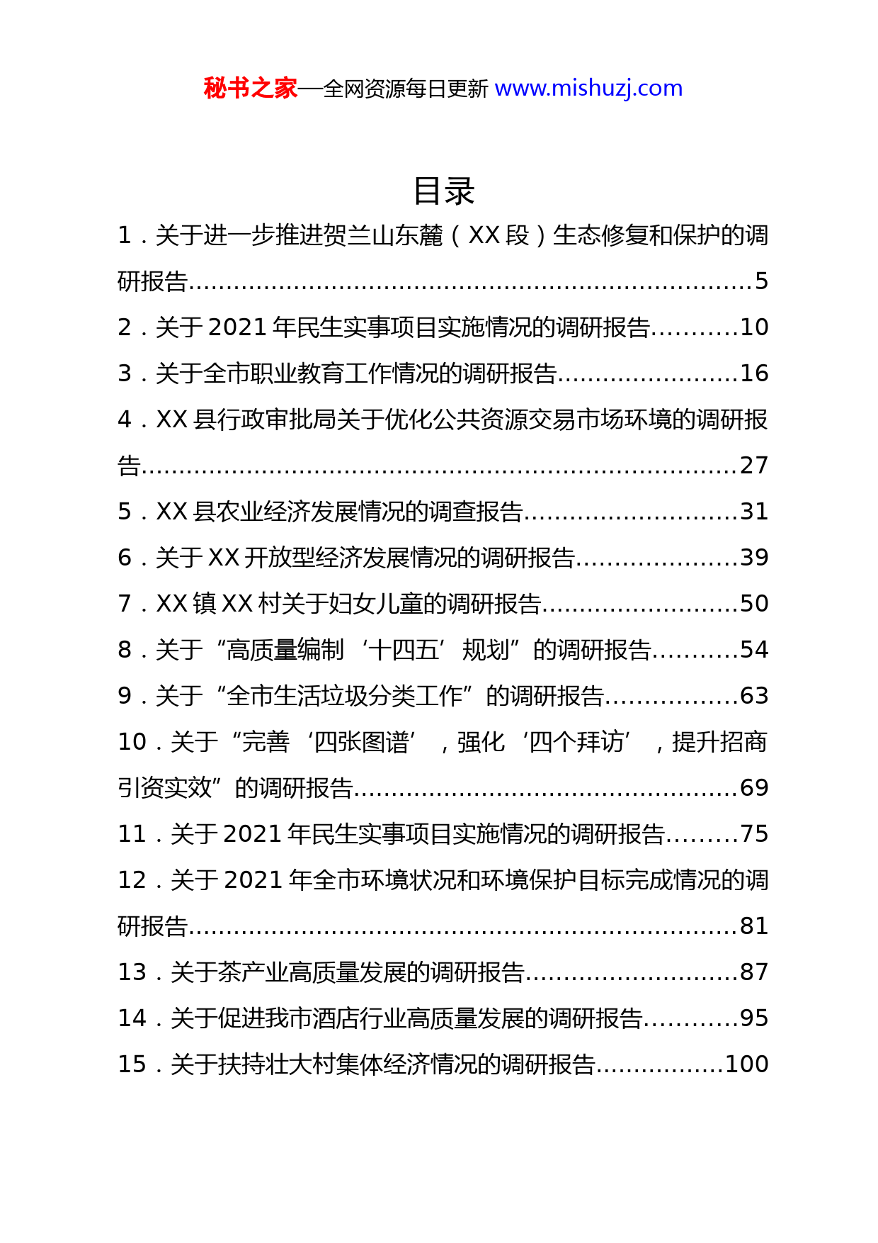 秘书之家—全网资源每日更新www.mishuzj.com目录1.关于进一步推进贺兰山东麓(XX段)生态修复和保护的调研报告...........................................................................52.关于2021年民生实事项目实施情况的调研报告...........103.关于全市职业教育工作情况的调研报告........................164.XX县行政审批局关于优化公共资源交易市场环境的调研报告...............................................................................275.XX县农业经济发展情况的调查报告............................316.关于XX开放型经济发展情况的调研报告.....................397.XX镇XX村关于妇女儿童的调研报告..........................508.关于“高质量编制‘十四五’规划”的调研报告...........549.关于“全市生活垃圾分类工作”的调研报告.................6310.关于“完善‘四张图谱’,强化‘四个拜访’,提升招商引资实效”的调研报告...................................................6911.关于2021年民生实事项目实施情况的调研报告.........7512.关于2021年全市环境状况和环境保护目标完成情况的调研报告.........................................................................8113.关于茶产业高质量发展的调研报告............................8714.关于促进我市酒店行业高质量发展的调研报告............9515.关于扶持壮大村集体经济情况的调研报告.................100秘书之家—全网资源每日更新www.mishuzj.com16.关于规范行政执法优化法治化营商环境的调研报告....10517.关于集聚科技资源提升科技创新能力的调研报告.......12618.关于加强红色旅游资源保护与利用工作情况的调研报告................................................................................14319.关于加强乡村振兴战略中村干部队伍建设的调研报告.14620.关于XX街道城乡发展工作的调研报告....................15221.关于进一步优化营商环境的调研报告.......................15922.关于禁毒工作情况的调研报告................................16523.关于民宿产业高质量发展的调研报告.......................17424.关于XX市全域旅游发展探索调研报告....................18225.关于XX市“三上”企业研发投入统计情况的调研报告................................................................................19626.关于全市国有资产管理情况的调研报告....................19927.关于全市旅游康养产业发展情况的调研报告.............20828.关于全市人力资源市场建设情况的调研报告.............21729.关于全市现代职业教育高质量发展情况的调研报告....22230.关于全县社会治理工作的调研报告..........................23231.关于全县义务教育优质均衡发展创建工作情况的调研报告................................................................................24632.关于全州国土空间规划编制进展情况的调研报告.......254秘书之家—全网资源每日更新www.mishuzj.com33.关于深入推进教育督导体制机制改革的调研报告.......26034.关于市商务局局长XXX同志履职情况的调研报告......26735.关于市委政协工作会议精神贯彻落实情况的调研报告.27336.关于提高市场主体活力的调研报告..........................28237.关于同山烧产业高质量发展的调研报告....................28838.关于推进开发园区提档升级的调研报告....................29539.关于XXX区文旅体局宣传文化队伍建设的调研报告...30440.关于网格化服务管理工作情况的调研报告.................30741.关于我市节能降耗工作情况的调研报告....................33242.关于我市就业工作开展情况的调研报告....................34043.关于我市农村饮水安全工作的调研报告....................35044.关于我市侨务工作情况的调研报告..........................36345.关于我市数字乡村建设的调研报告..........................37046.关于我市先进制造业发展情况的调研报告.................37547.关于我市乡村产业振兴发展情况的调研报告.............38848.关于我市饮用水水源地保护情况的调研报告.............39849.关于我市优化营商环境工作情况的调研报告调研报告.40150.关于我县村级集体经济发展的调研报告....................41551.关于县政府2021年度法治政府建设情况的调研报告.42452.关于新冠肺炎疫情常态化防控工作情况的调研报告....434秘书之家—全网资源每日更新www.mishuzj.com53.关于引聚高层次创新创业人才的调研报告.................44254.关于营商环境现状与问题的调研报告.......................44855.关于优化营商环境工作的调研报告..........................45556.关于制造业高质量发展的调研报告..........................46057.关于做好防止返贫动态监测和帮扶工作的调研报告....46758.关于XXX区贯彻实施《中华人民共和国社区矫正法》情况的调研报告.............................................................47659.XXX市XXX区人大常委会关于退役军人就业创业工作情况的调研报告.............................................................48360.关于疫情防控常态化下市场主体发展情况调研报告....48961.XXX市人大常委会教科文卫工委关于常态化疫情防控工作情况的调研报告..........................................................49862.XXX市人大常委会民宗外侨工委关于XXX市2022年宗教工作开展情况的调研报告...........................................50463.关于2021年度市级预算执行和其他财政收支审计查出问题整改情况的调研报告.................................................51064.XXX市人大常委会预算工